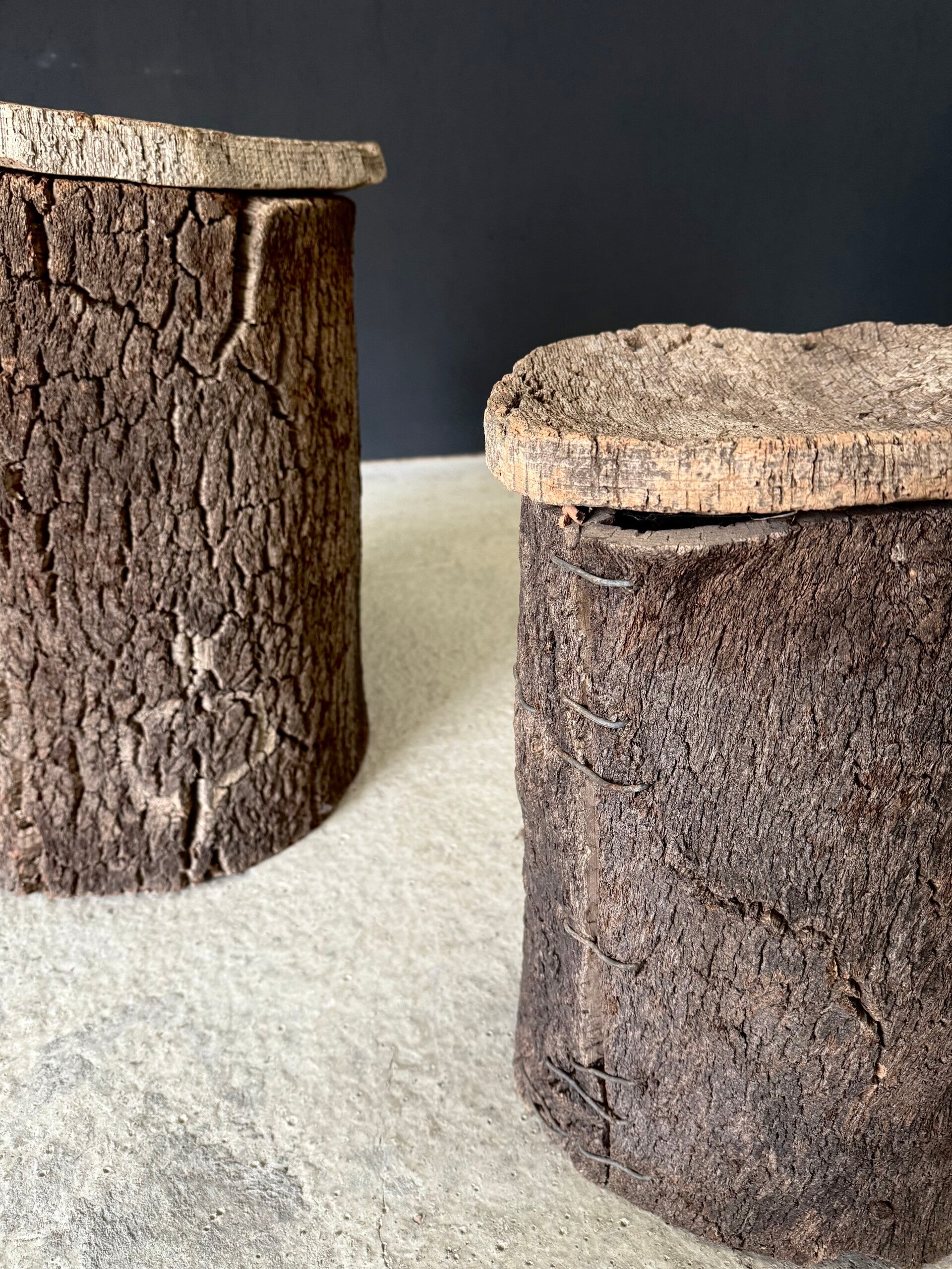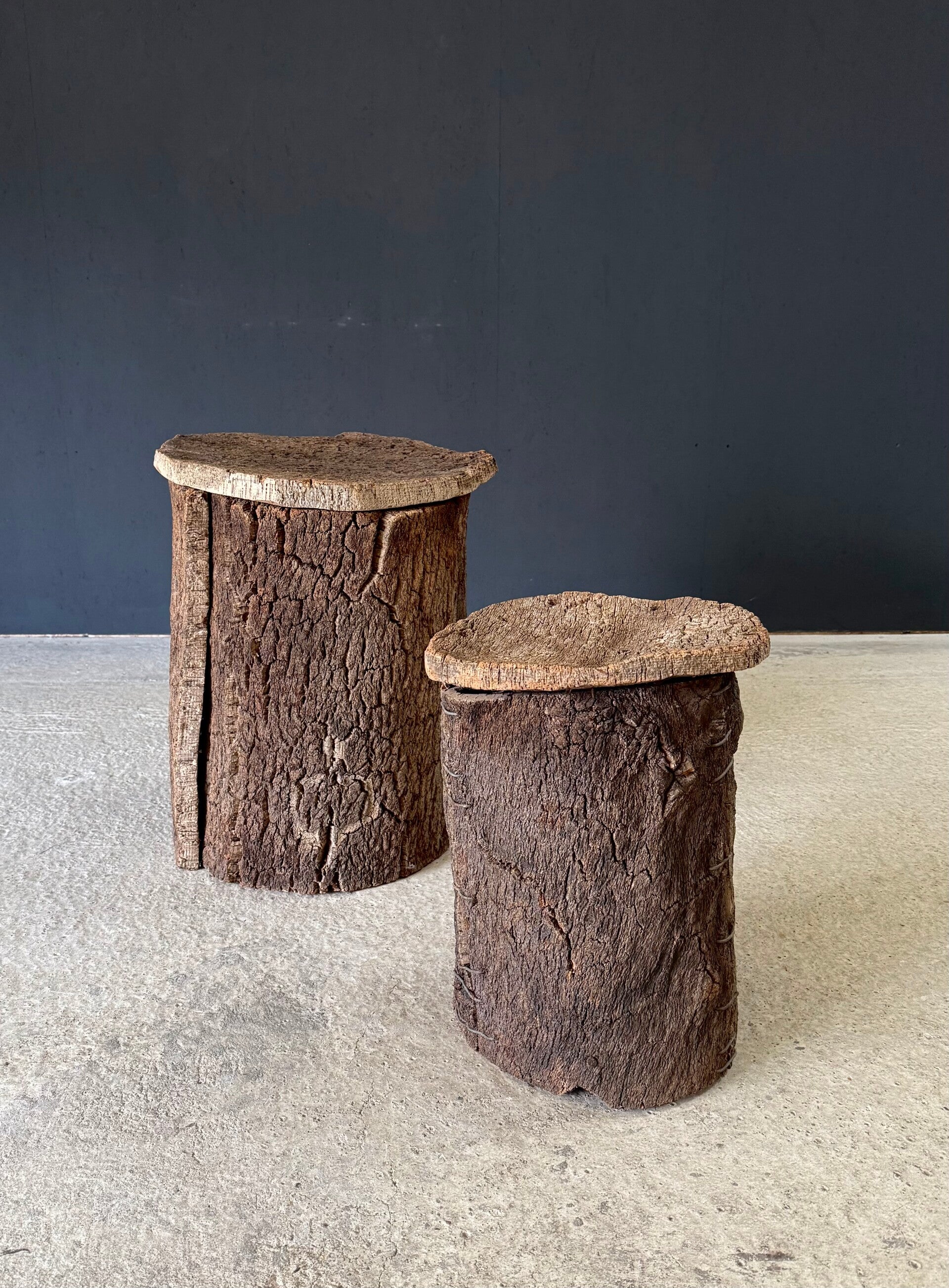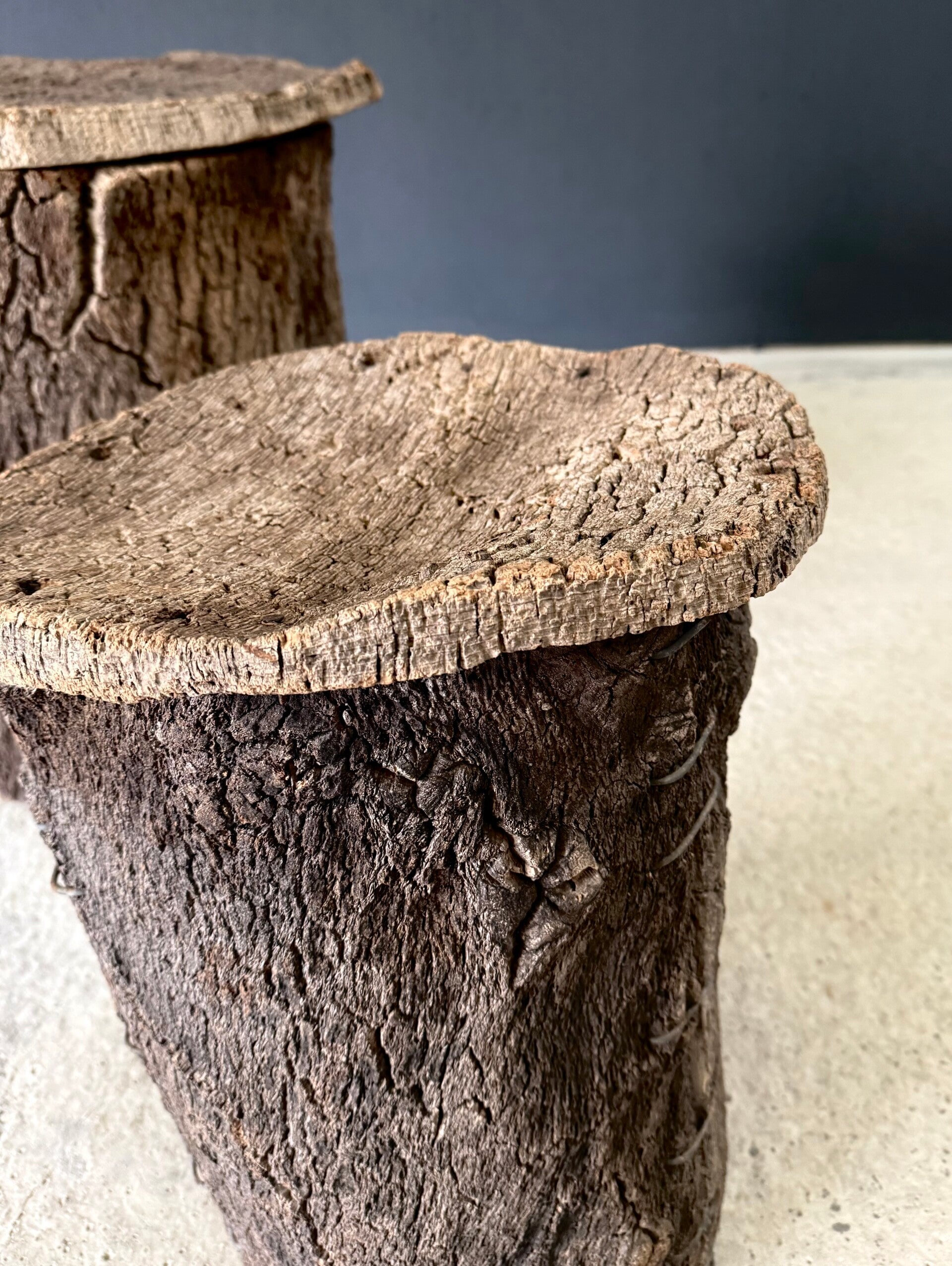 Vintage Artisan Made Handcrafted Cork Side Table set of 2. Made in Portugal, early 20th Century, 1910's / 20's period. All cork tree bark set together with metal and wooden spikes. These come in good, all original condition, with normal signs of wear from it's age and use. The larger model measures 63cm x 54cm x 51cm, the smaller version measures 48cm x 36cm x 34cm.
