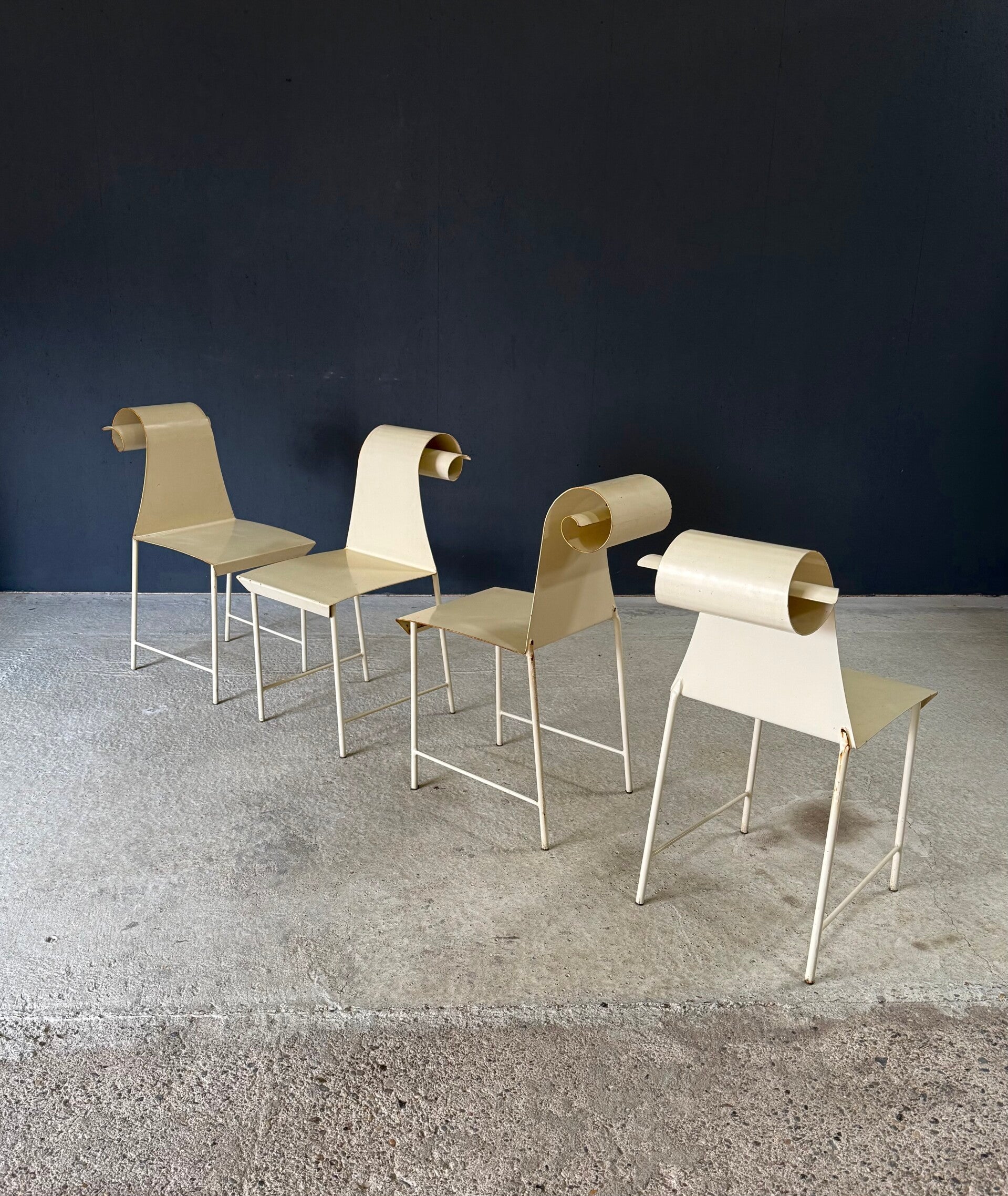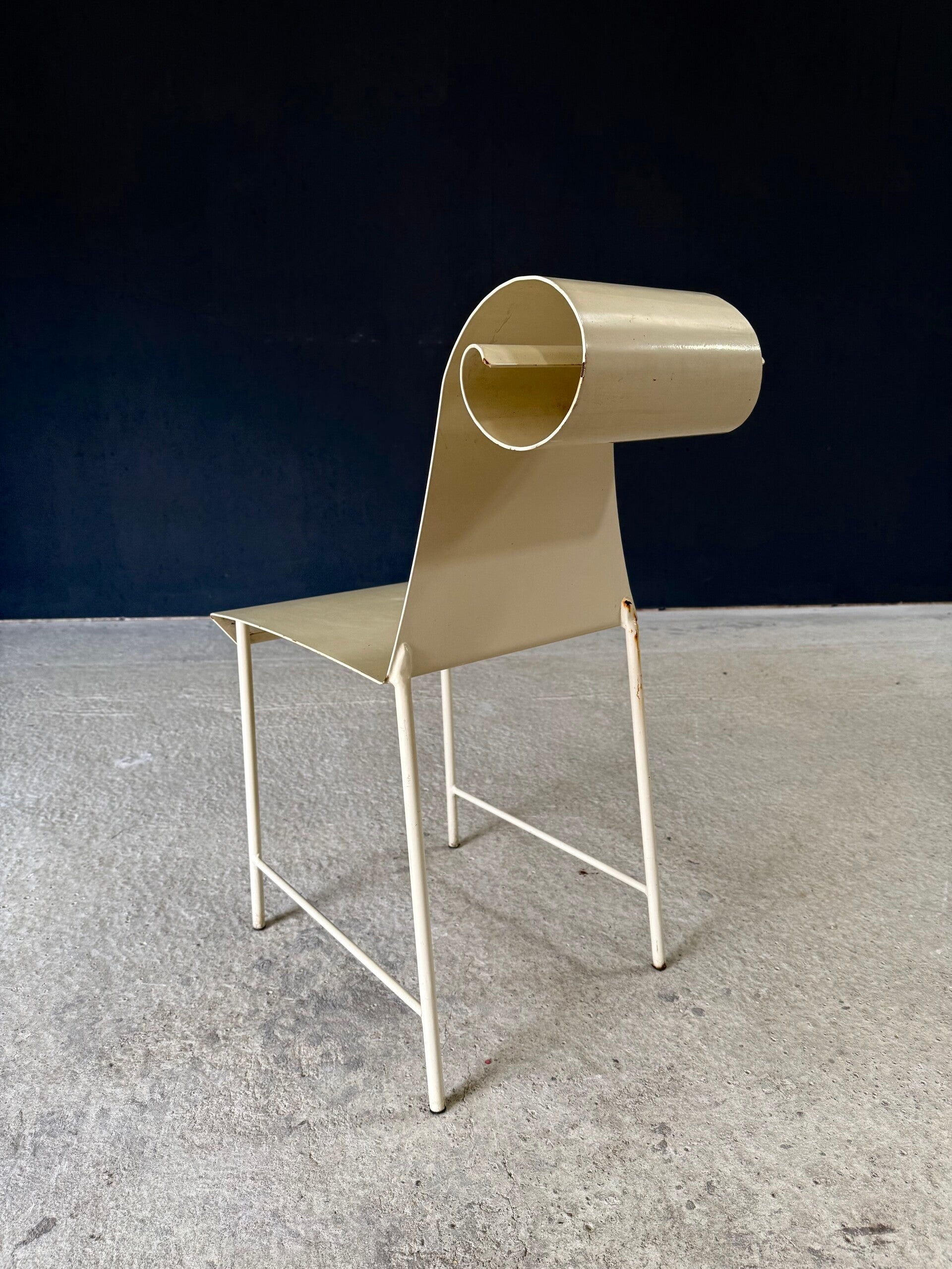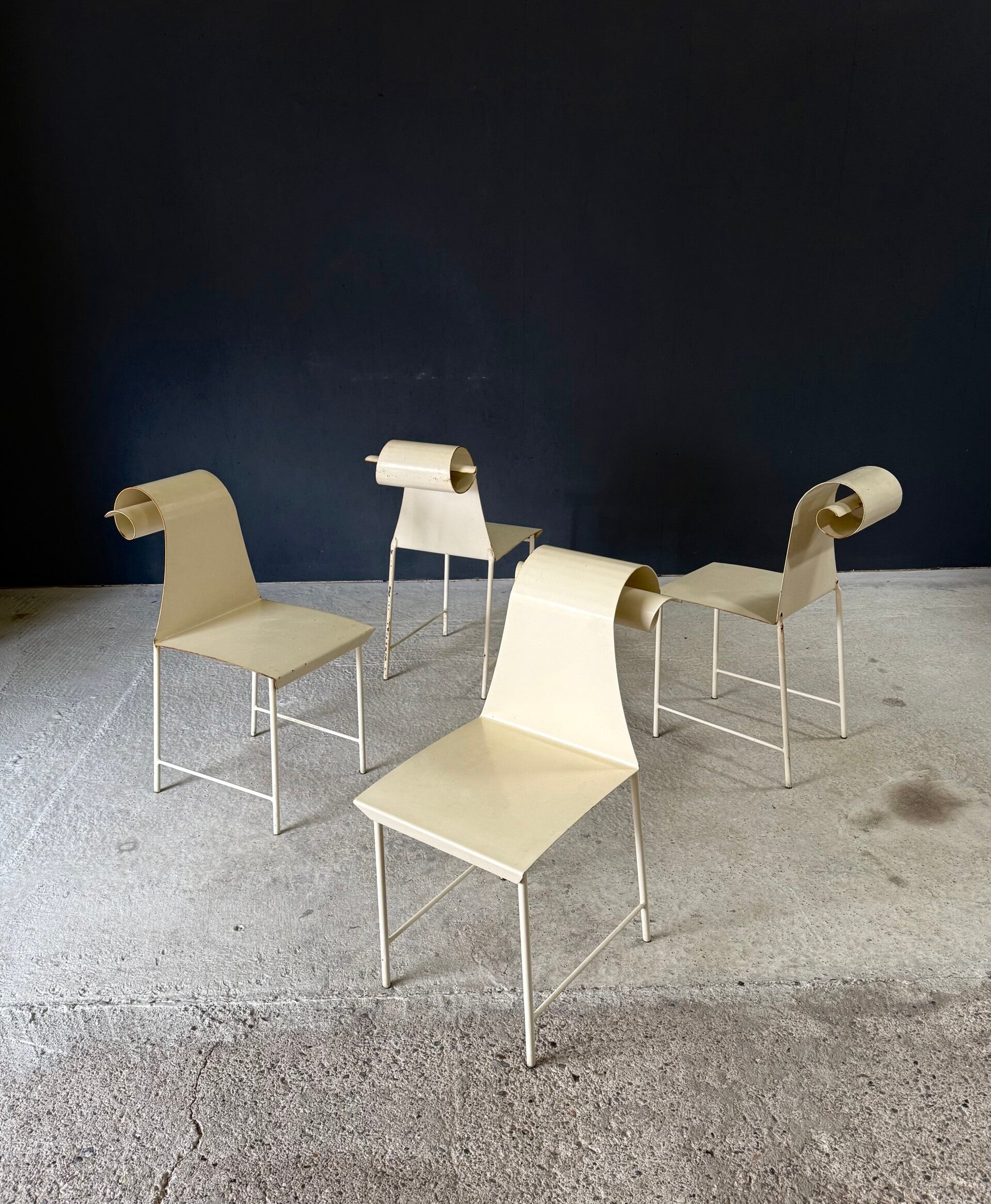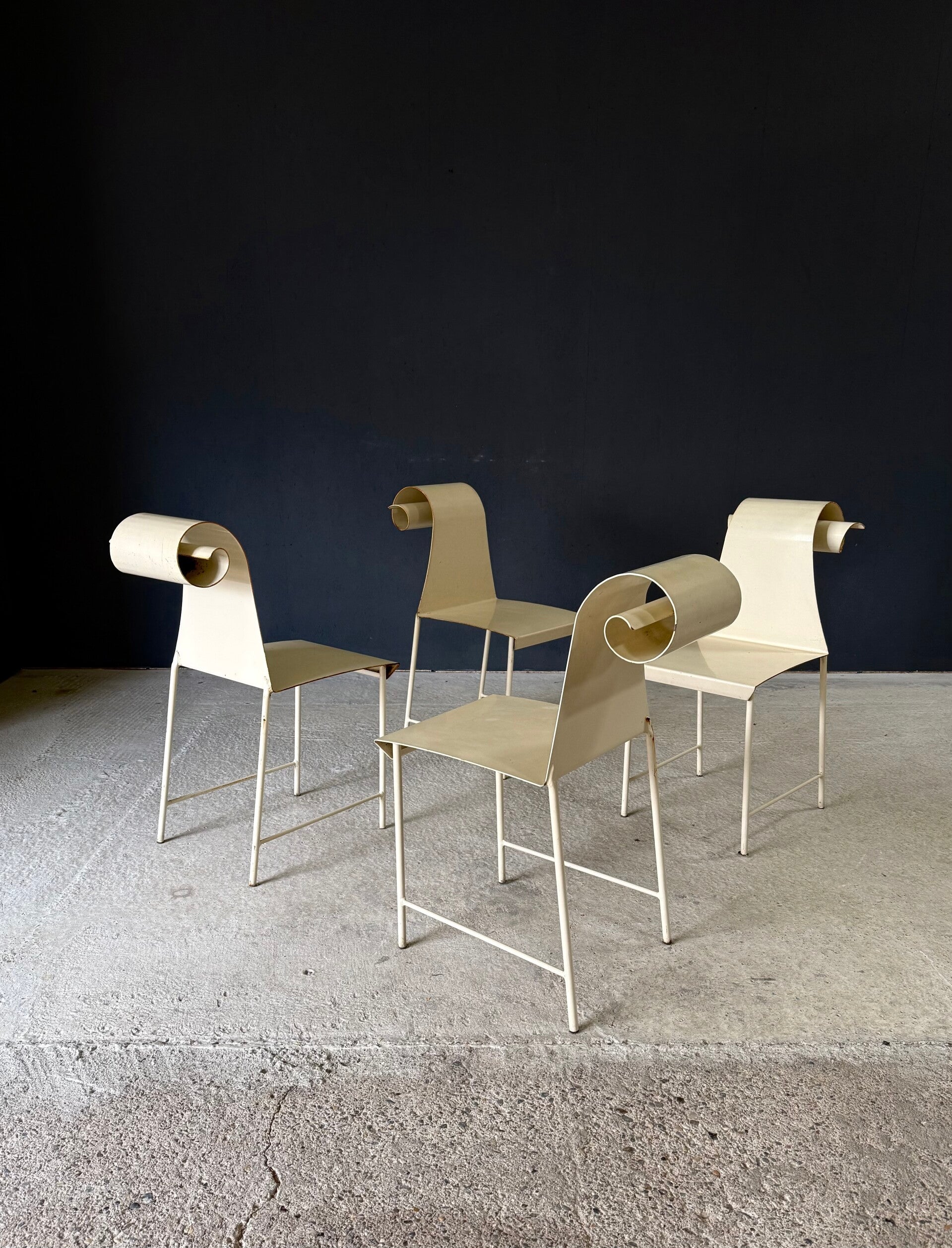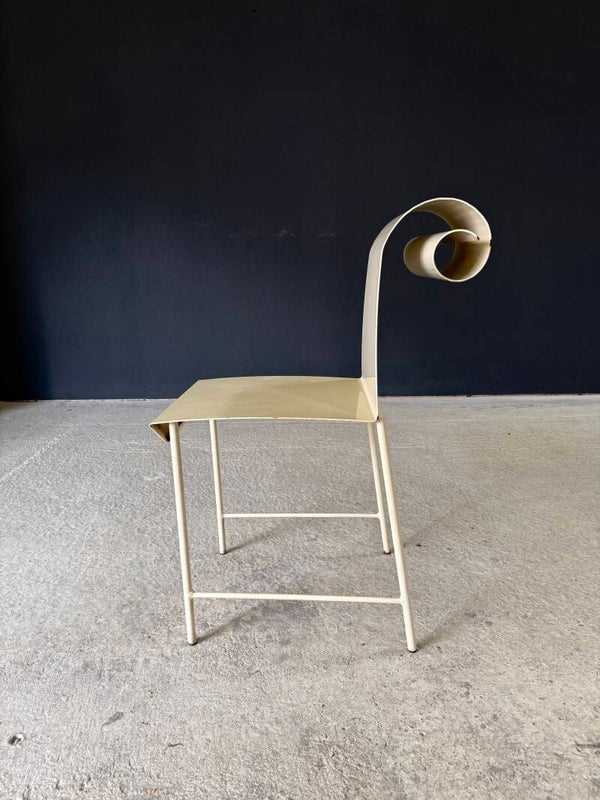 Vintage 'one of a kind' french design metal Swirl back garden chair set of 4. Made in France, 1960's period. All metal constructed garden chairs in a pale yellow. These come in good all original condition. Each has wear from it's use and age. Some rust on the borders, inside the swirl and on the legs. Each chair measures 83cm x 38cm x 56cm. Seat height measures 45cm.