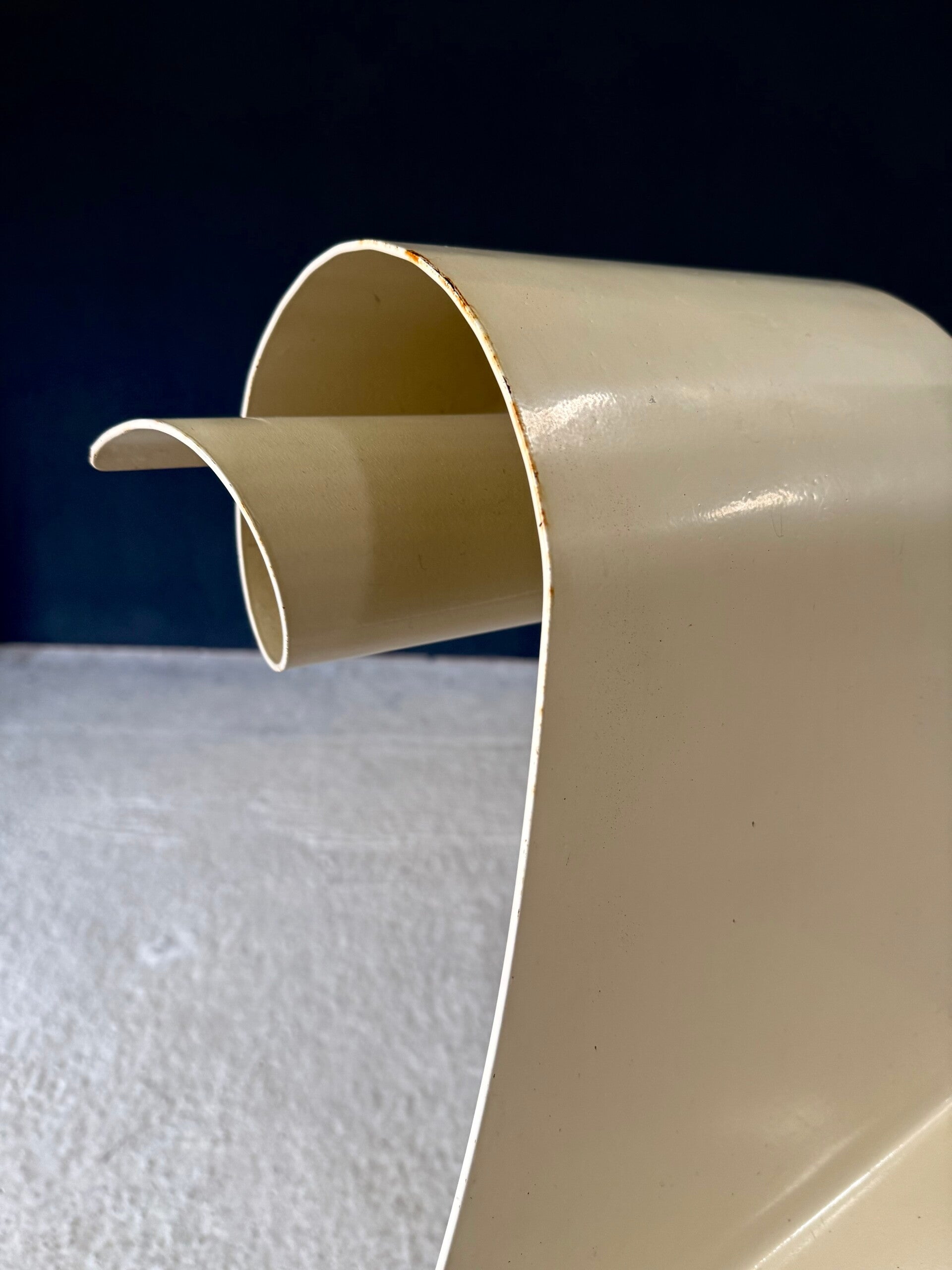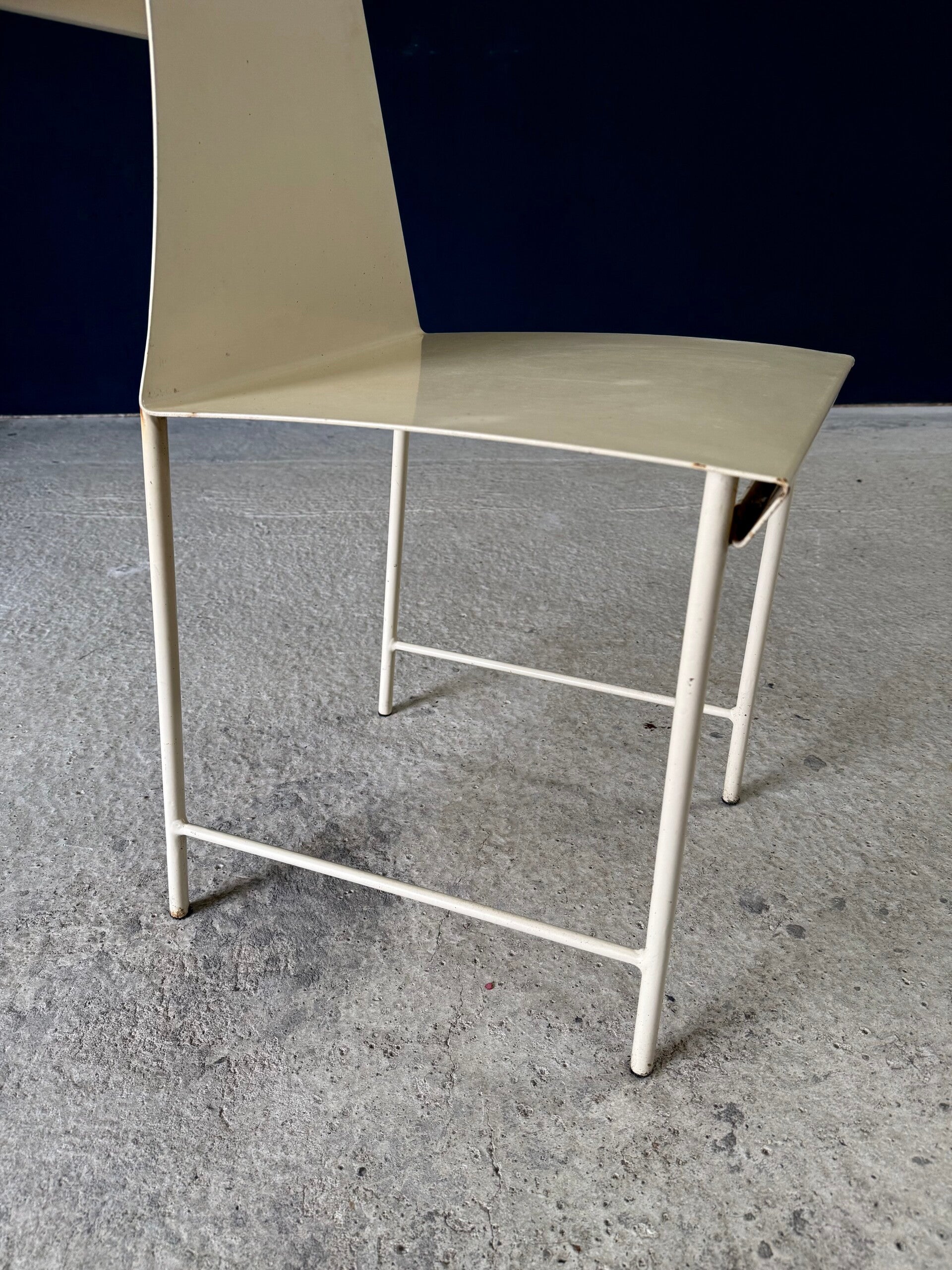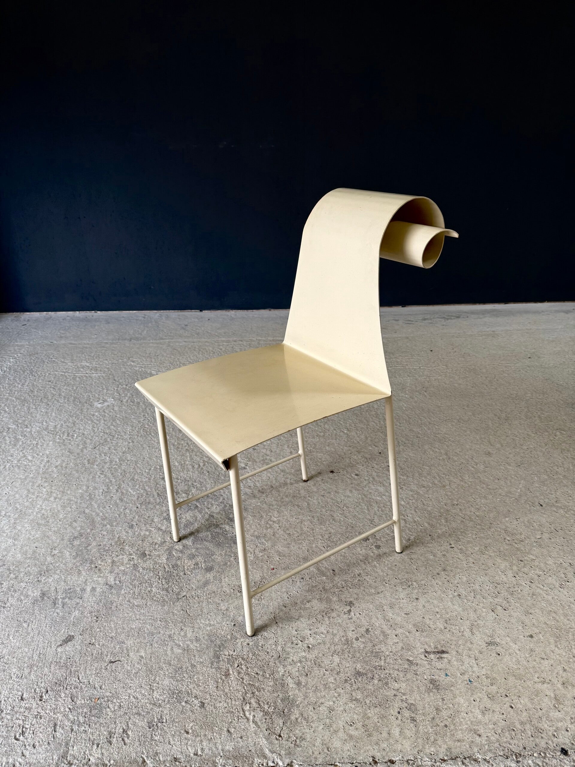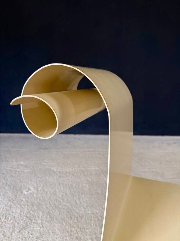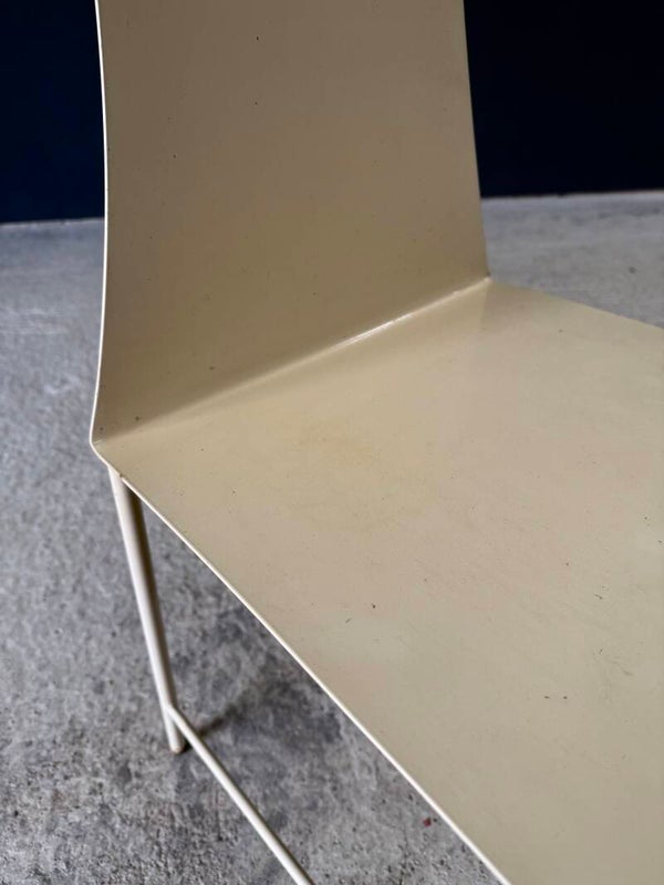 Vintage 'one of a kind' french design metal Swirl back garden chair set of 4. Made in France, 1960's period. All metal constructed garden chairs in a pale yellow. These come in good all original condition. Each has wear from it's use and age. Some rust on the borders, inside the swirl and on the legs. Each chair measures 83cm x 38cm x 56cm. Seat height measures 45cm.