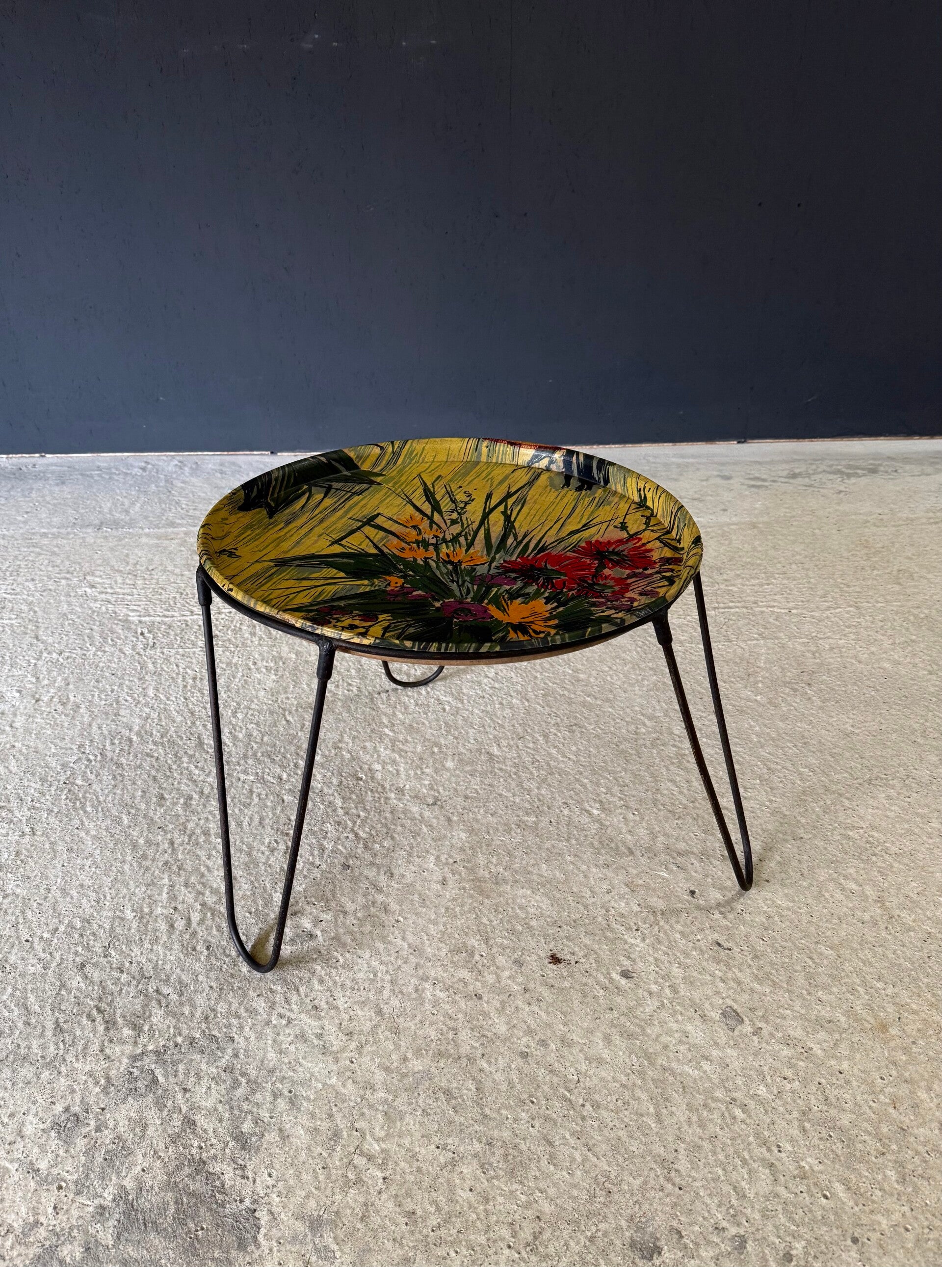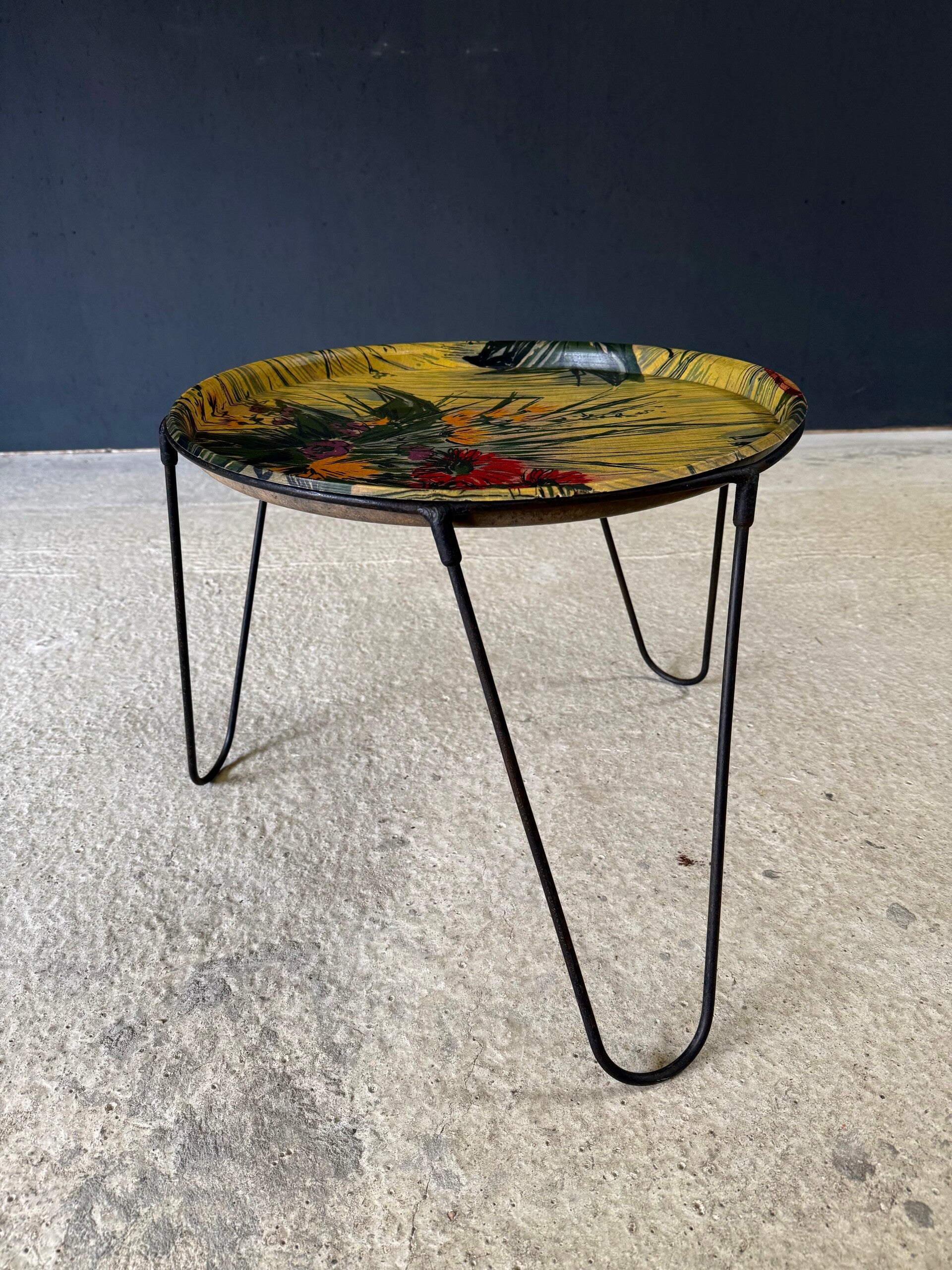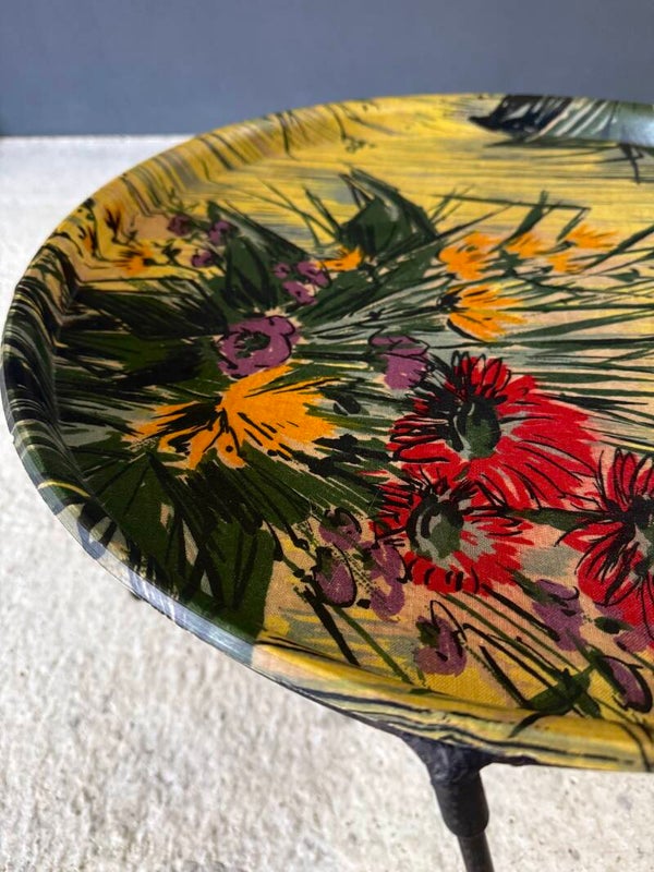 Vintage Midcentury French Design Tripod Tray Side Table. Made in France, 1950's period. Metal tripod base with ring that holds the fiberglass flower printed tray. This comes in good, all original condition. Has wear from it's age and use. Measures 42cm x 63cm x 63cm.