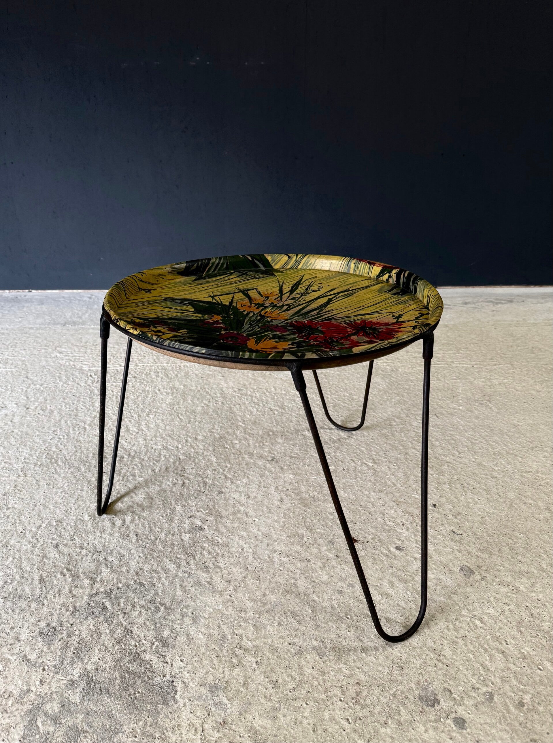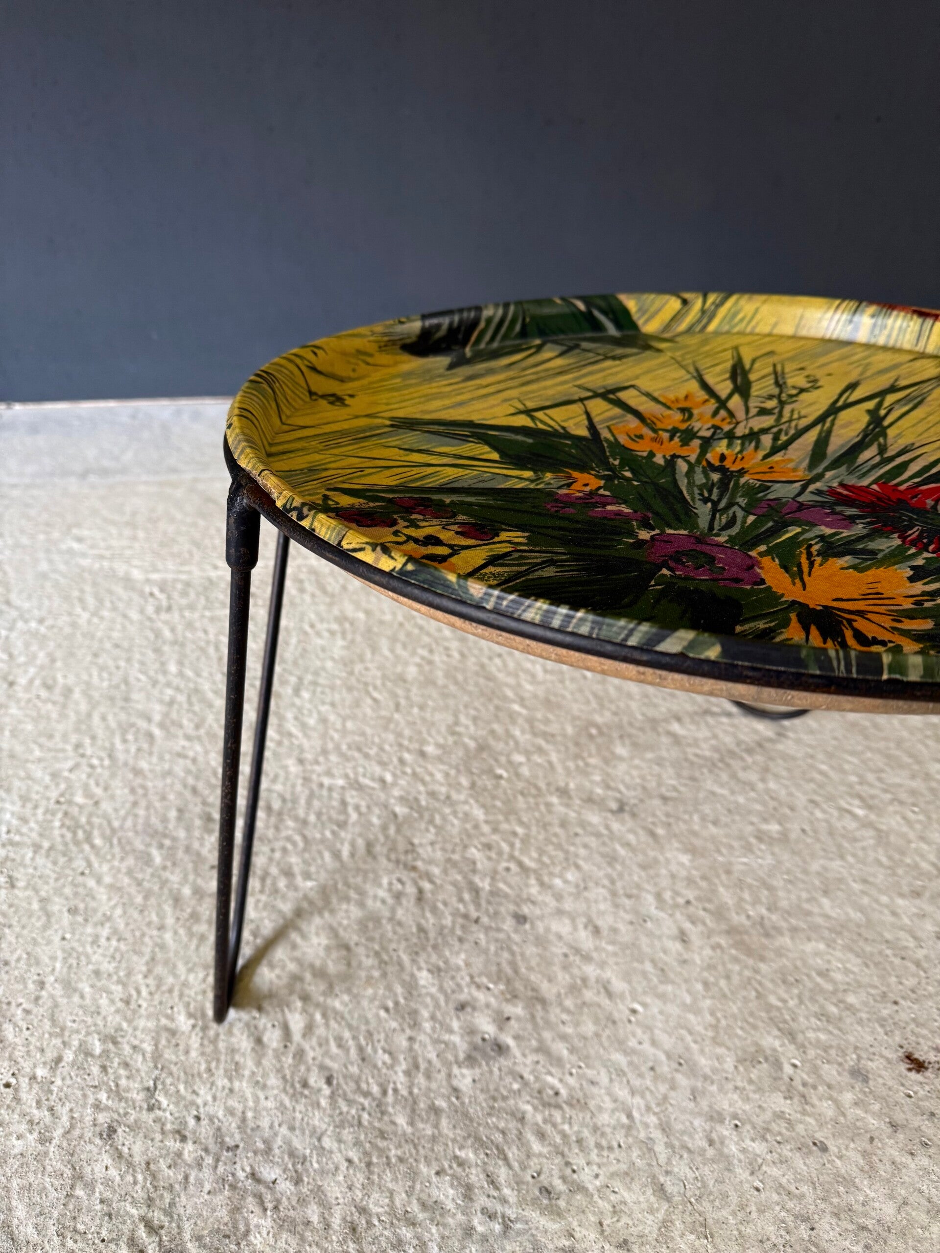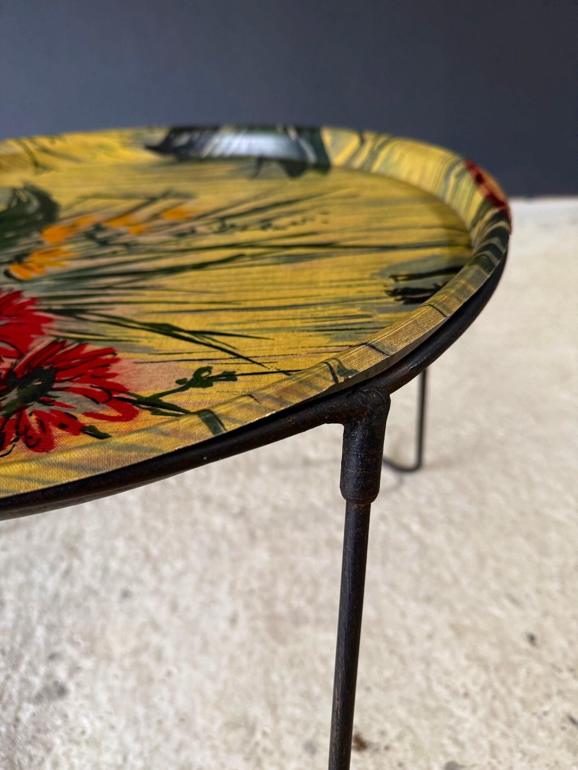 Vintage Midcentury French Design Tripod Tray Side Table. Made in France, 1950's period. Metal tripod base with ring that holds the fiberglass flower printed tray. This comes in good, all original condition. Has wear from it's age and use. Measures 42cm x 63cm x 63cm.