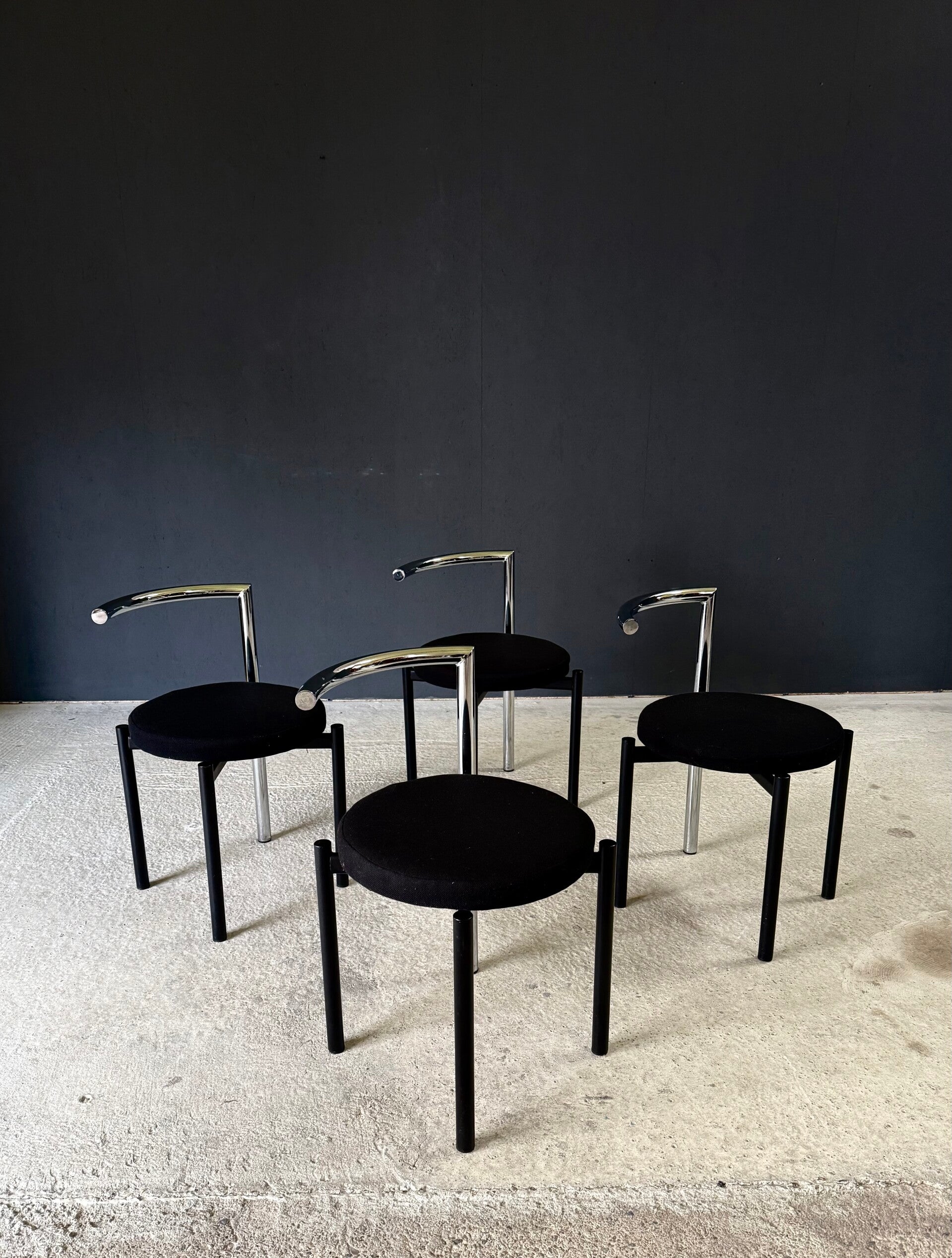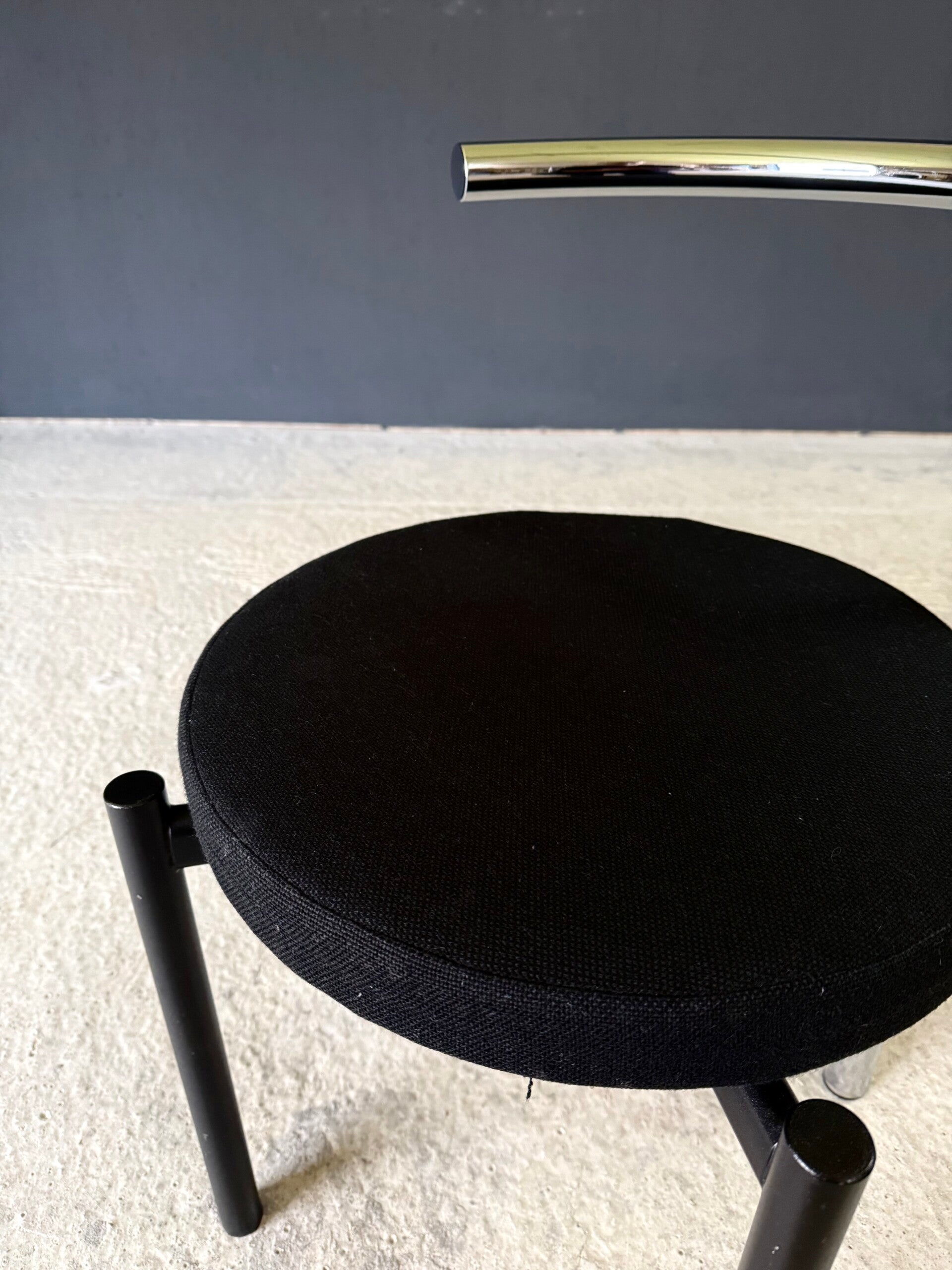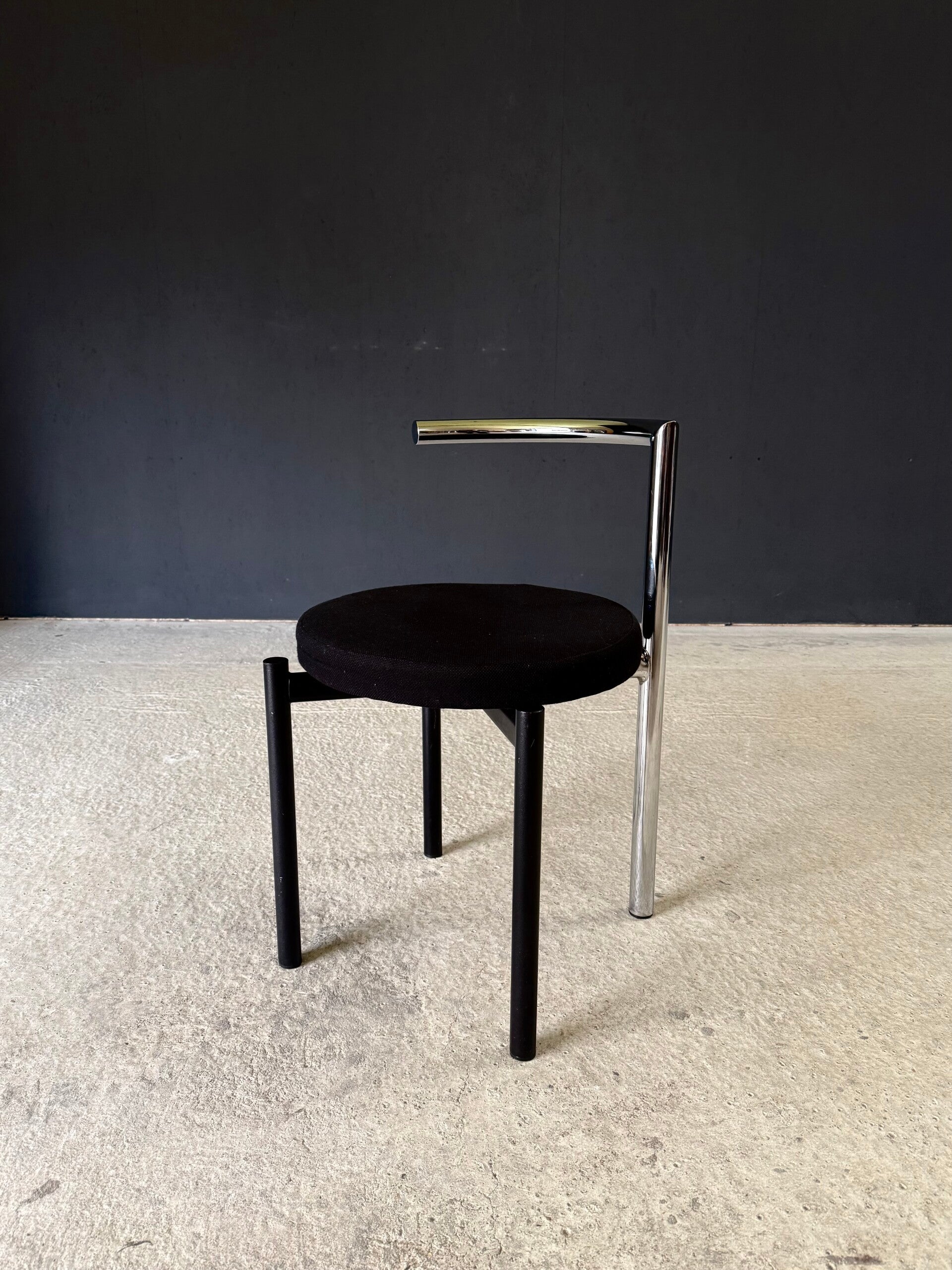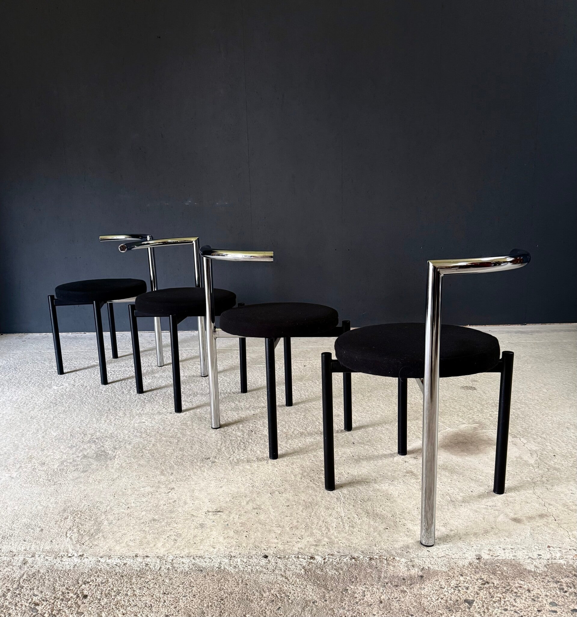Postmodern Italian Design Dining Chair set of 4. Made in Italy, 1980's period. Black metal base with chrome backrest and black fabric seat. These chairs have one leg, which also forms the back rest, in chrome, all other are in matt black lacquer. These chairs are in very good, all original condition. Each measures 70cm x 44cm x 50cm. Seat height measures 45cm.