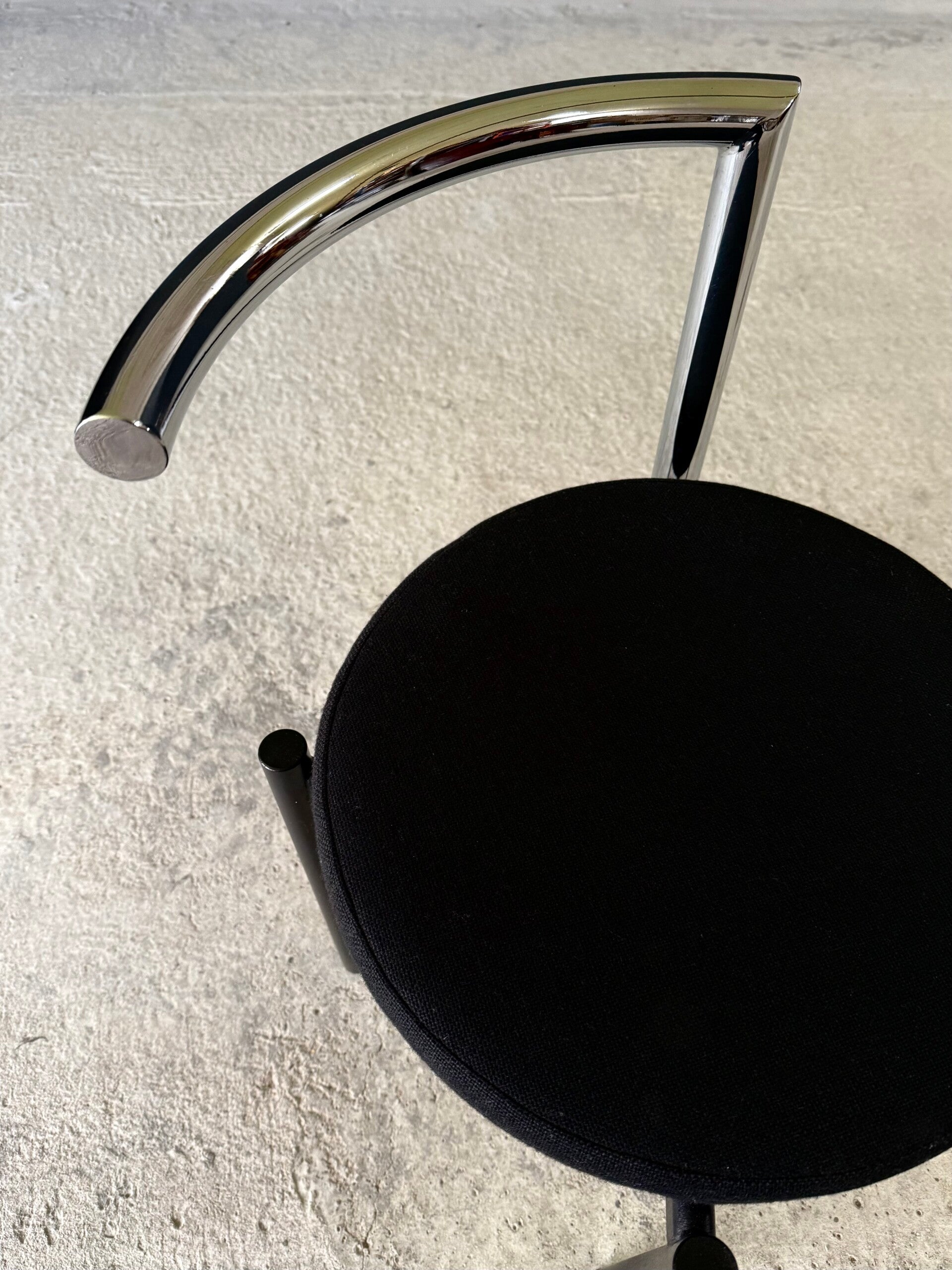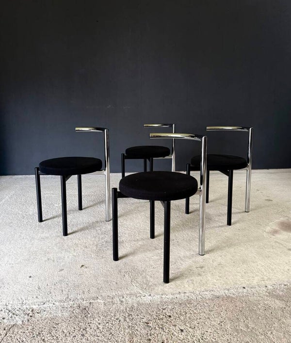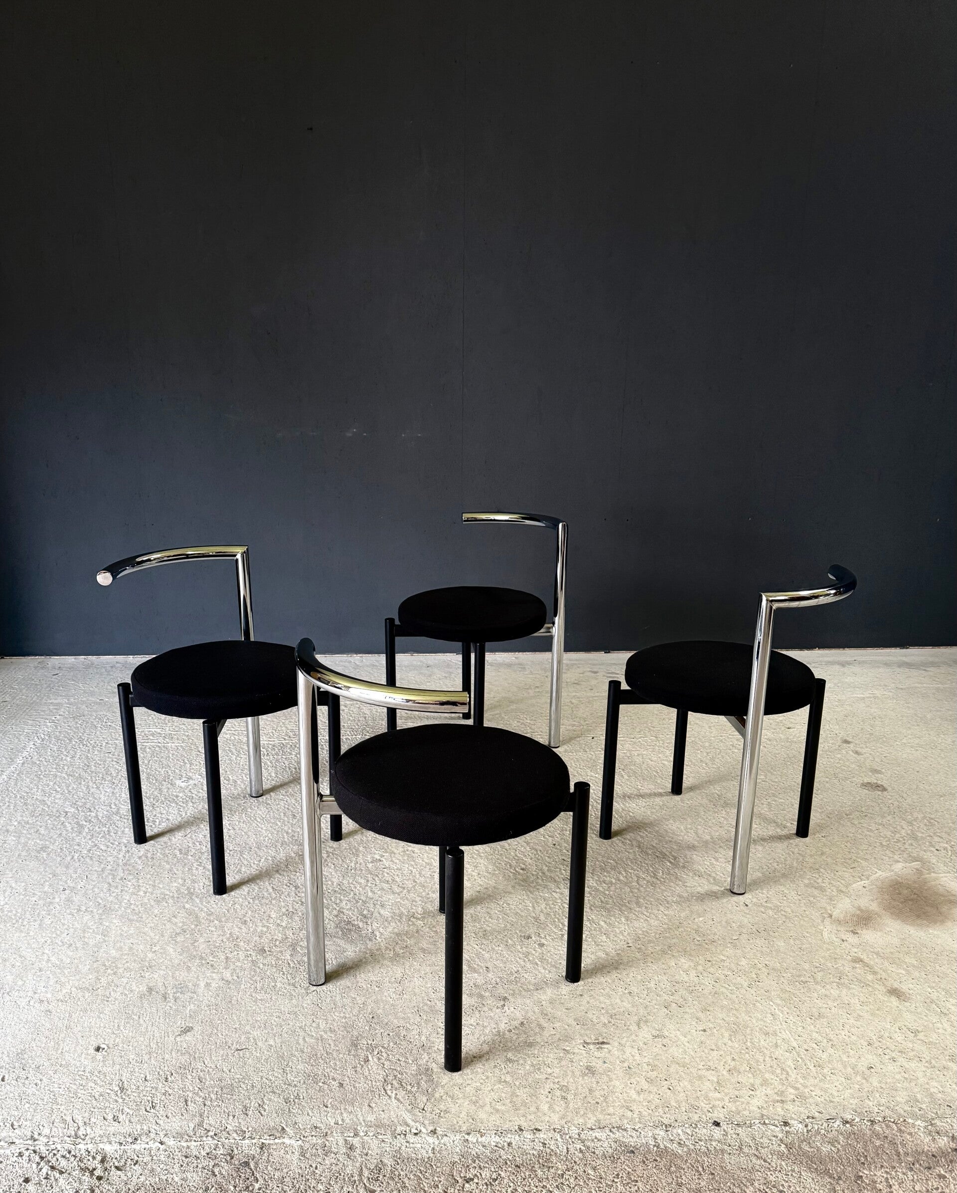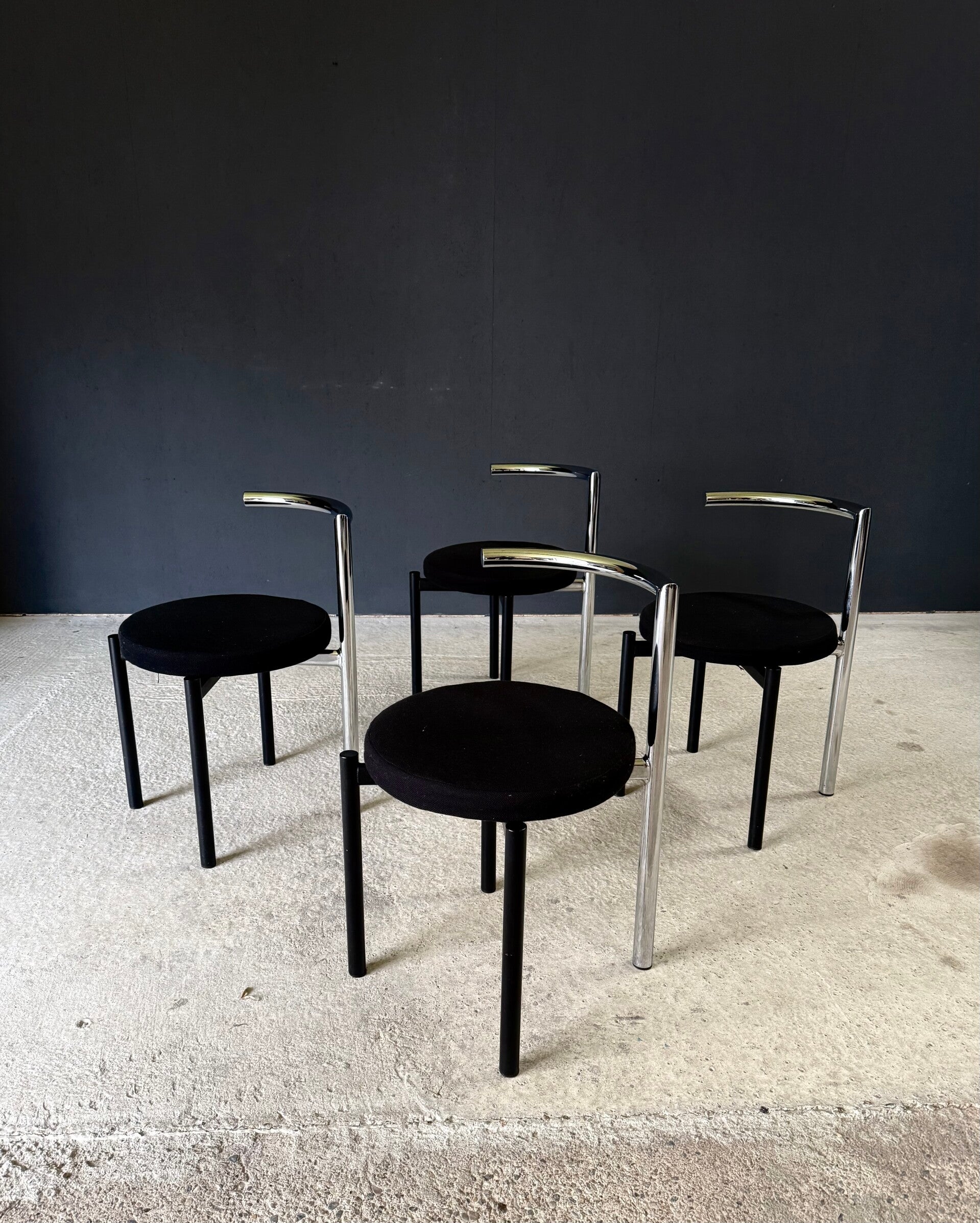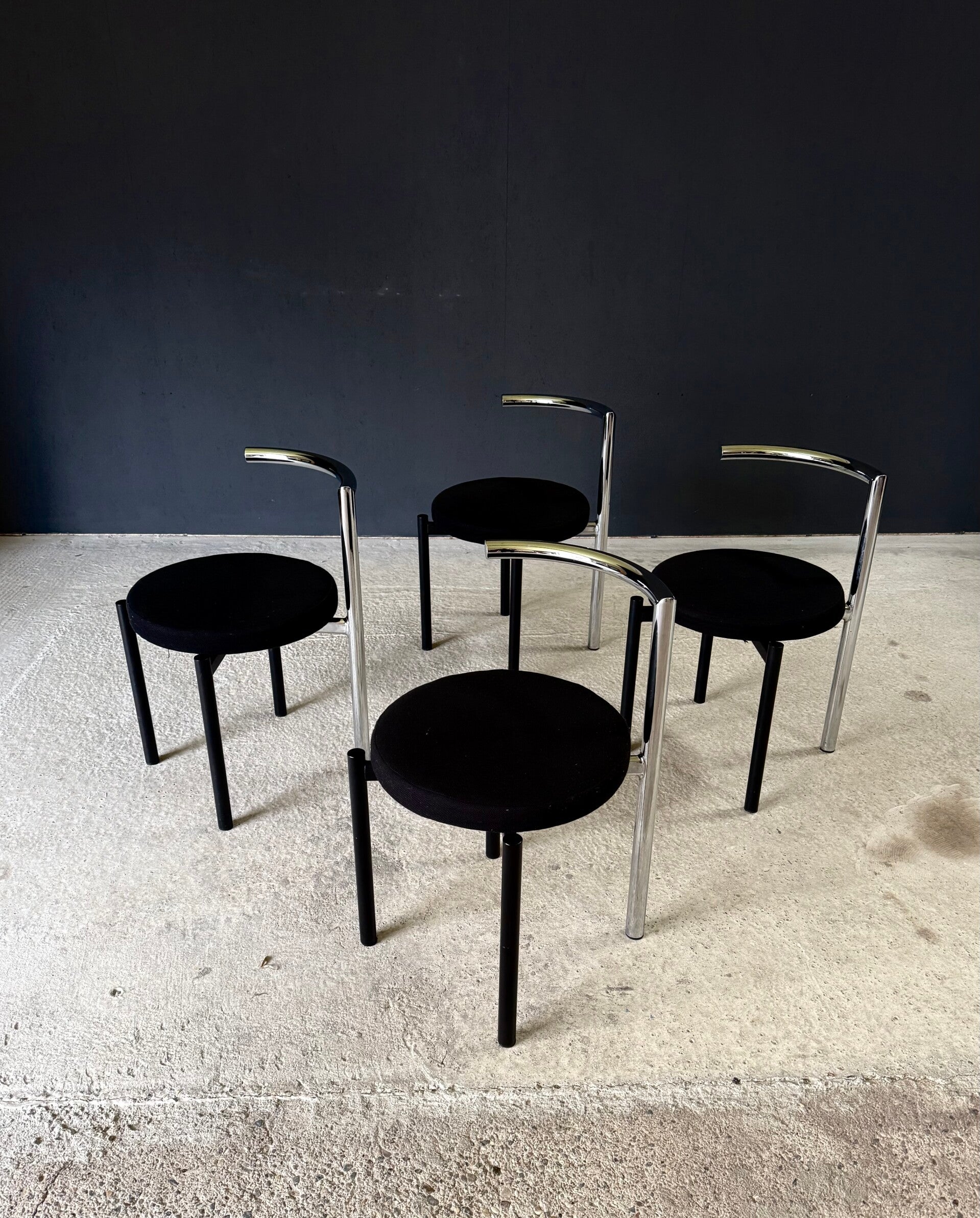 Postmodern Italian Design Dining Chair set of 4. Made in Italy, 1980's period. Black metal base with chrome backrest and black fabric seat. These chairs have one leg, which also forms the back rest, in chrome, all other are in matt black lacquer. These chairs are in very good, all original condition. Each measures 70cm x 44cm x 50cm. Seat height measures 45cm.