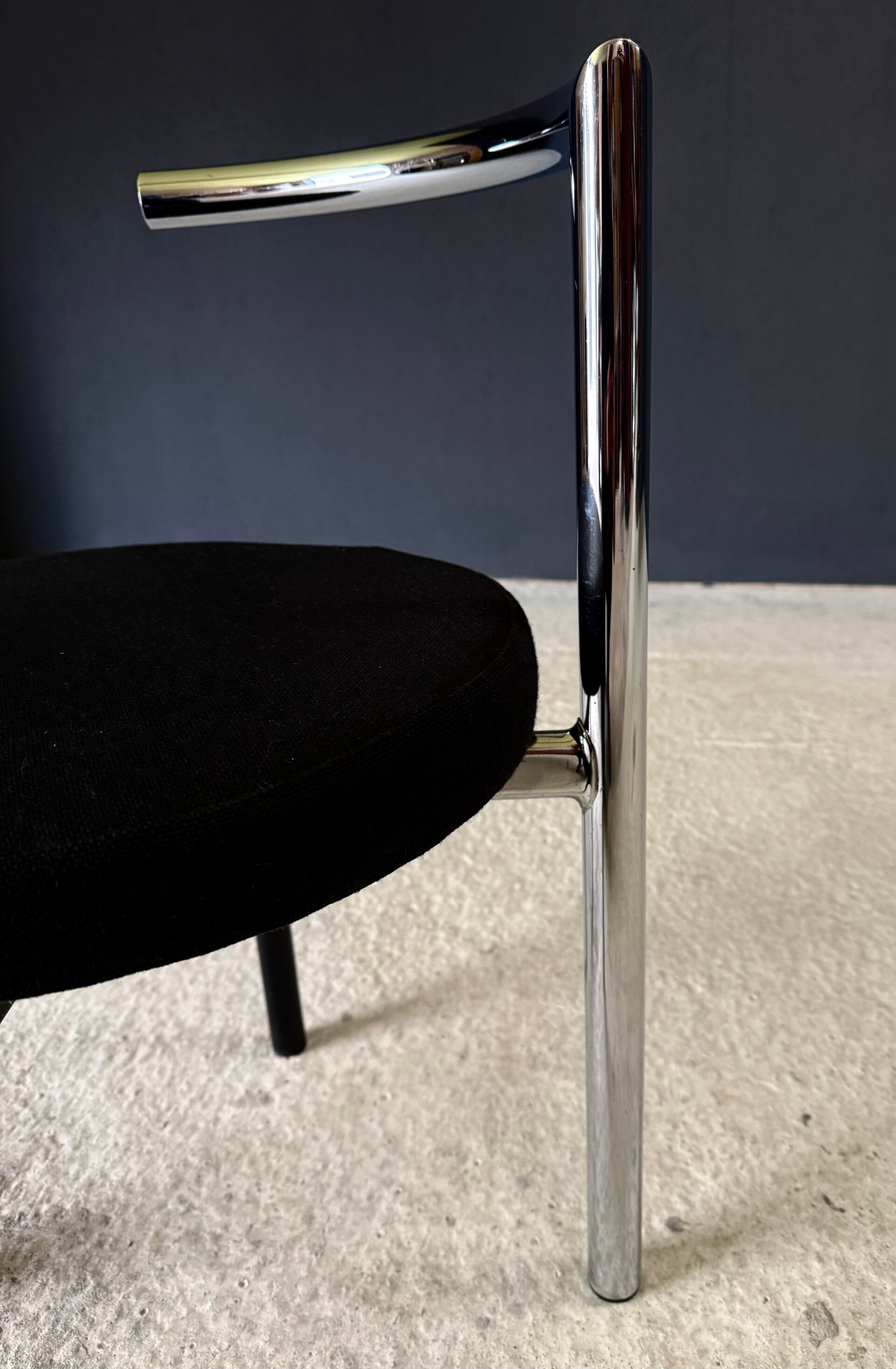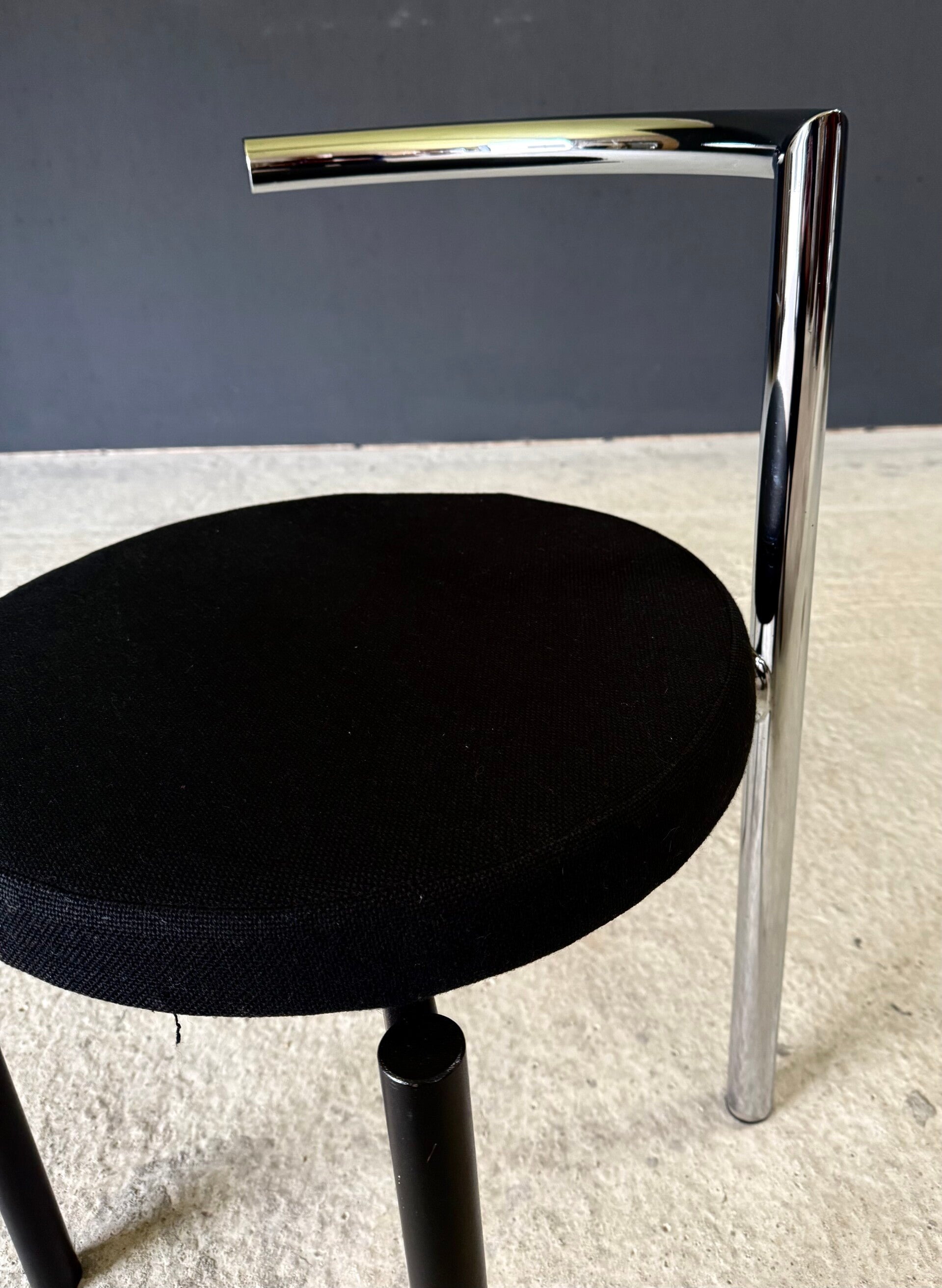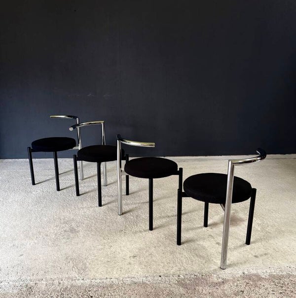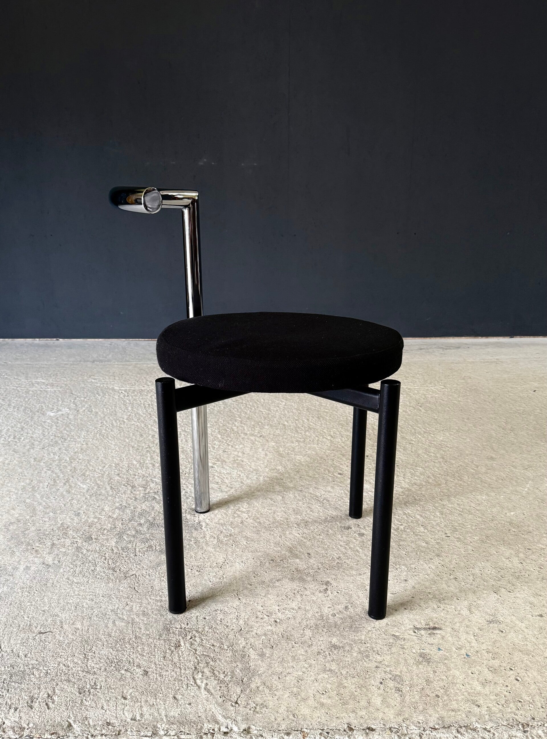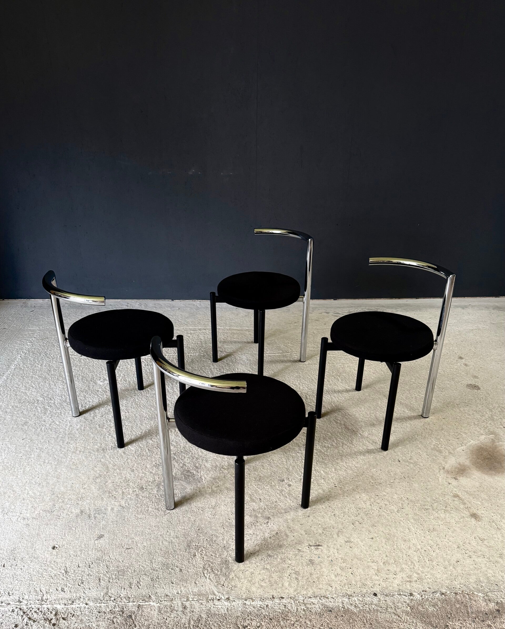 Postmodern Italian Design Dining Chair set of 4. Made in Italy, 1980's period. Black metal base with chrome backrest and black fabric seat. These chairs have one leg, which also forms the back rest, in chrome, all other are in matt black lacquer. These chairs are in very good, all original condition. Each measures 70cm x 44cm x 50cm. Seat height measures 45cm.