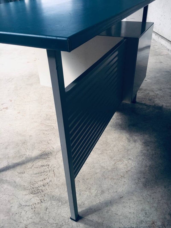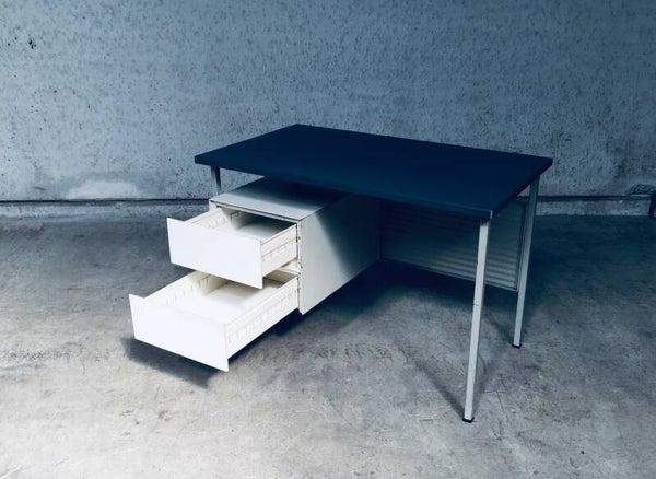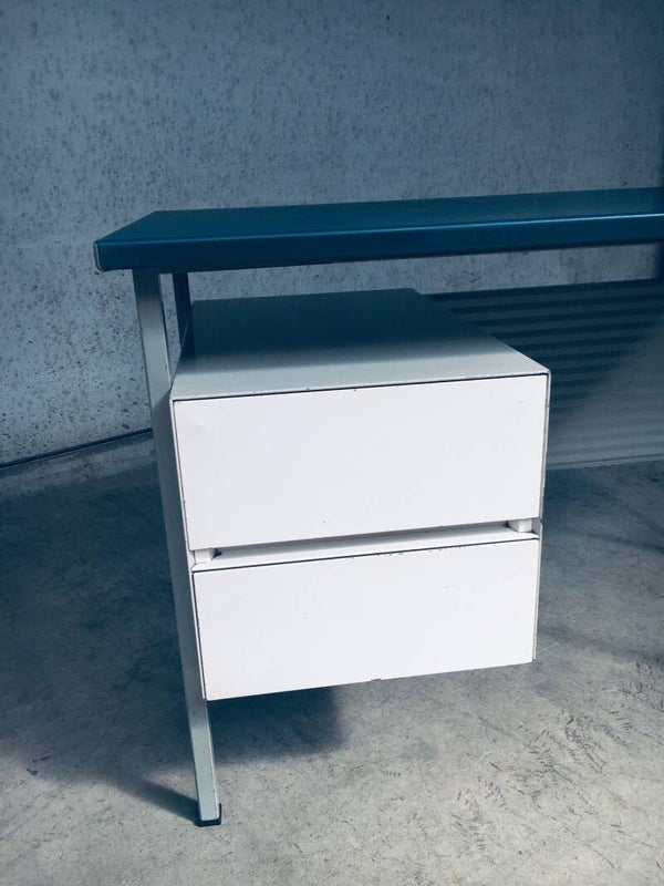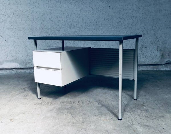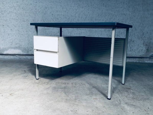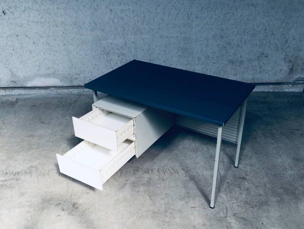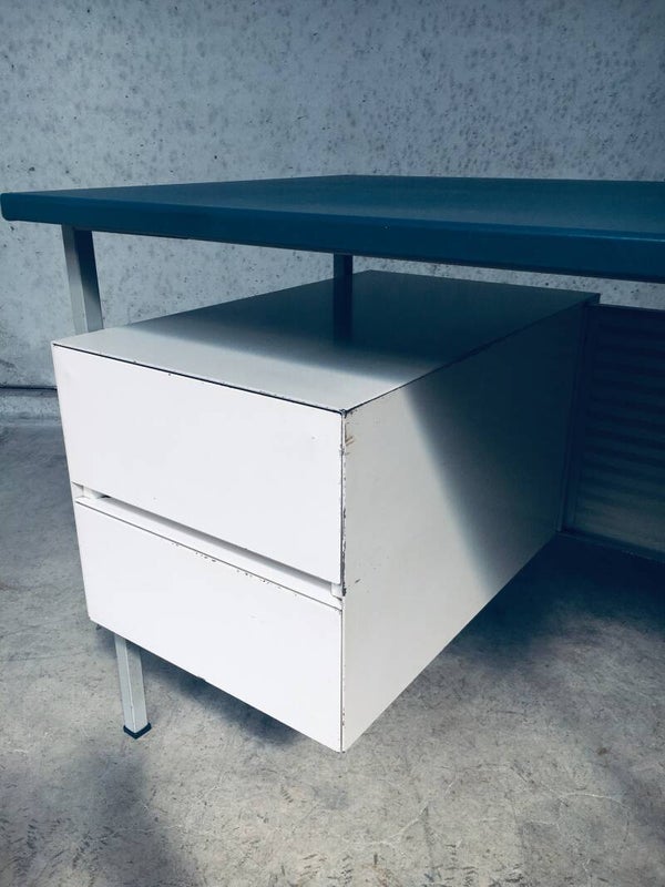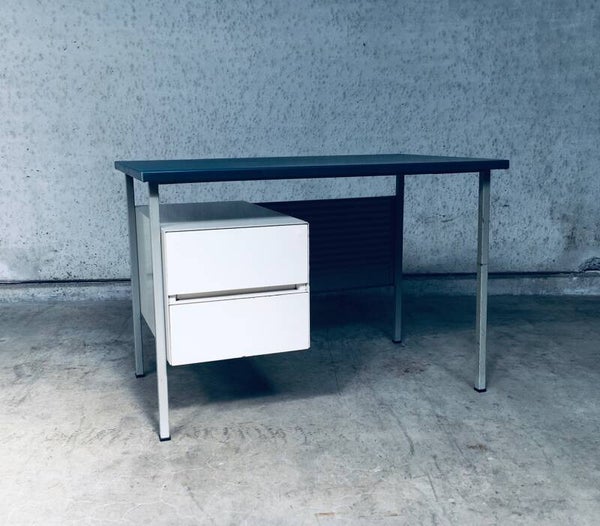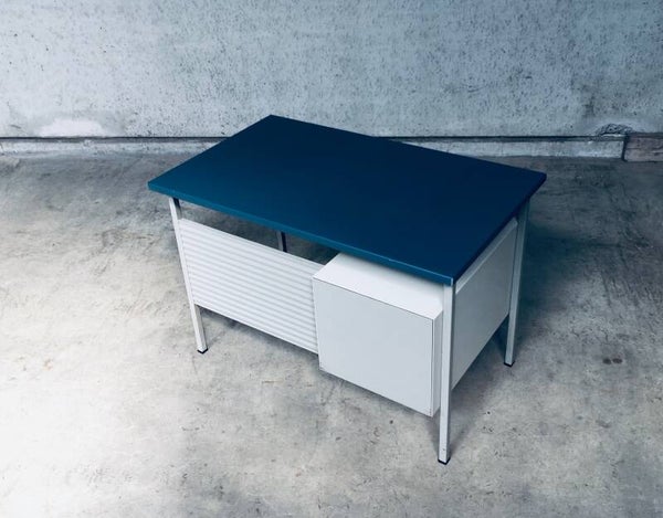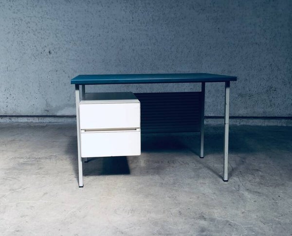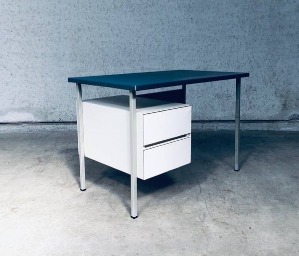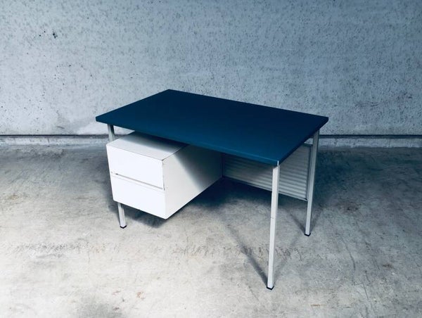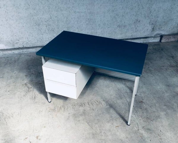 Vintage Midcentury Modern Industrial Design Small metal Desk Model 3803 by Andre Cordemeyer for Gispen, 1950's Holland. Stamped in bottom drawer. All metal writing desk with 2 drawers. Blue rubberish material coverd writing top. Handle free design drawers. All in good condition. Slight blemishes on top. And traces of age and use on drawers, and back panel. Overal in nice condition for it's age. A really nice little desk. Measures: 110cm x 65cm x 75cm.