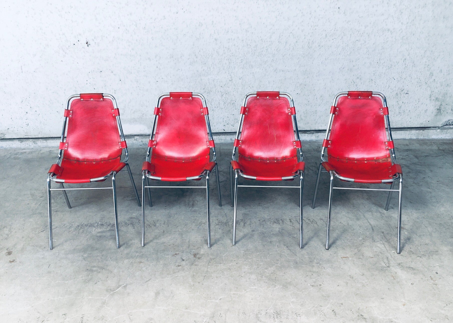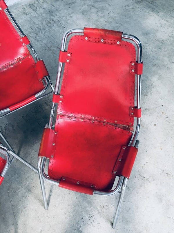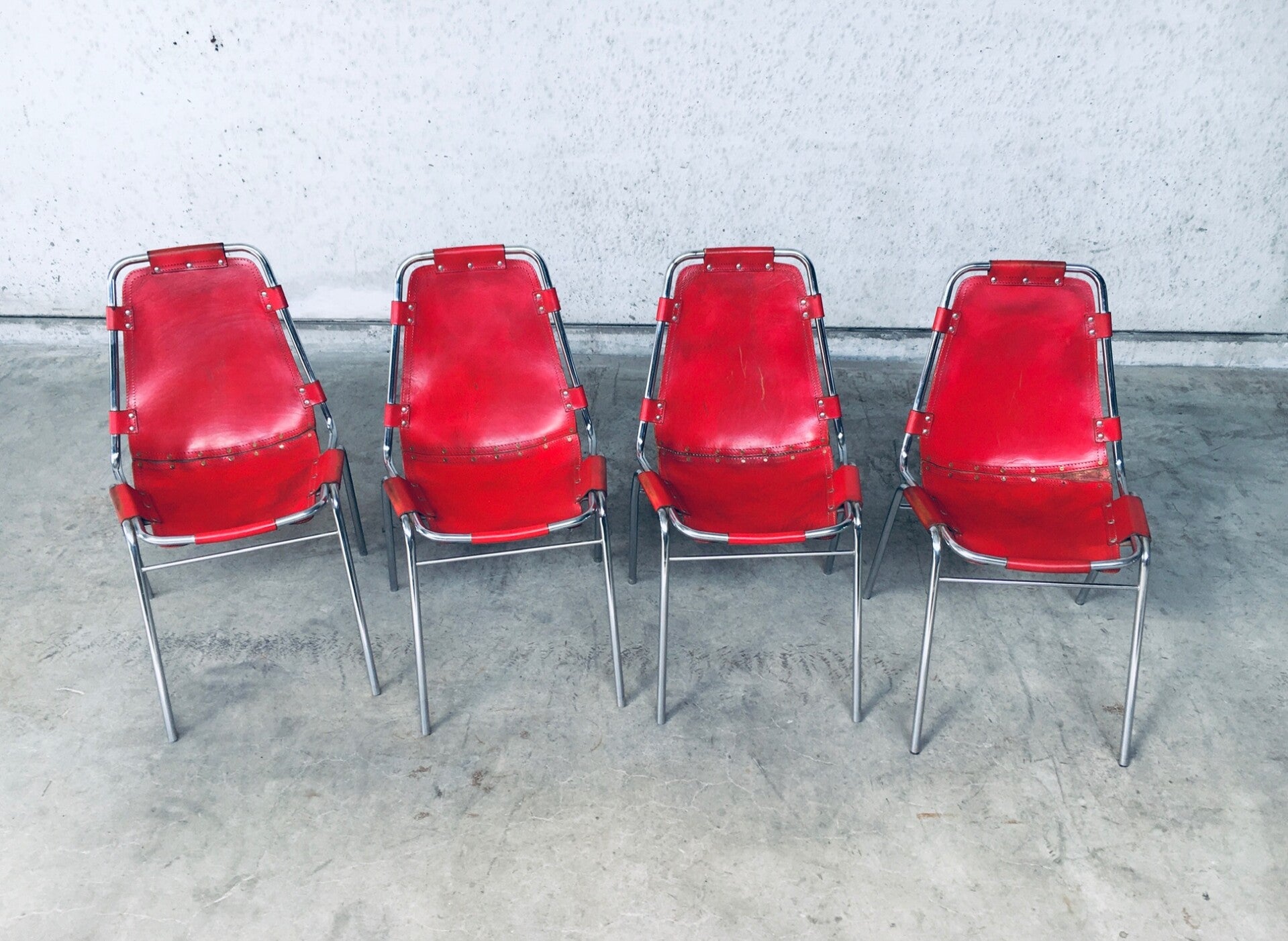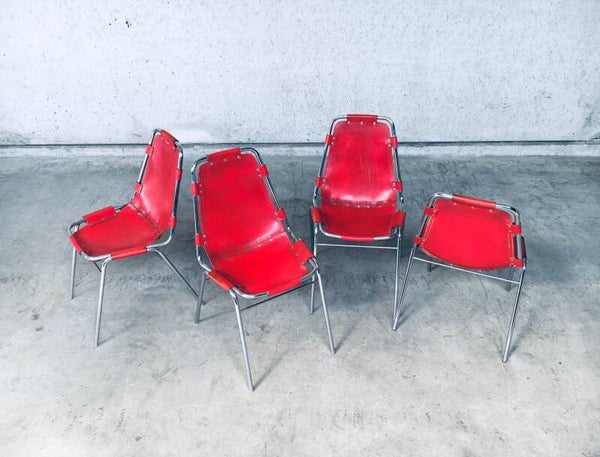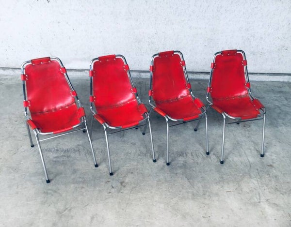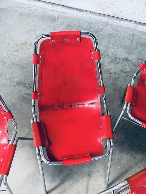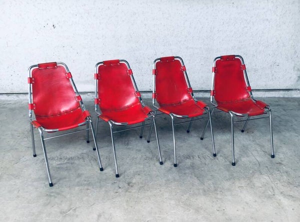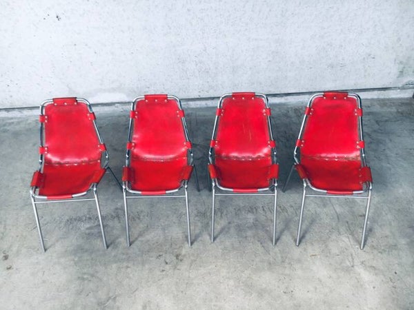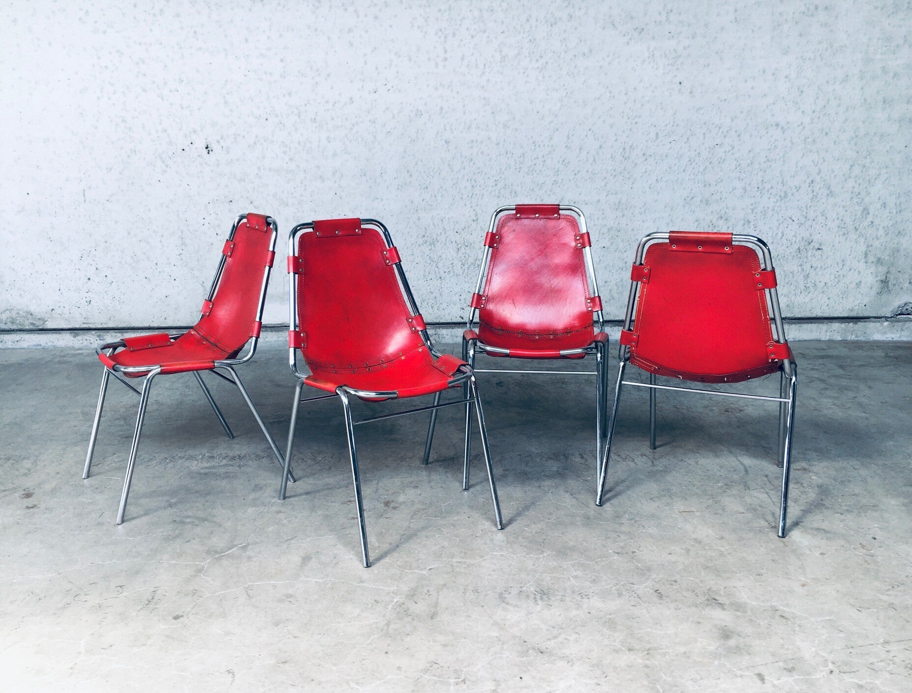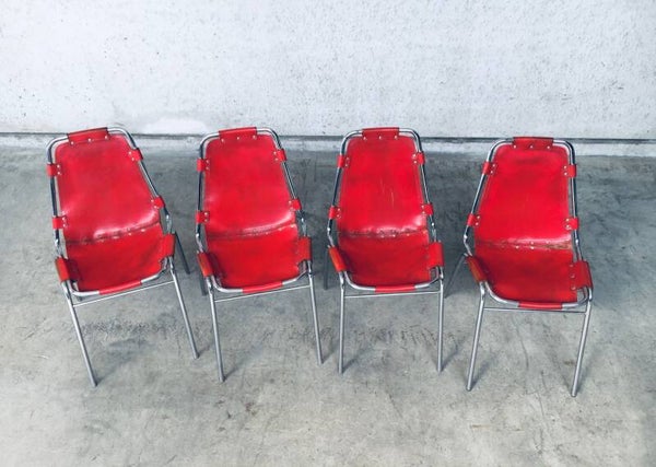 Vintage Midcentury Modern Design Dining Chairs selected by Charlotte Perriand for Les Arcs. Set of 4 in chrome with red leather seats. Dal Vera, Italy, 1960's. All original. They are in well used condition. All 4 have had rivets been placed as reinforcement from the seat panel to the back panel, this has been done in the 1970's. Check pictures for condition. Each chair measures: 84cm x 48cm x 50cm.