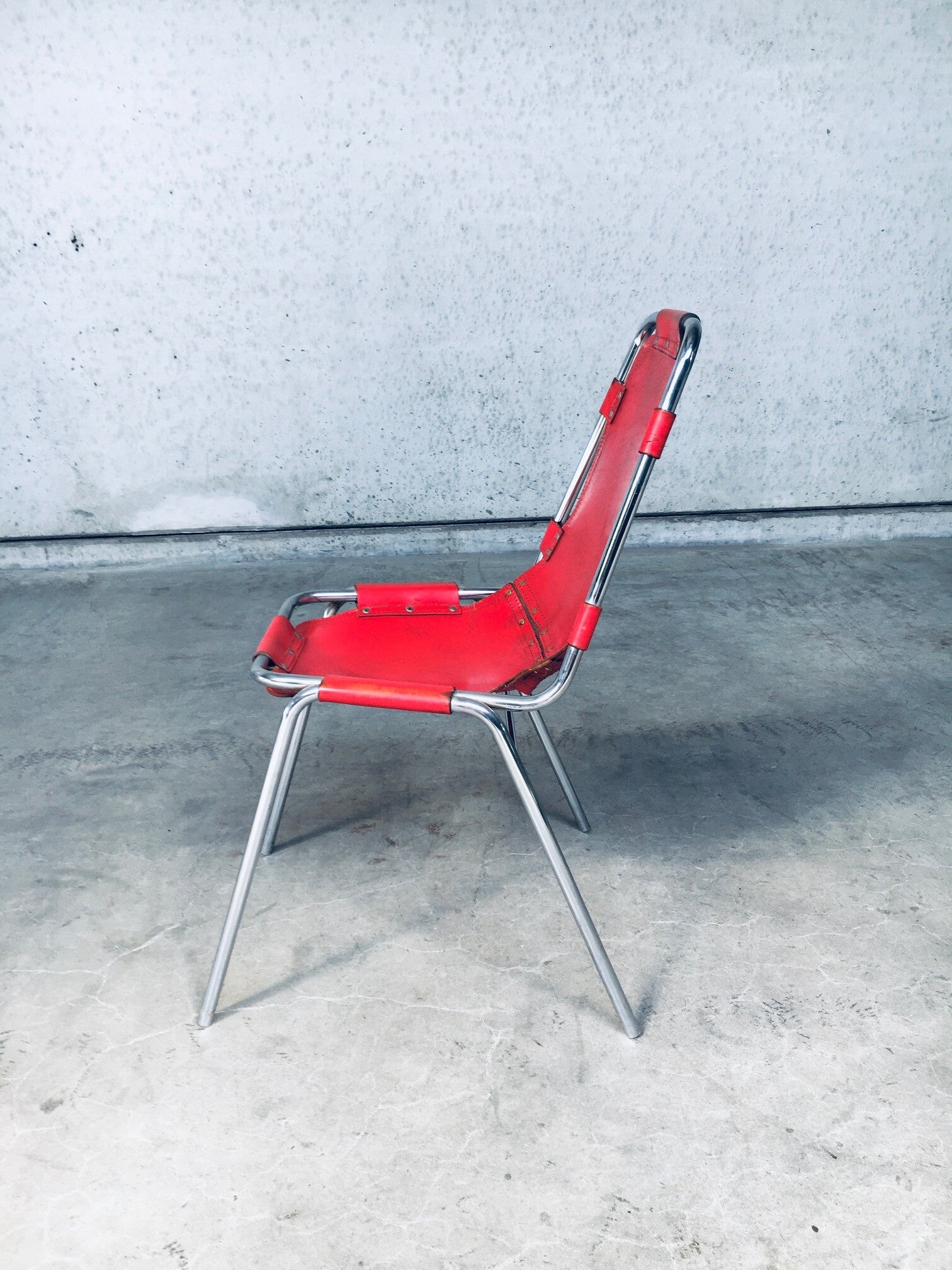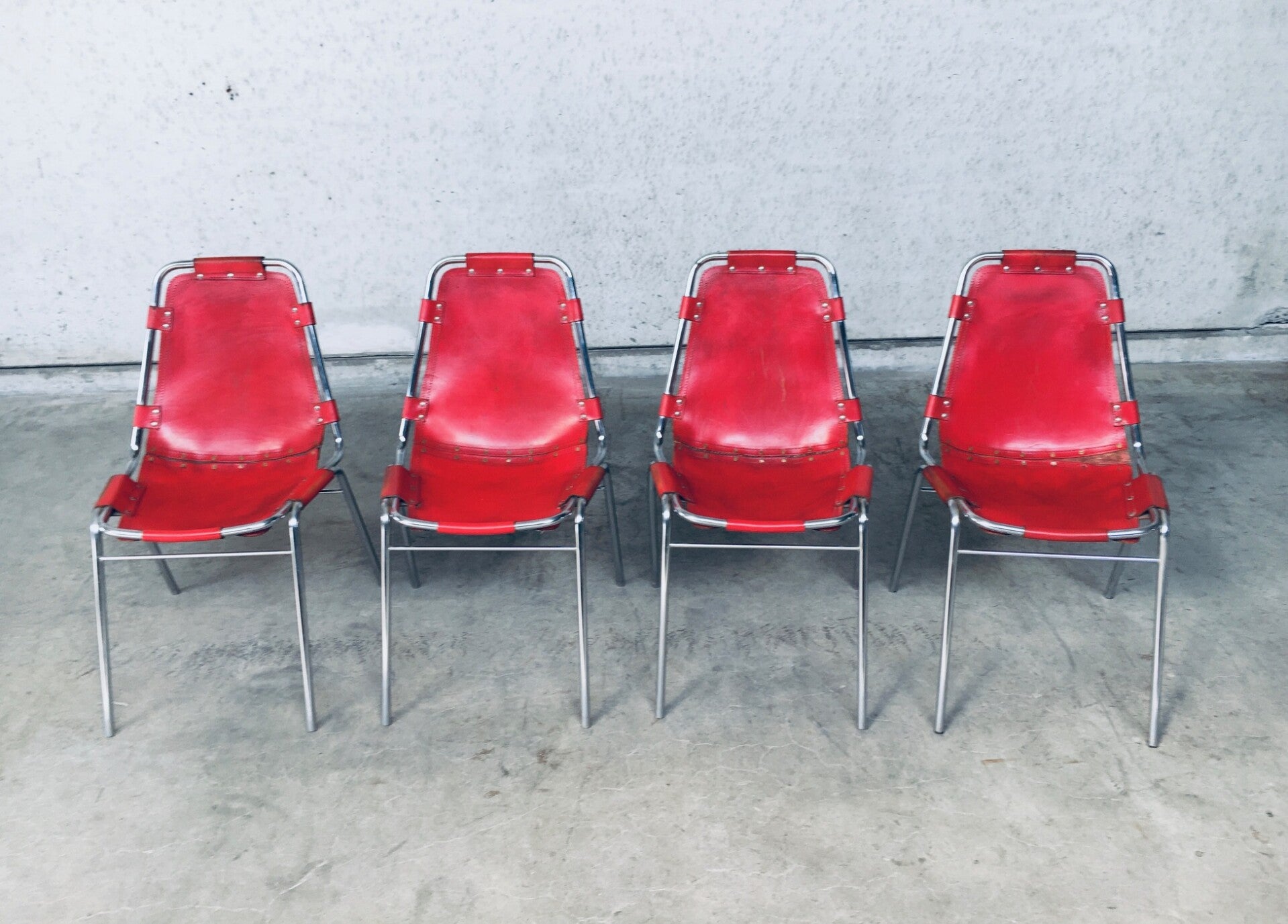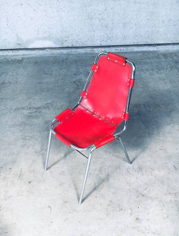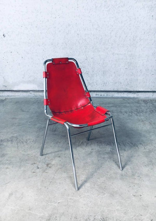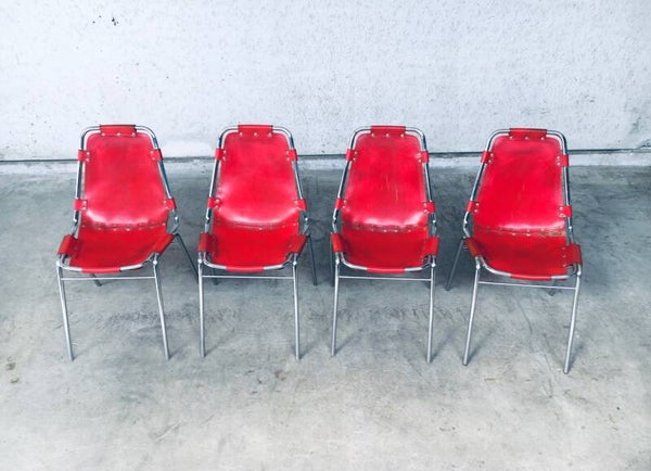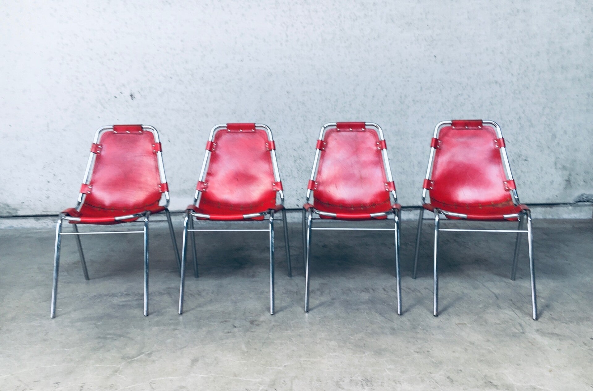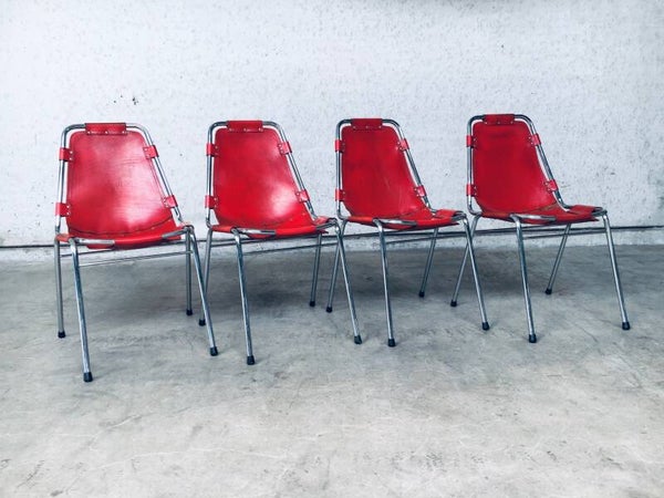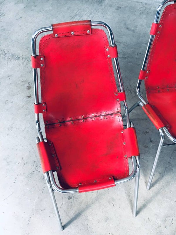 Vintage Midcentury Modern Design Dining Chairs selected by Charlotte Perriand for Les Arcs. Set of 4 in chrome with red leather seats. Dal Vera, Italy, 1960's. All original. They are in well used condition. All 4 have had rivets been placed as reinforcement from the seat panel to the back panel, this has been done in the 1970's. Check pictures for condition. Each chair measures: 84cm x 48cm x 50cm.