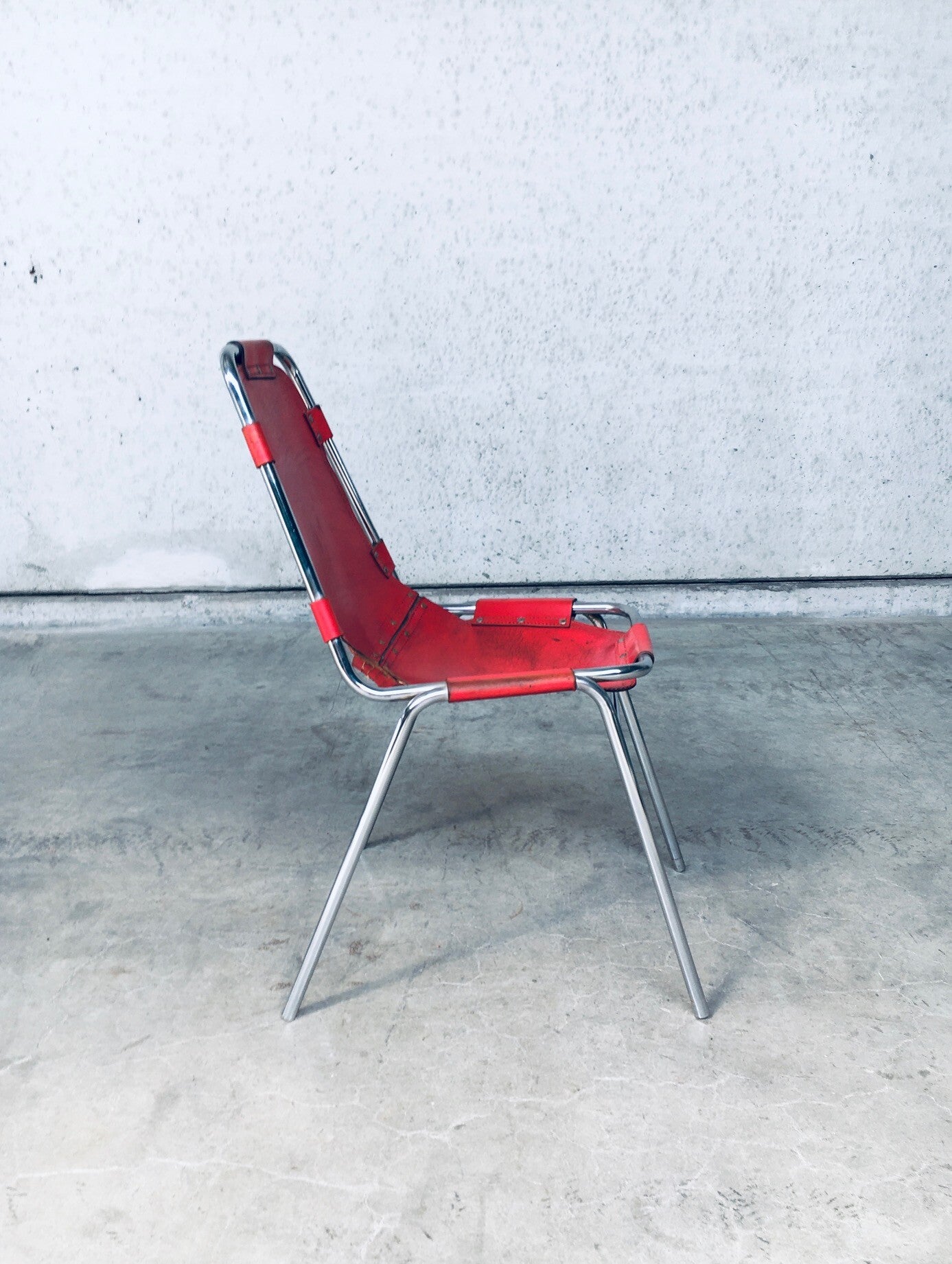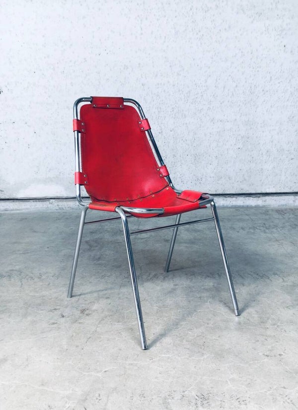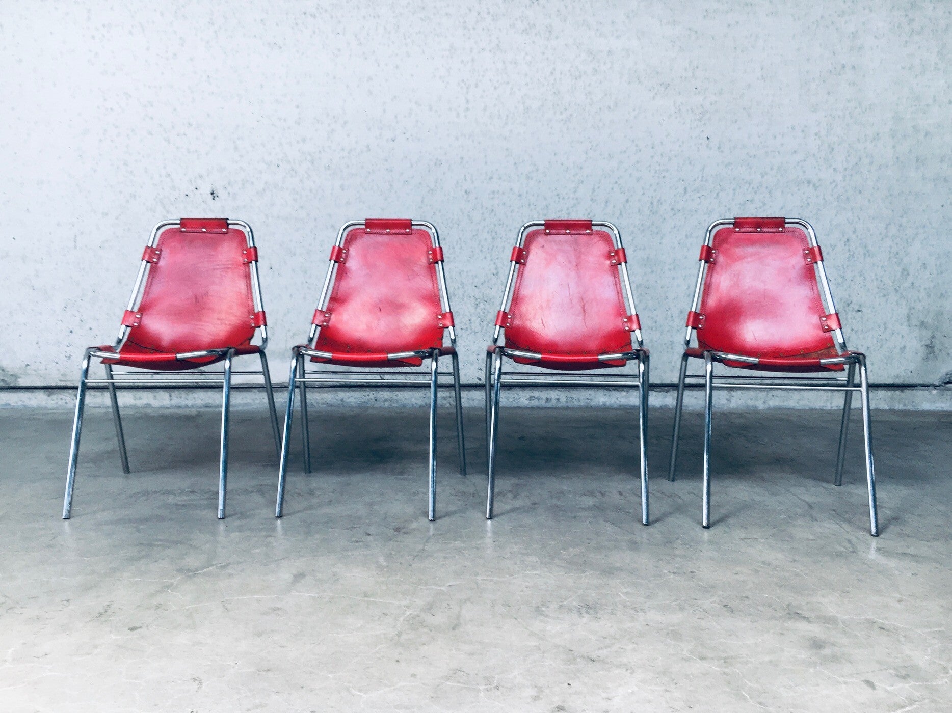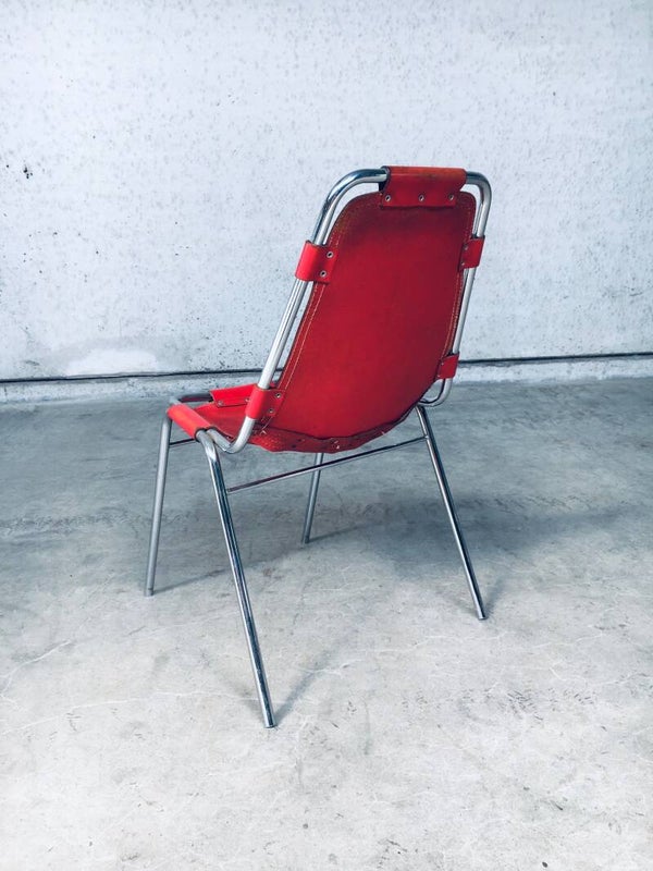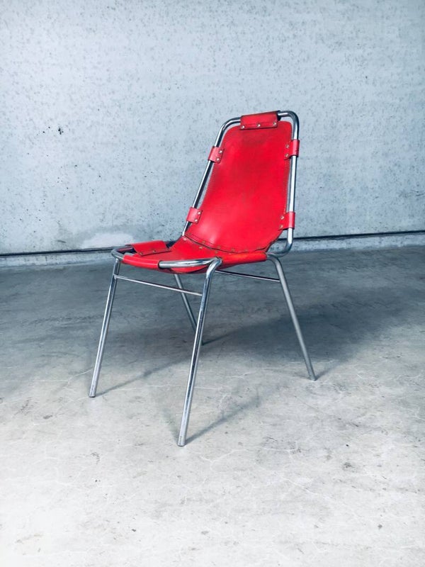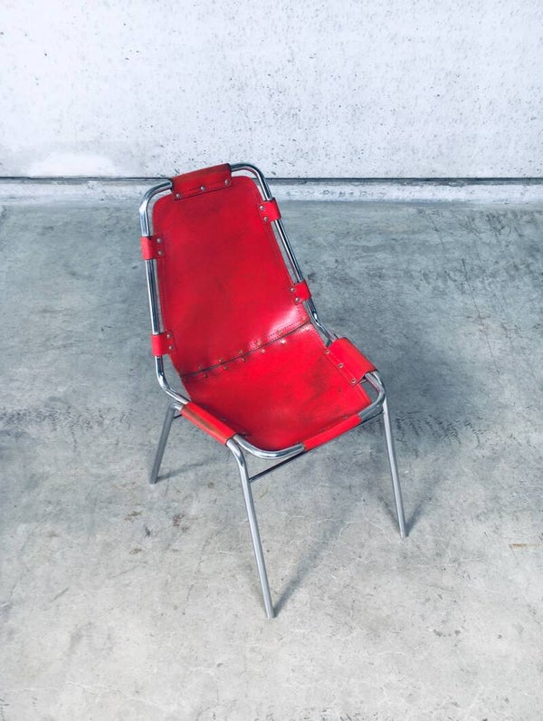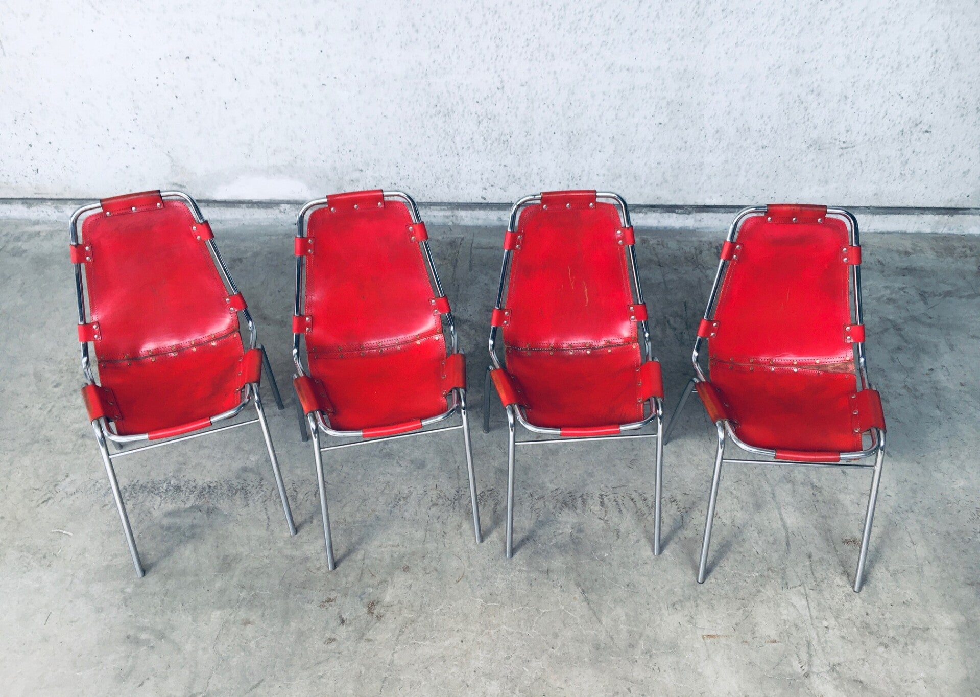Vintage Midcentury Modern Design Dining Chairs selected by Charlotte Perriand for Les Arcs. Set of 4 in chrome with red leather seats. Dal Vera, Italy, 1960's. All original. They are in well used condition. All 4 have had rivets been placed as reinforcement from the seat panel to the back panel, this has been done in the 1970's. Check pictures for condition. Each chair measures: 84cm x 48cm x 50cm.