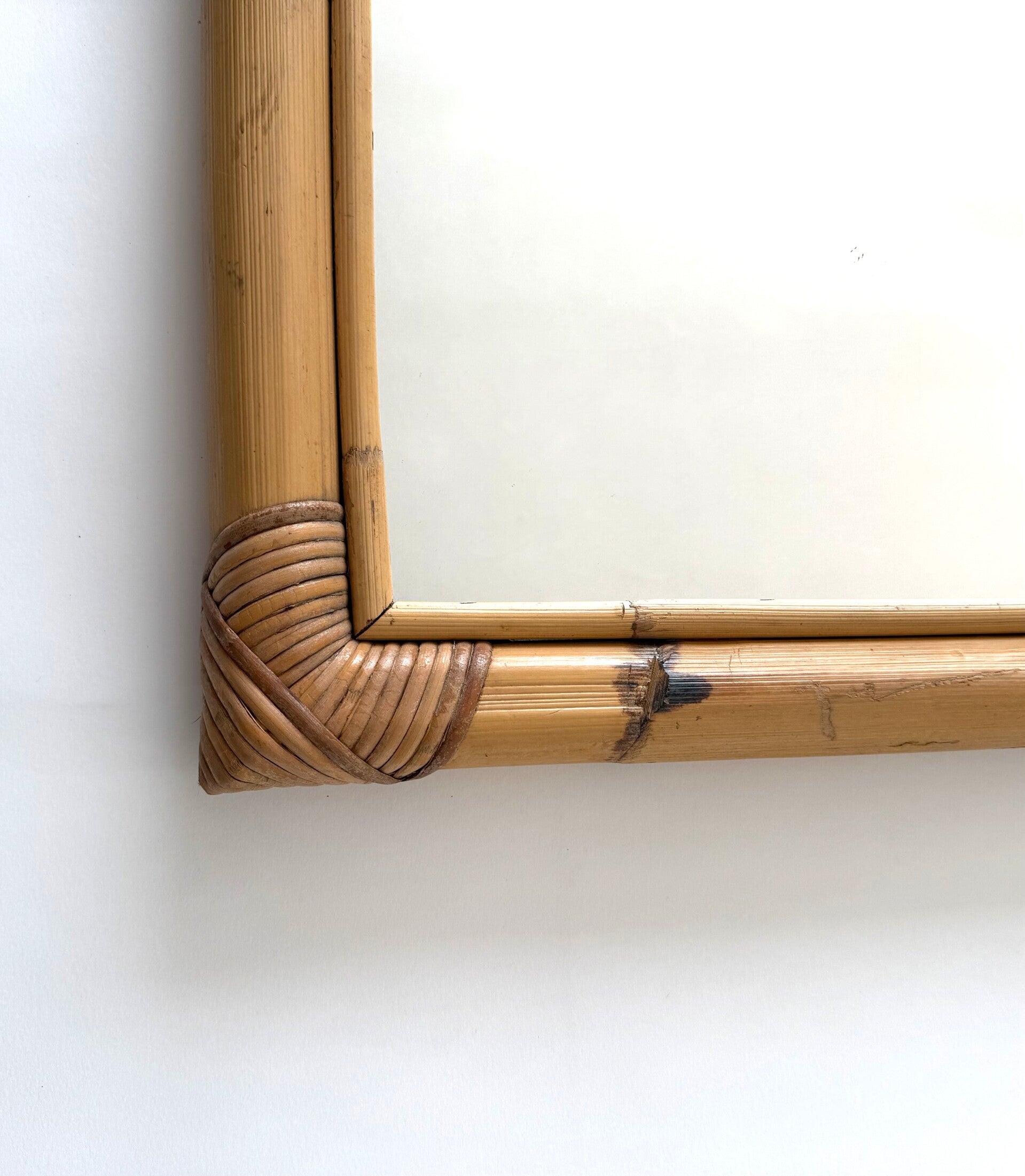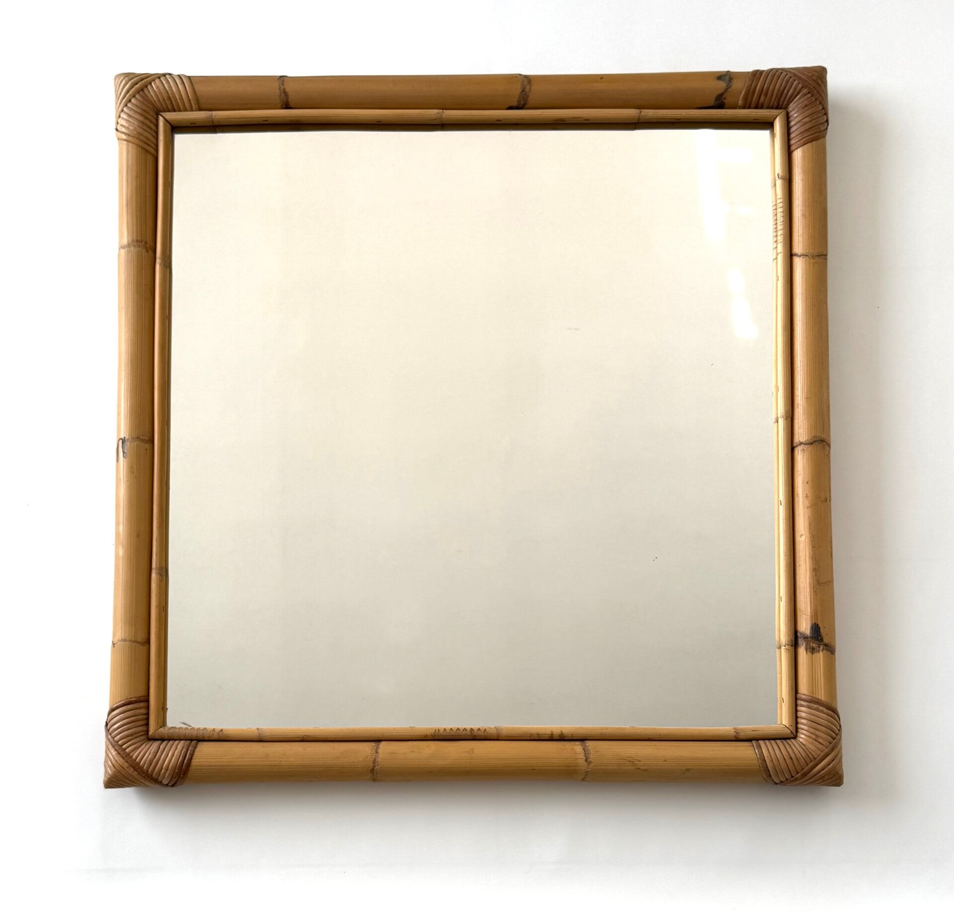 Vintage Midcentury Boho Design XL Square Bamboo Mirror. Made in Italy, 1960's period. Bamboo frame with woven strips on the corners. The mirror itself has some very minors signs of it's age and use. The bamboo frame comes in very good, all original condition with normal signs of it's age and use. This measures 79cm x 79cm x 5cm.