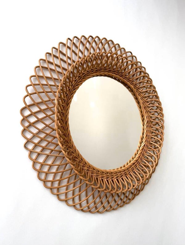 Vintage Midcentury Modern Boho Design Round Rattan Mirror. Made in France, 1960's period. Woven / braided rattan double edge border on this large model mirror. This comes in very good, all original condition for it's age and use. Measures 61cm x 61cm x 7cm.