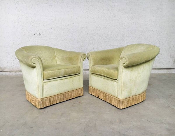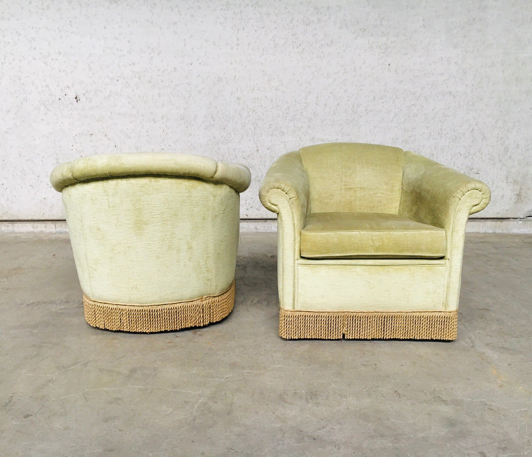 Vintage 1960's Hollywood Regency Style set of 2 light green velvet arm chair chairs with fringe and nice formed back and arm rests. Made in Belgium, 1960's. Both are in very good condition. Boudoir seats. Each chair measures: 87cm x 80cm x 73cm.