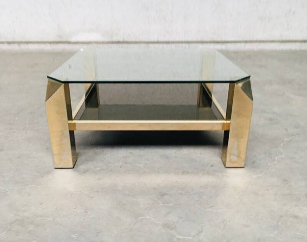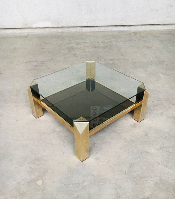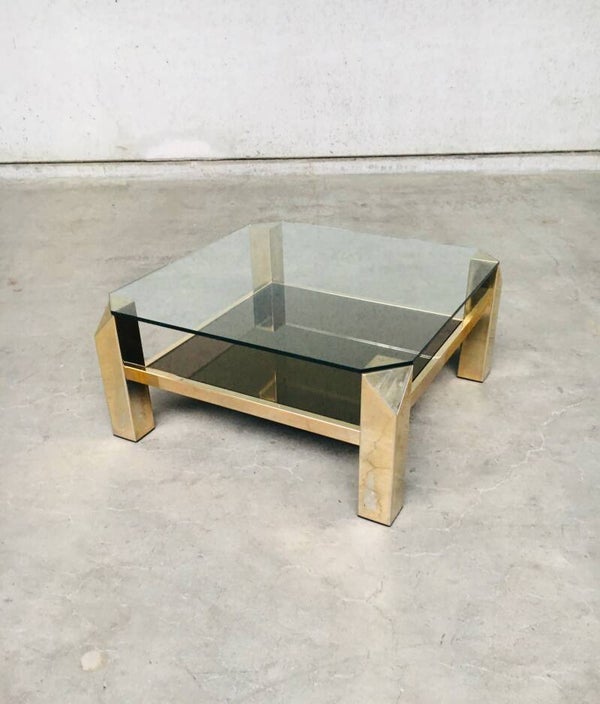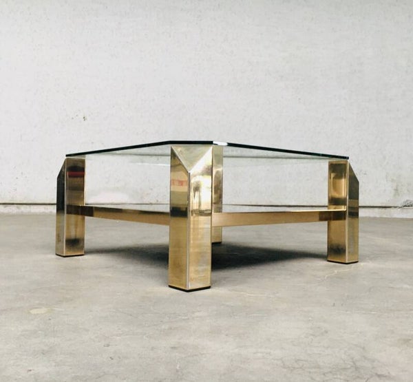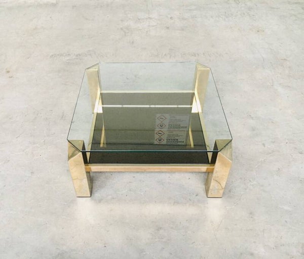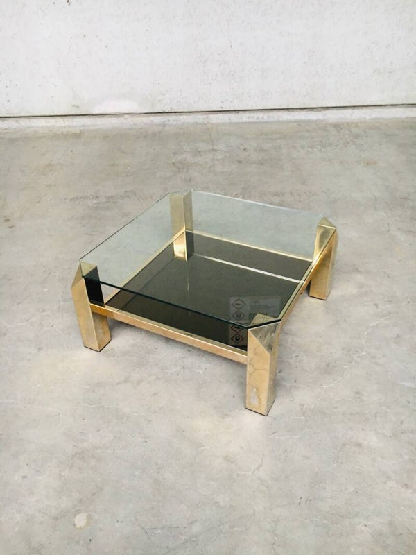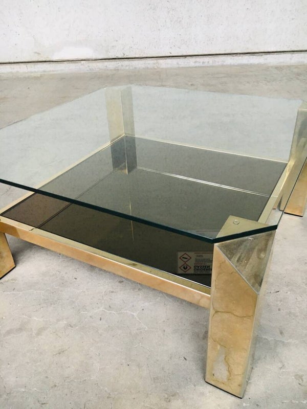 Vintage Modernist Design 80x80 square brass & glass coffee table by Belgochrom, Belgium 1970's - 80's. 23krt gold plated brass with clear glass top and gold mirror glass inlay. In very good condition. With signs of it's age. 80cm x 80cm x 38,5cm.