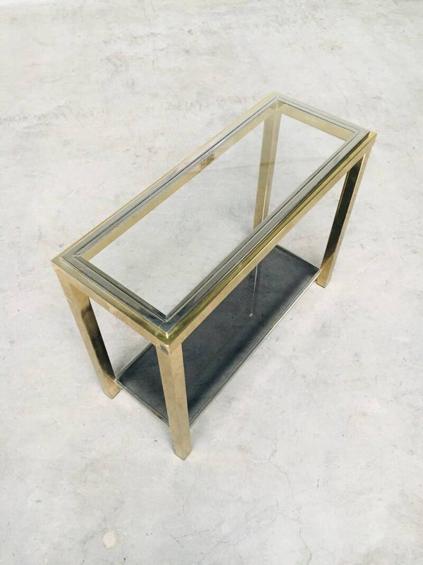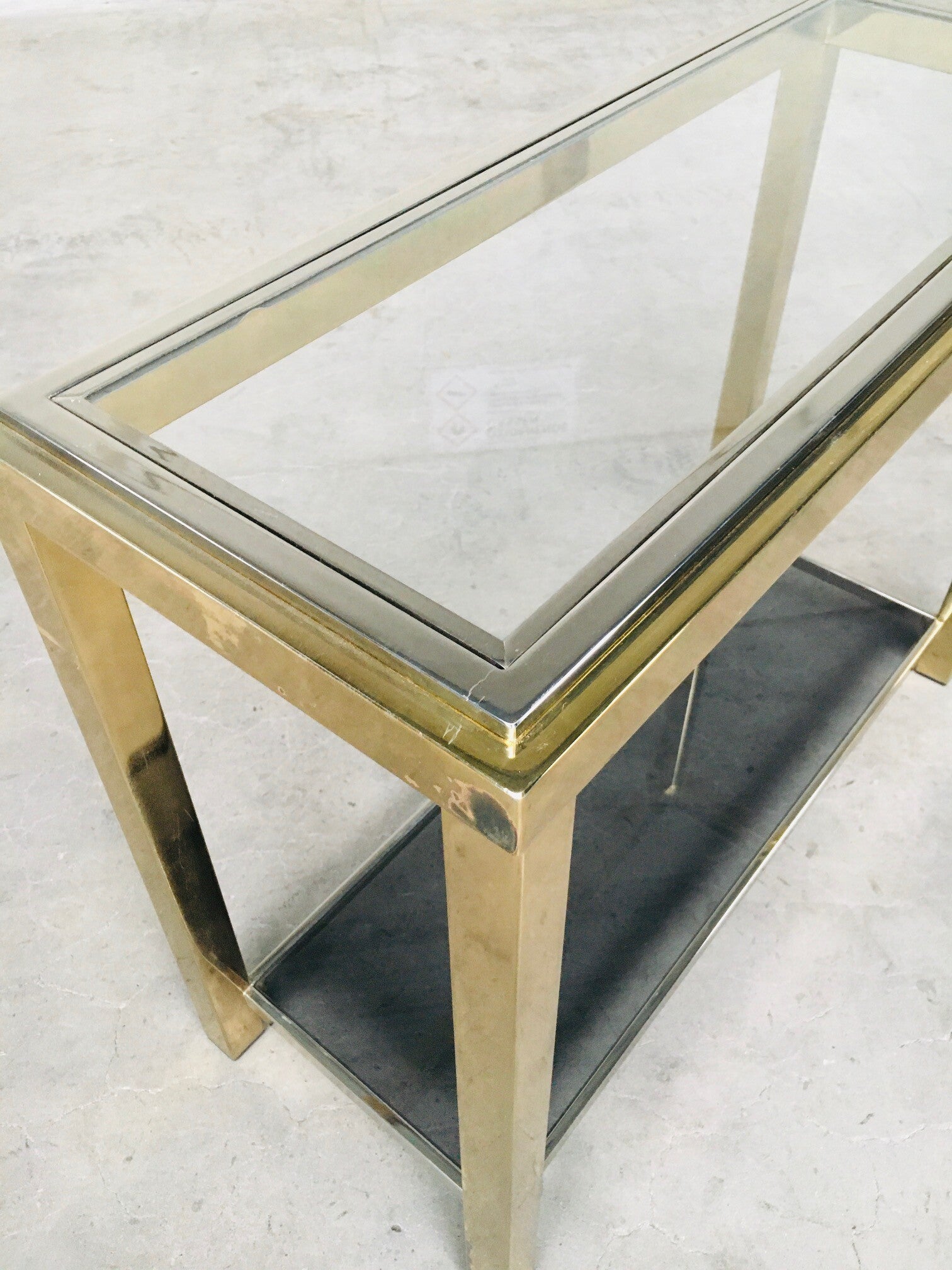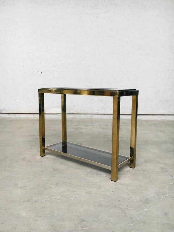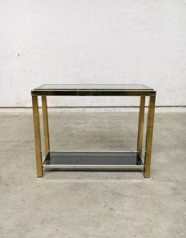 Vintage Hollywood Regency Style Brass & Chrome Two-Tier Console Side Table by Belgo Chrom. Belgium, 1970's. In style of Willy Rizzo Design. Brass & Chrome metal frame with clear glass top inlay and grey fumé glass bottom inlay. In very good condition. Measures: 90cm x 71cm x 36cm.