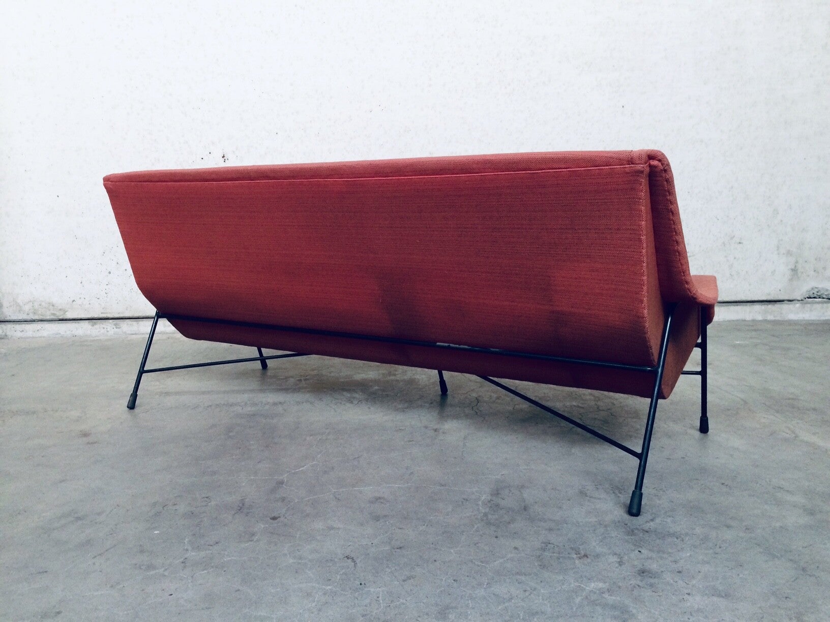 Vintage Midcentury Modern Design model S12 3 seat Sofa by Alfred Hendrickx for Belform, Belgium 1958. All original, untouched fabric and vintage condition. Comes all complete with all 5 brass feet supports. Beautifull original dark pink / light red fabric. A beauty for the purist vintage design lovers. Measures: 202cm x 82cm x 80cm.