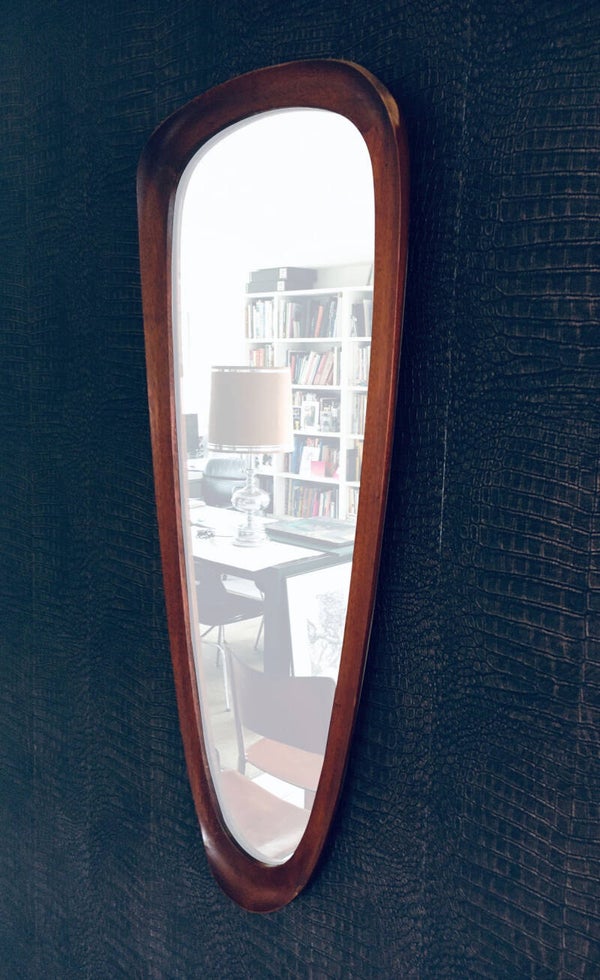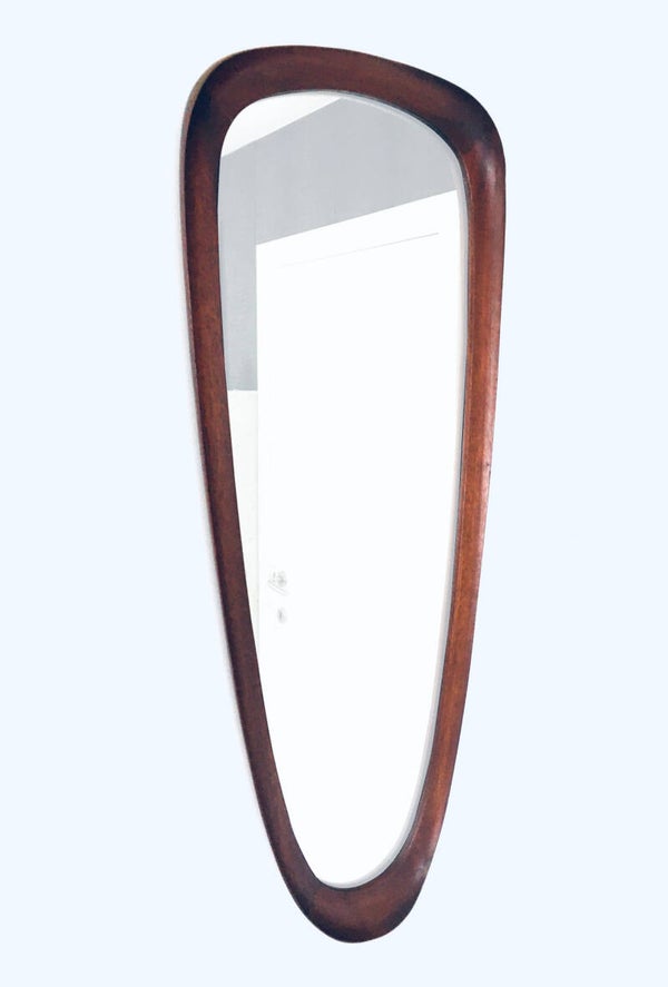 Vintage Midcentury Modern Scandinavian Design Teak Wall Mirror. Made in Denmark, 1960's. Beautfull shaped wooden frame with flat mirror. All original and in very good condition. Measures 84cm high x 34,5cm wide x 4cm deep.