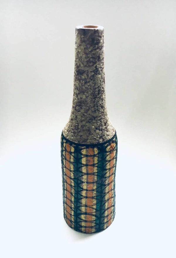 Vintage Midcentury Modern Italian Design Art Pottery Ceramic Vase, Bitossi for Raymor, made in Italy, 1960's. Large fluted shaped vase with lava glaze and hand painted motif. In very good condition. Measures 38,5cm x 11,5cm x 11,5cm.