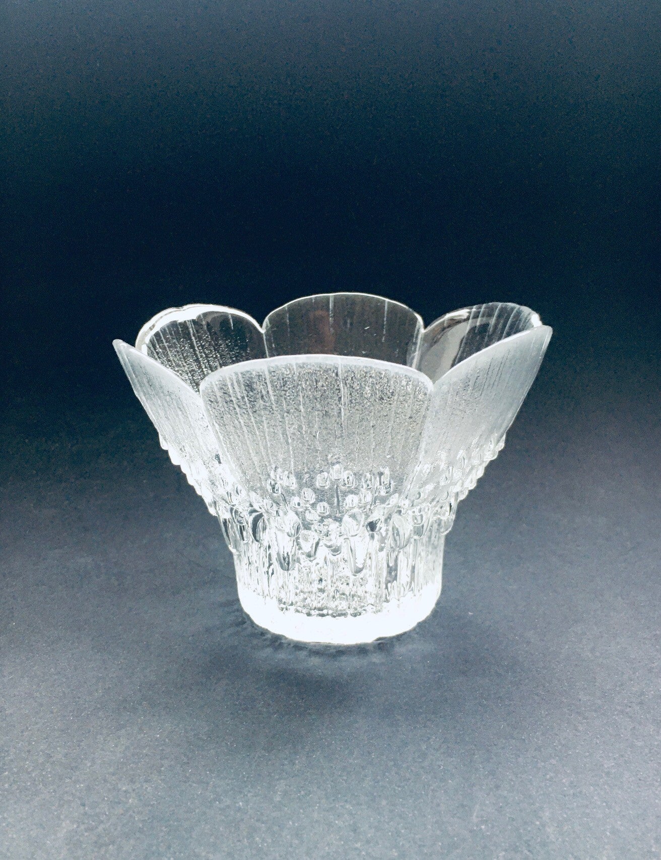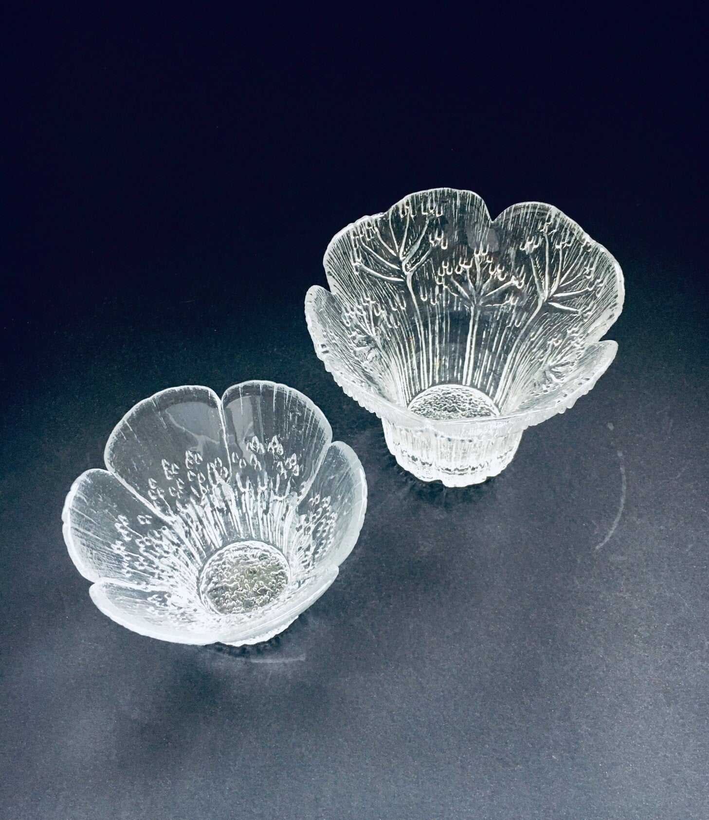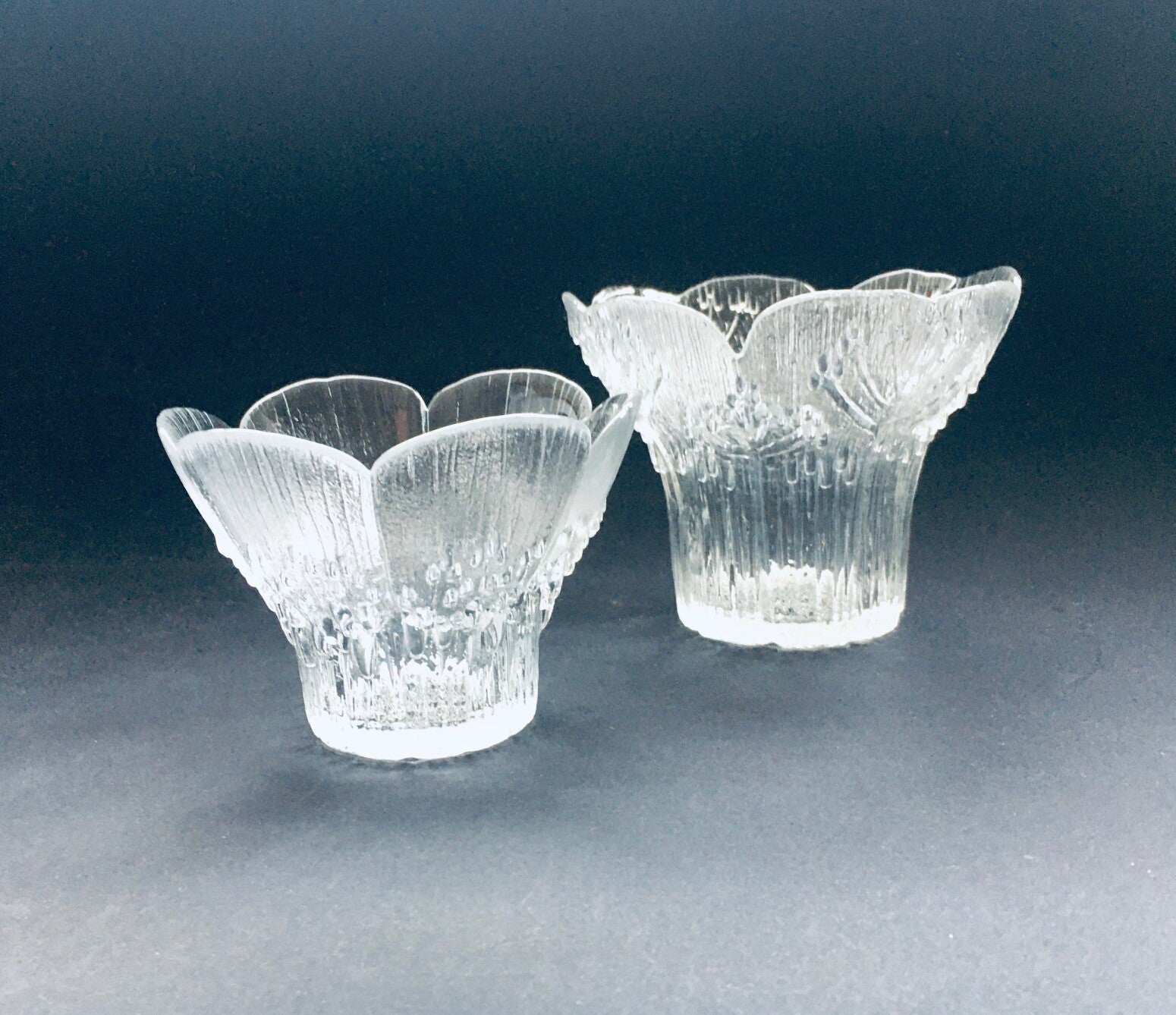 Vintage Midcentury Modern Scandinavian Design Glass candle holder set by Pertti Kallioinen, Finland 1960's. 2 sizes in the same series of flower shape glass vases. Both in perfect condition. Small size: 8,5cm x 12cm x 12cm. Medium size: 10,5cm x 13,5cm x 13,5cm.