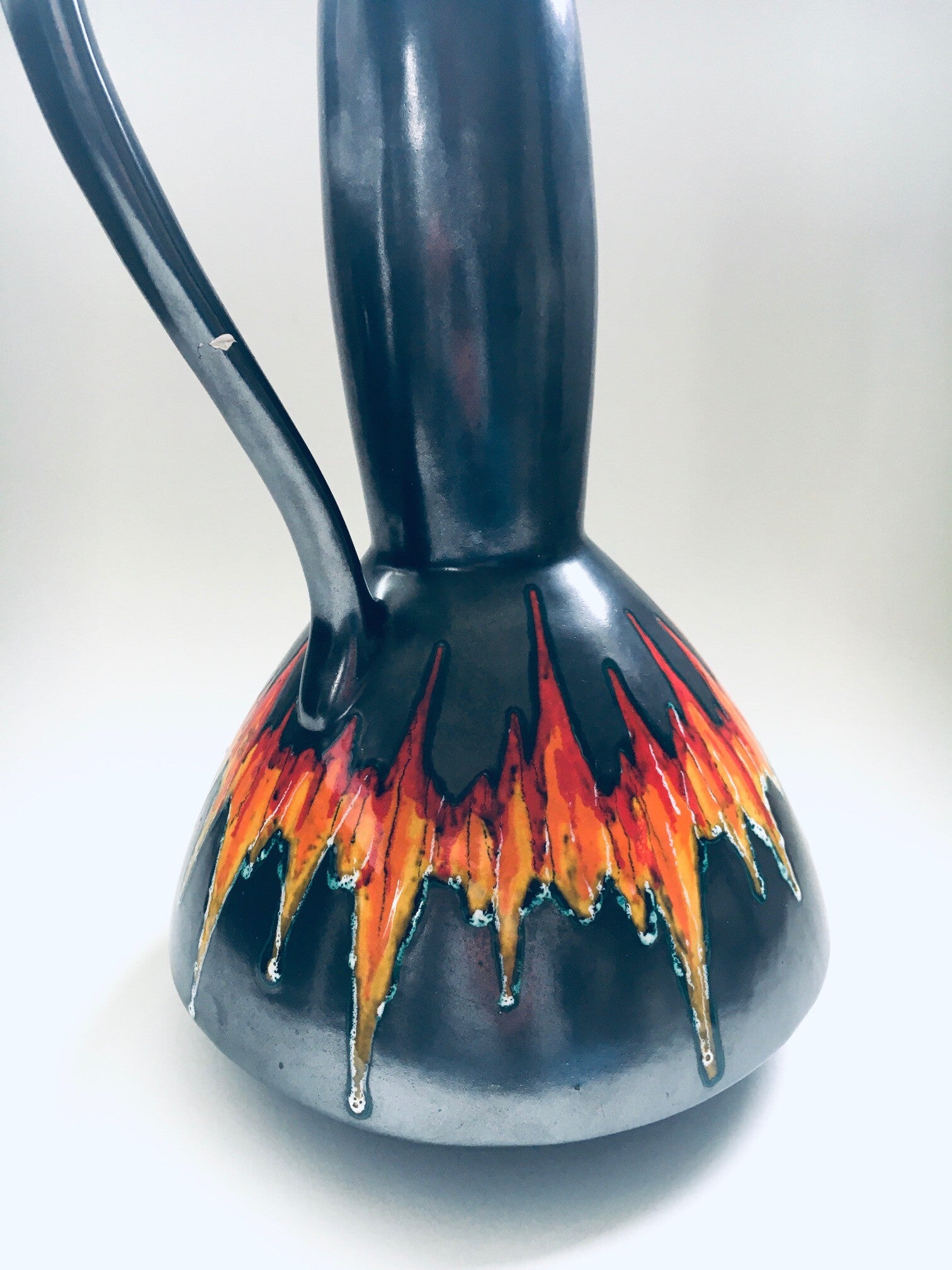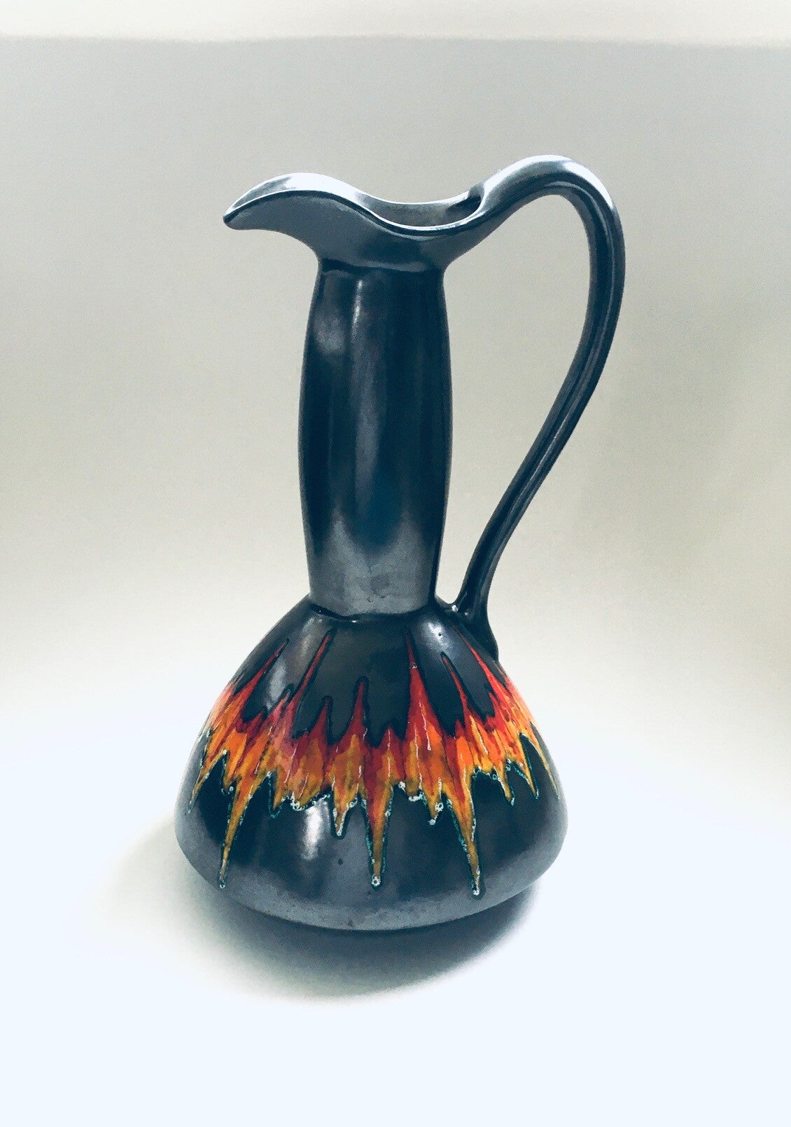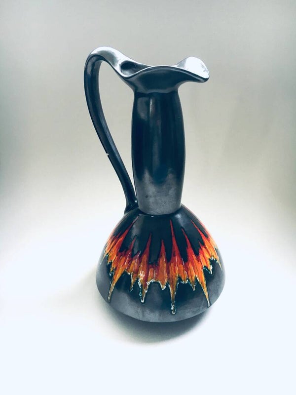 Vintage Art Pottery XL Large Pitcher Vase. Italy 1960's. Black metal glazed base with flamed glaze finish. Has a small chip at handle. Otherwise in very good condition. Marked Italy at bottom. Measures: 37cm x 24cm x 21,5cm.