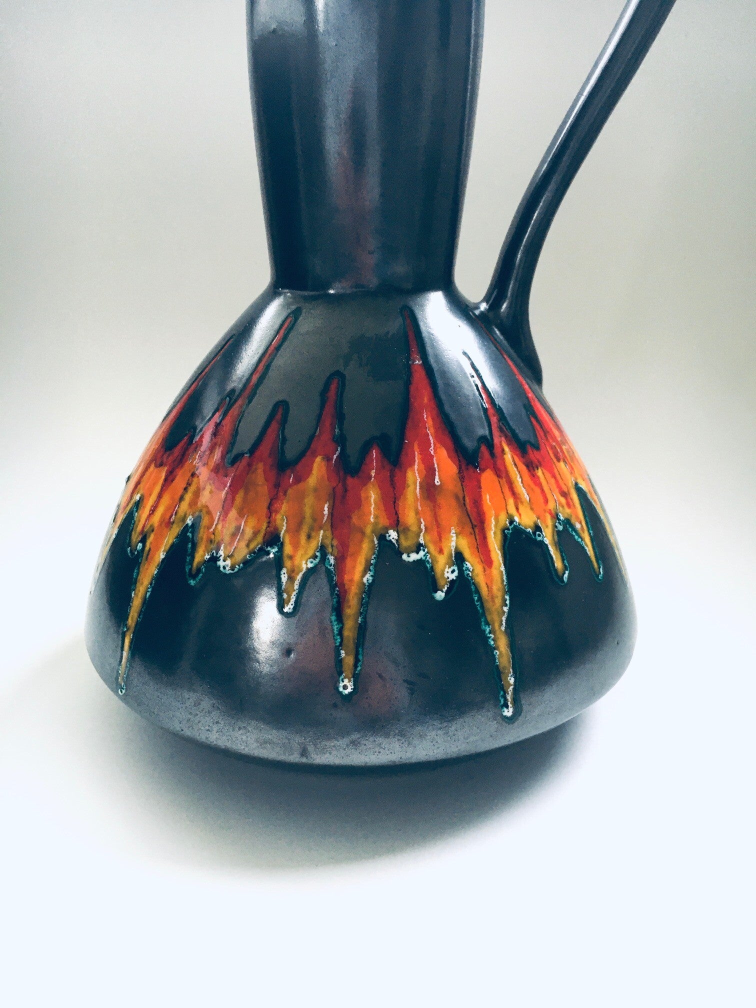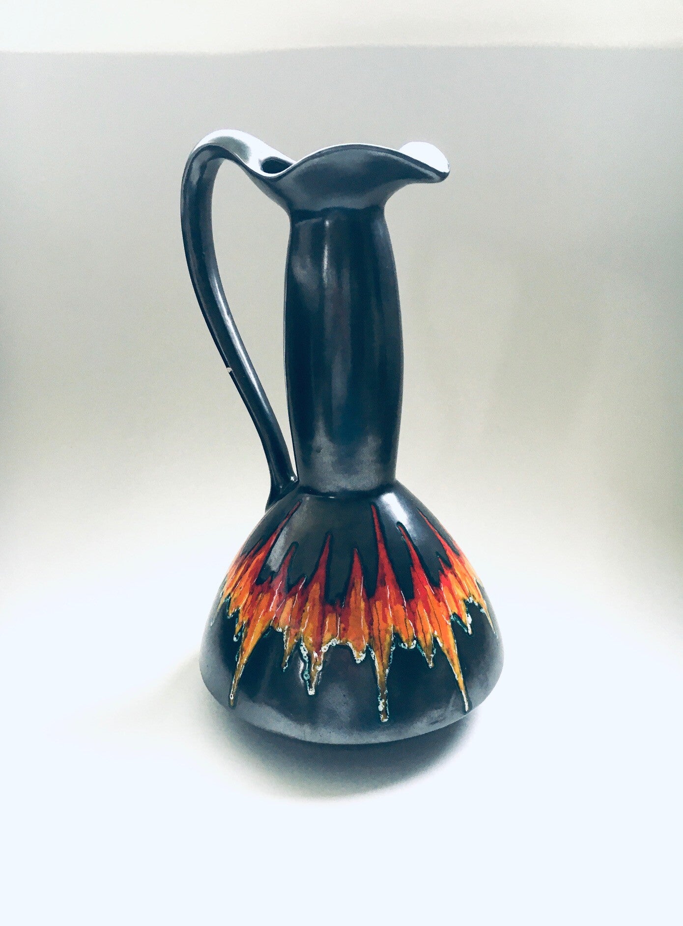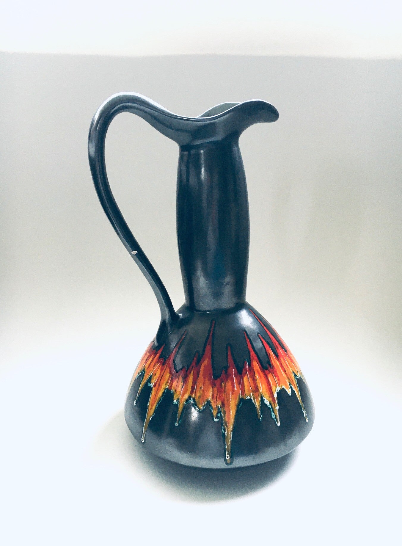 Vintage Art Pottery XL Large Pitcher Vase. Italy 1960's. Black metal glazed base with flamed glaze finish. Has a small chip at handle. Otherwise in very good condition. Marked Italy at bottom. Measures: 37cm x 24cm x 21,5cm.