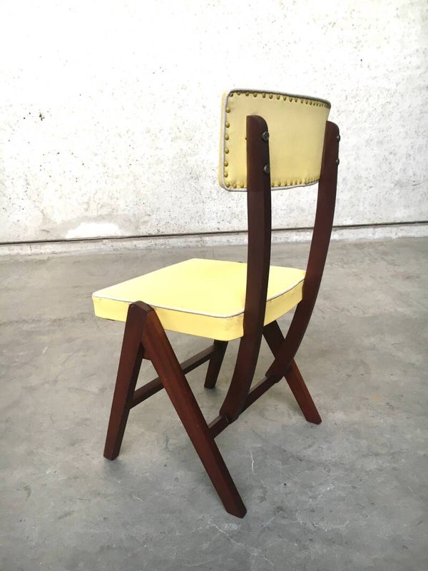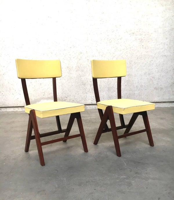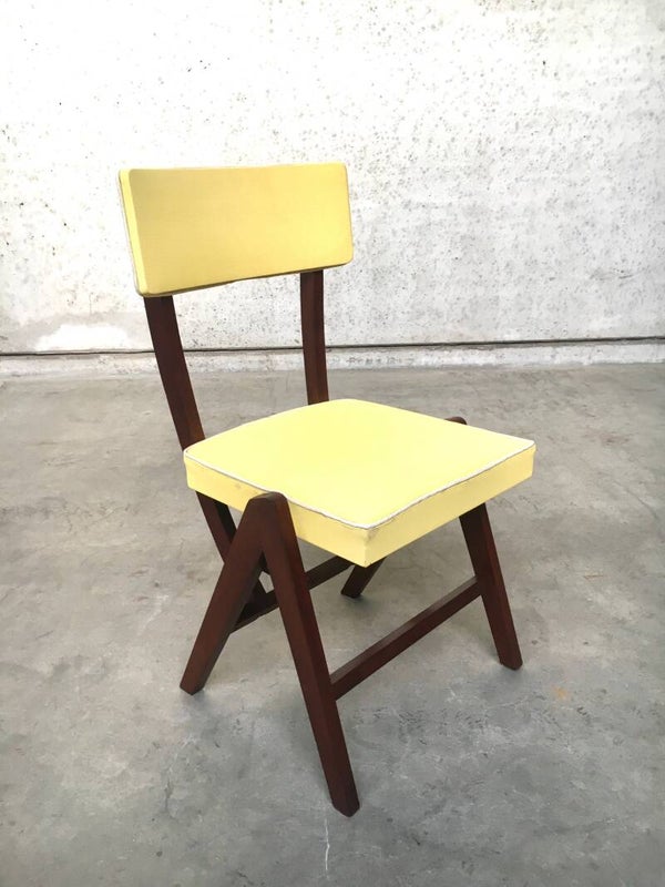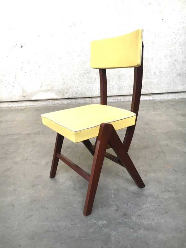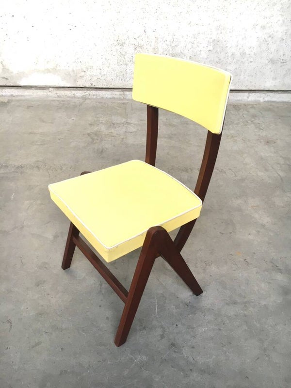Vintage Midcentury Modern French Design set of 2 Kitchen / Dining Chairs. Wooden frame with yellow ribbed skai leather look back and seat. Nice design. Both are in good condition for their age. Each measures 85cm x 45cm x 47cm.