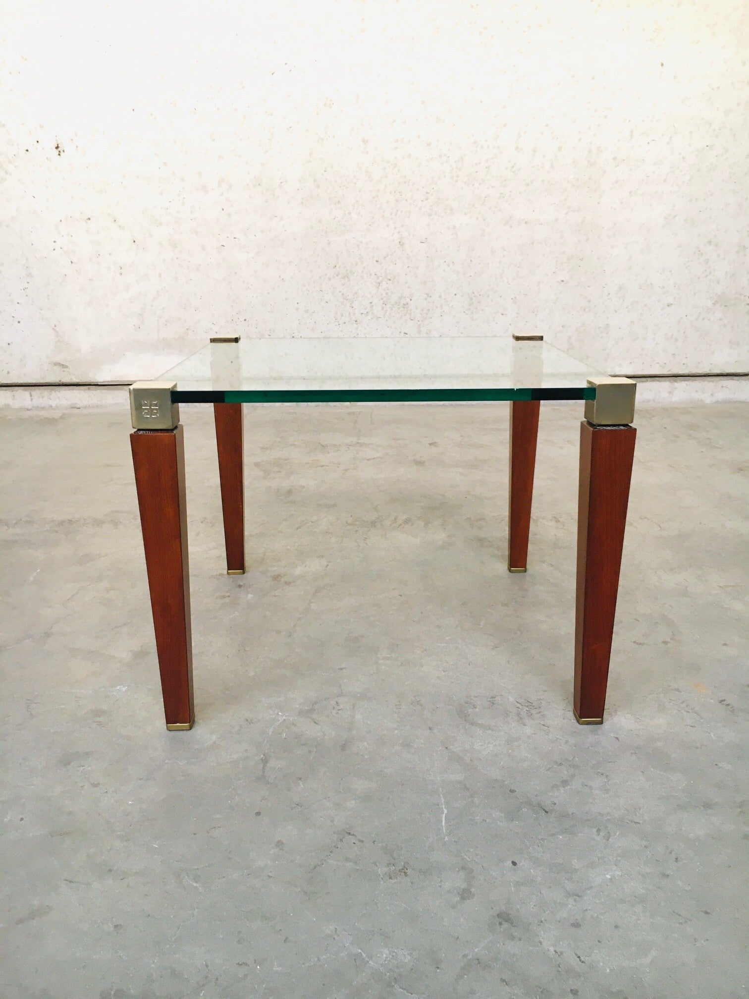 Modernist Design Side Table in Brass, Wood & Glass by Peter Ghyczy, 1980's Holland. Peter Ghyczy, German designer, born in Hungary and working in Holland, the company is still active in design furniture. Square side table or small coffee table. Thick glass, brass fittings with wooden legs. In very good condition. Measures 61,5cm x 61,5cm x 47cm.