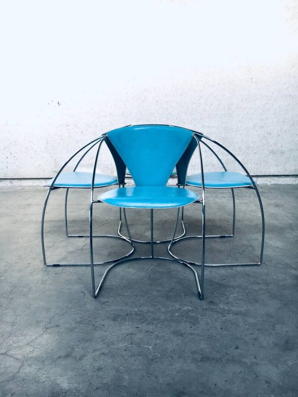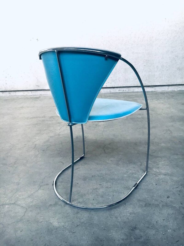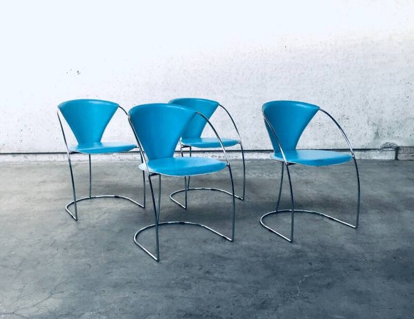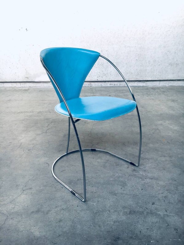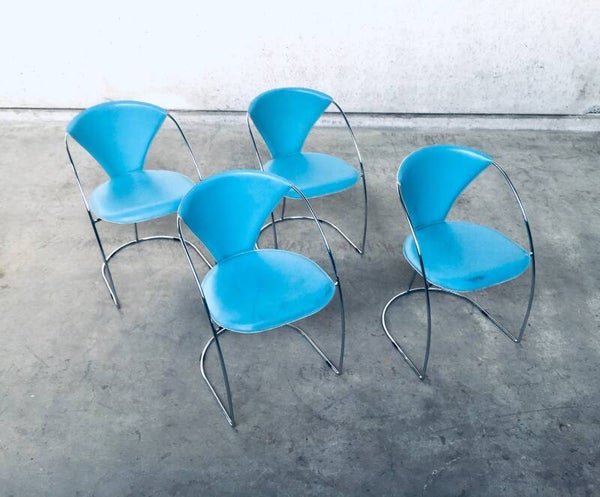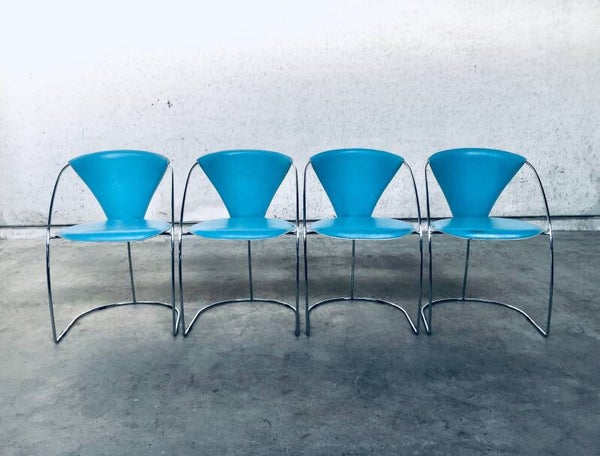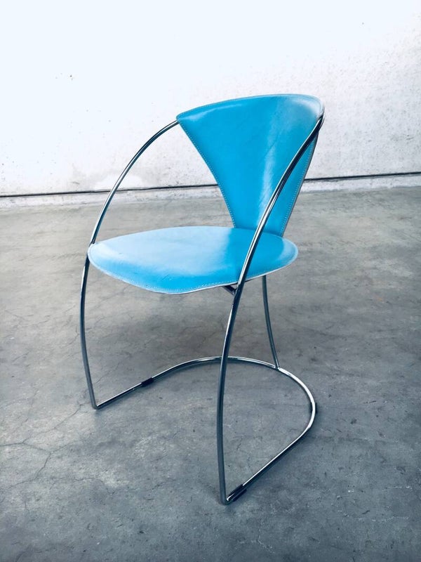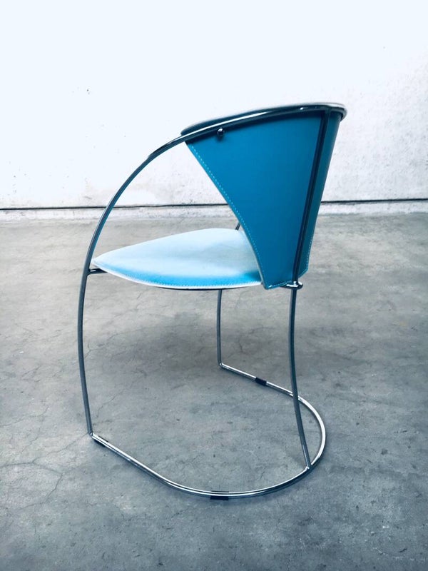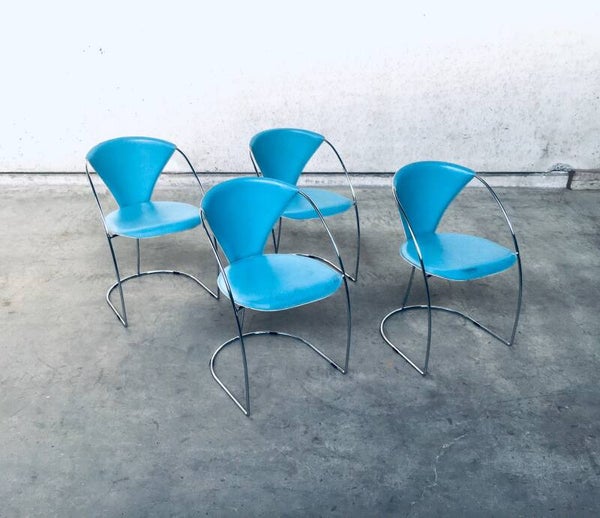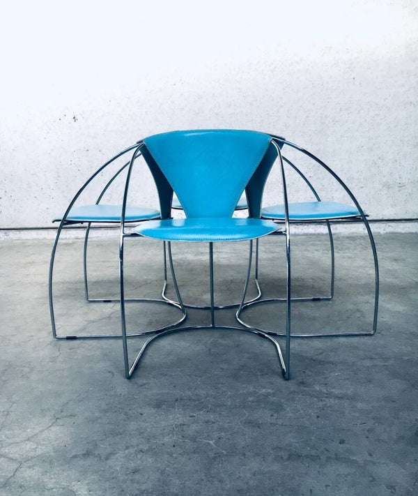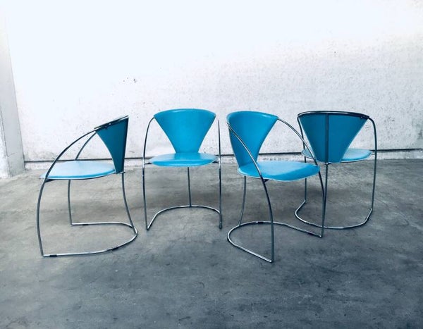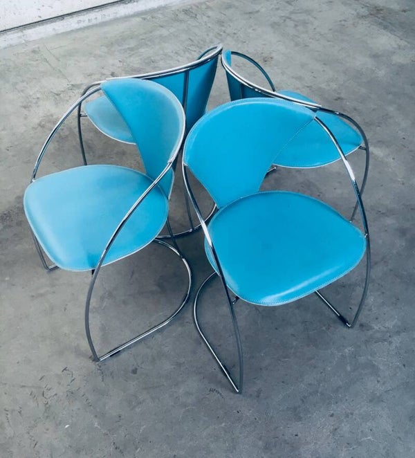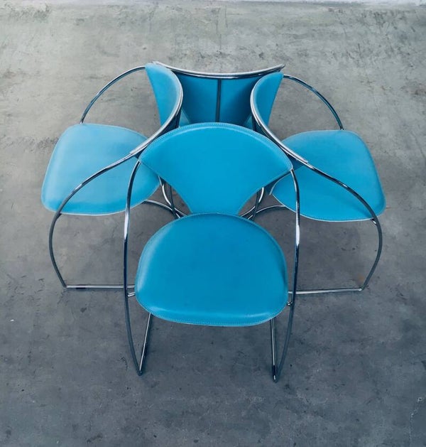 Post Modern Italian Design set of 4 Dining chairs, model 'Linda'. Made by Arrben, Italy 1980's. Blue leather covered seat and back with slender chrome metal frame. Beautful design. In very good condition. Each chair measures 75cm x 51cm x 48cm.
