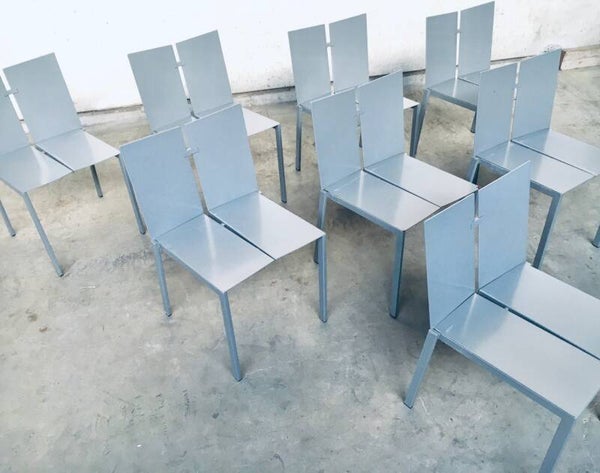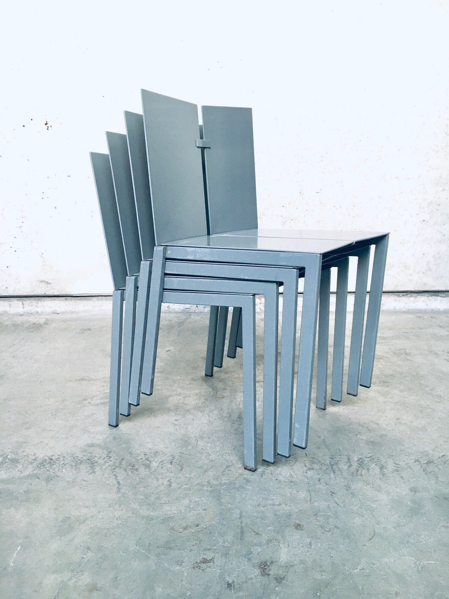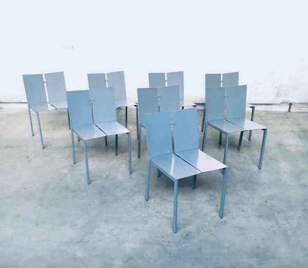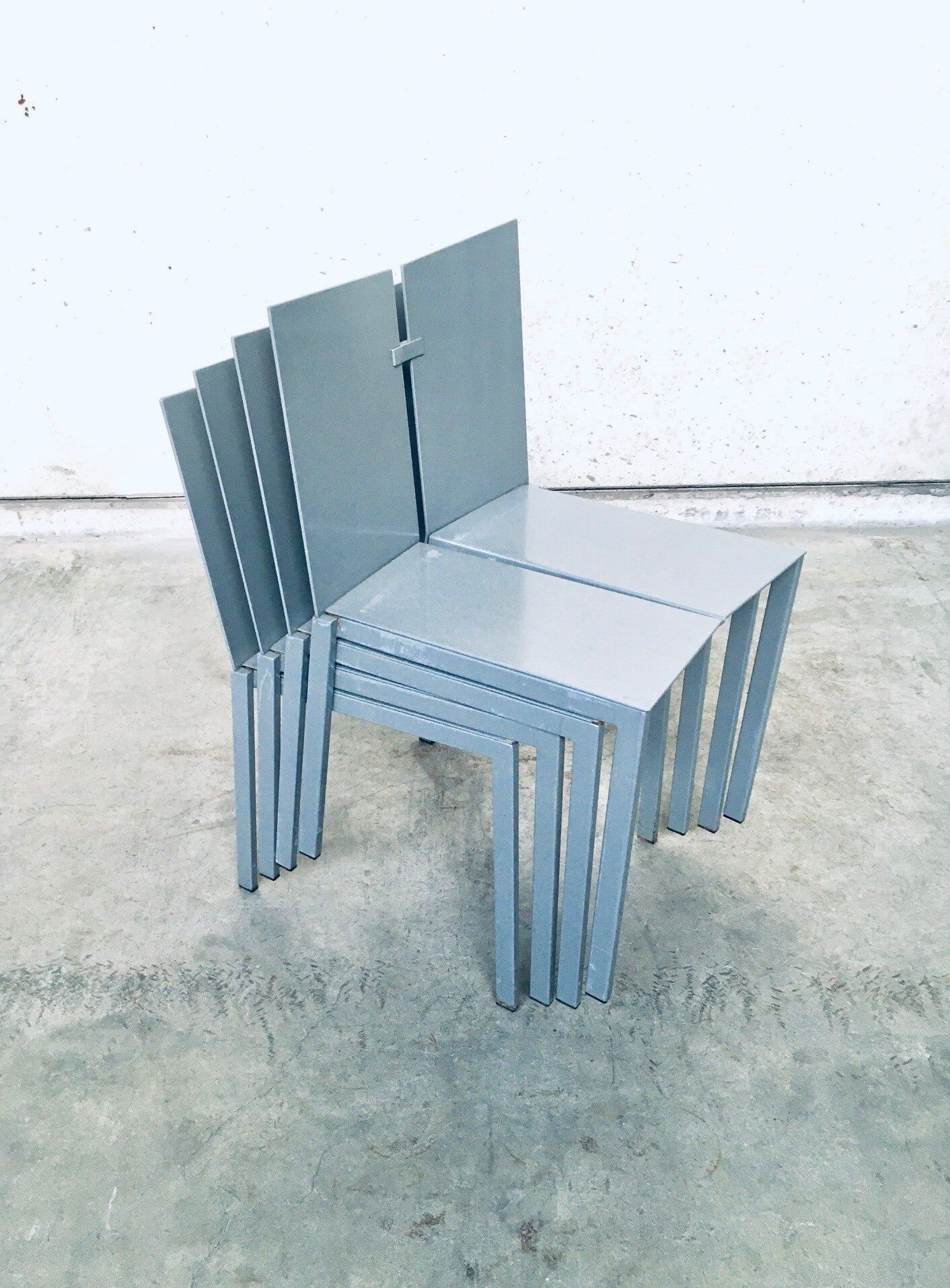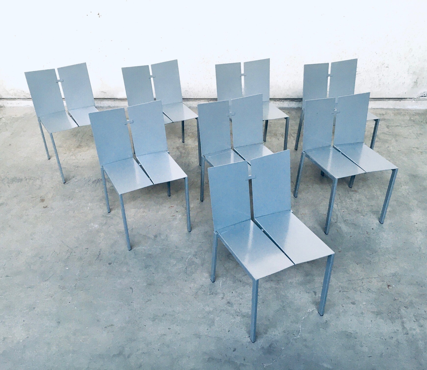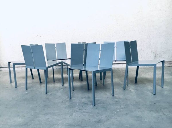 Set of 8 Post Modern Design Office / Garden / Dining Chairs by Frans Van Praet (BE - born 1937), Belgium 1990's. Model Oost-West. Used in Administratief Centrum Lommel City, Belgium. Also named the Lommel Chair. Stackable. All metal construction, which sits remarkably good due to bounce in back rest. All 8 are in good condition. Signs of wear. Very Rare chairs to find. Each chair measures 86cm x 48cm x 54cm.