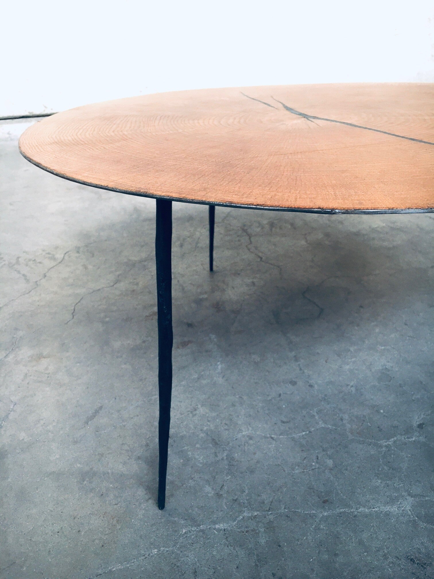 Modern Design slender metal frame with wood veneer top coffee table. 3 slender legs in hammered wrought iron steel. Beautiful sleek design. In very good condition. Measures 76cm x 75cm x 35,5cm.