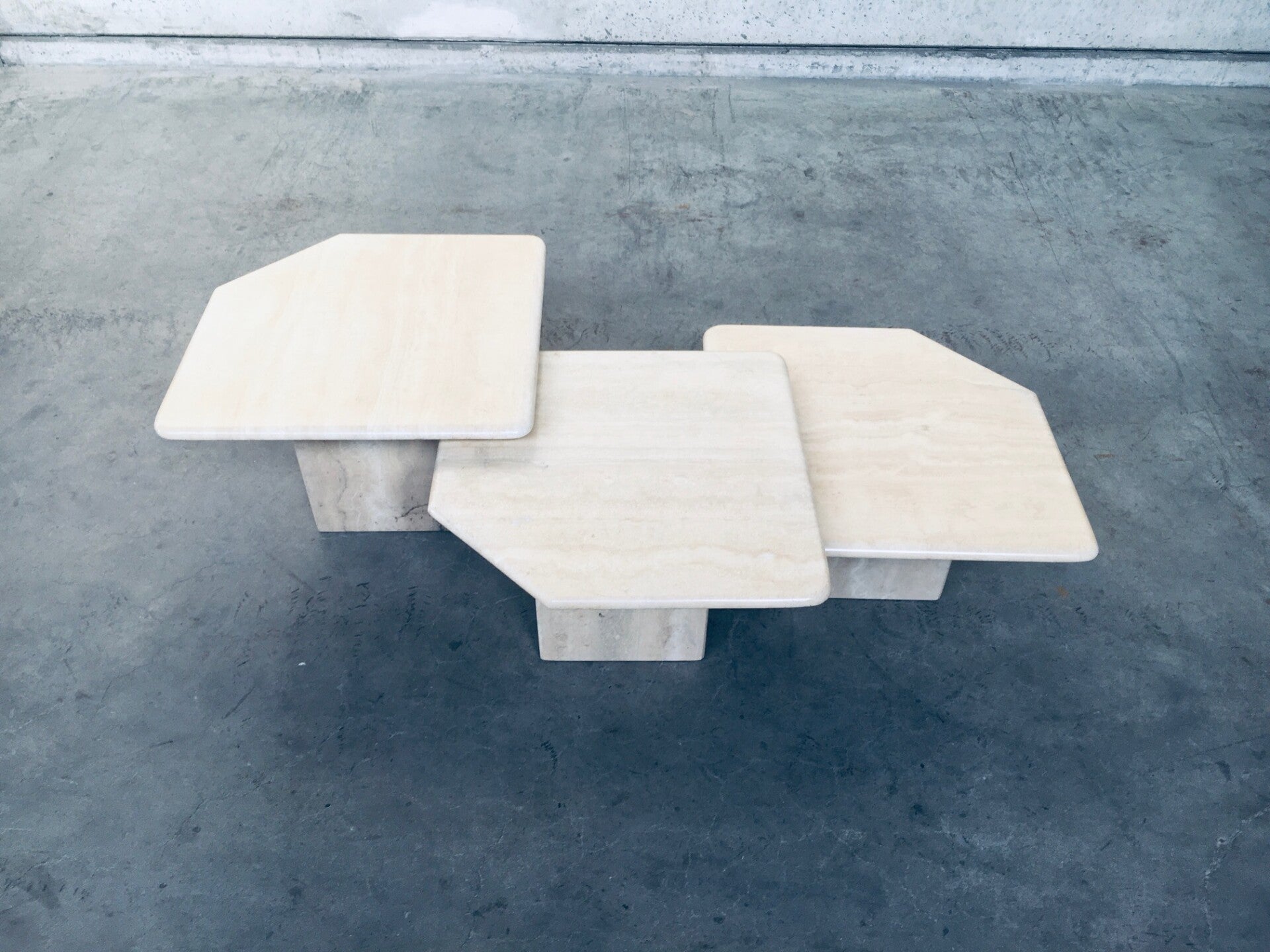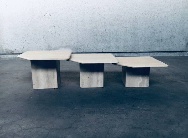 Vintage Midcentury Modern Italian Design set of 3 square Travertine Nesting Side Tables. Italy, 1970's. Cut corner model on square base. Travertine Marble in good condition. Minor chips on edges, which is common for their age and the softness of the travertine. Set consists of 3 side tables. Large: 61cm x 61cm x 41cm - medium: 61cm x 61cm x 35cm - small: 61cm x 61cm x 31cm.
