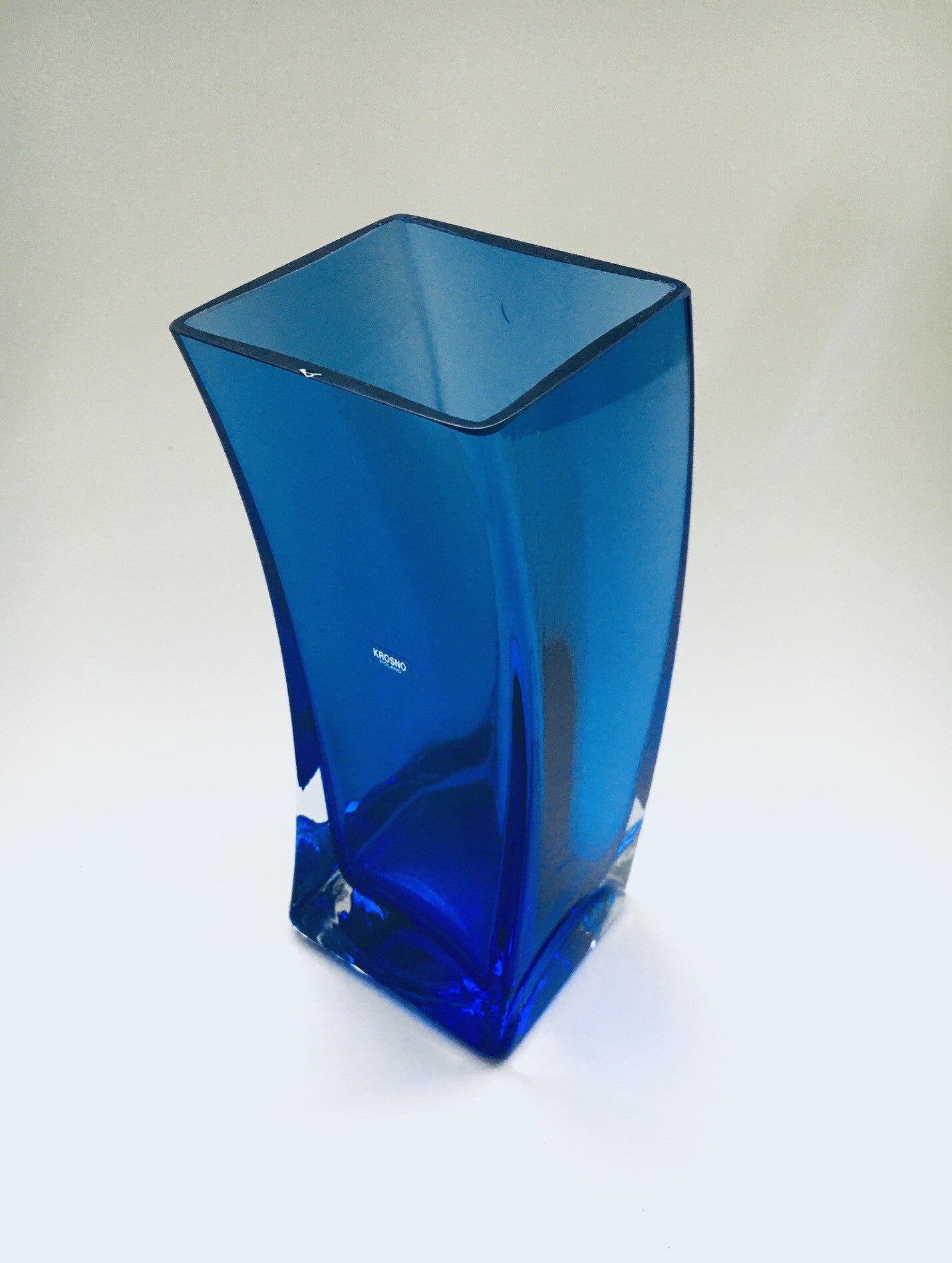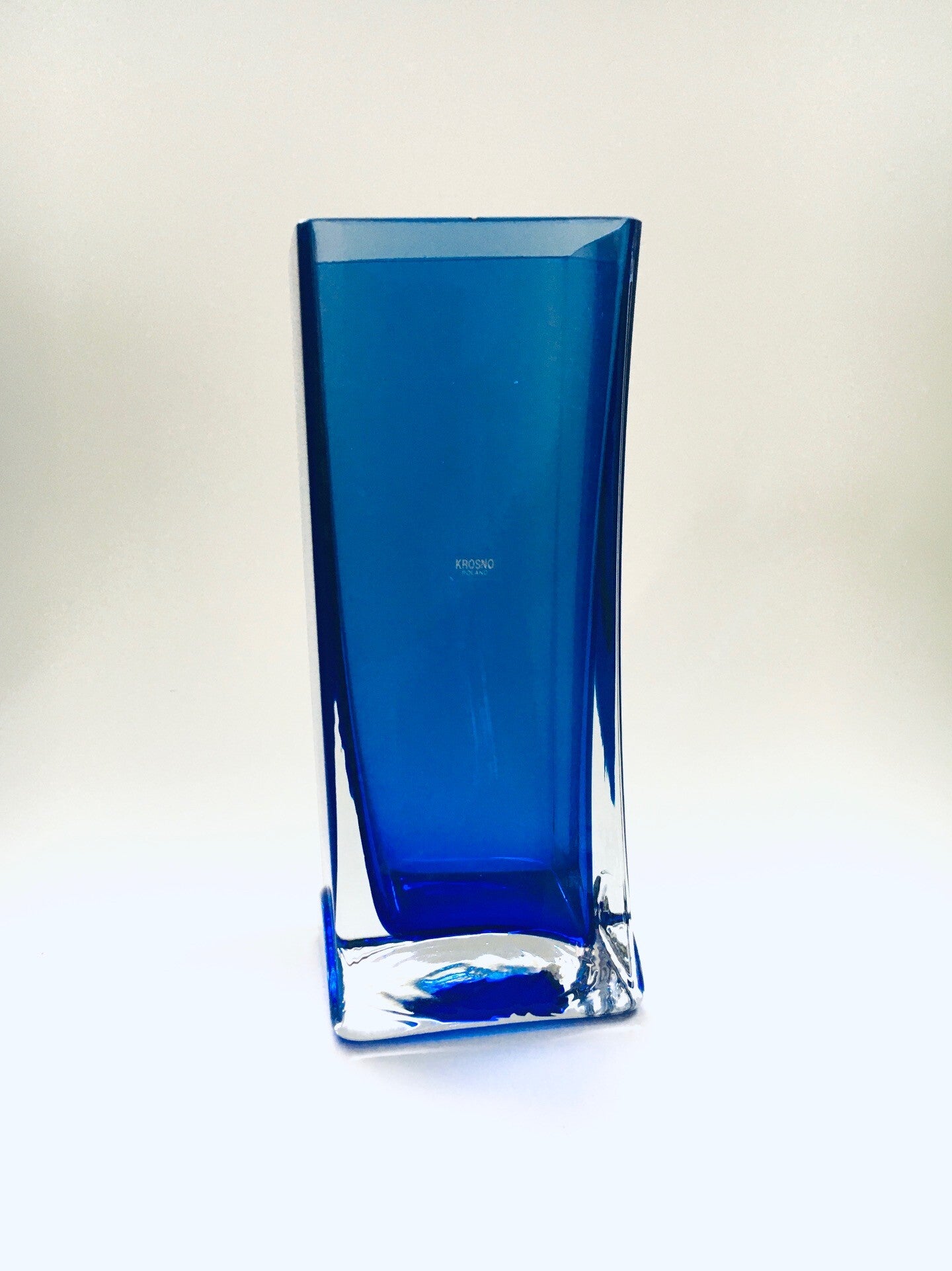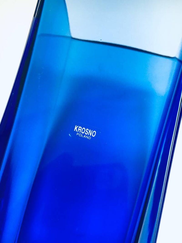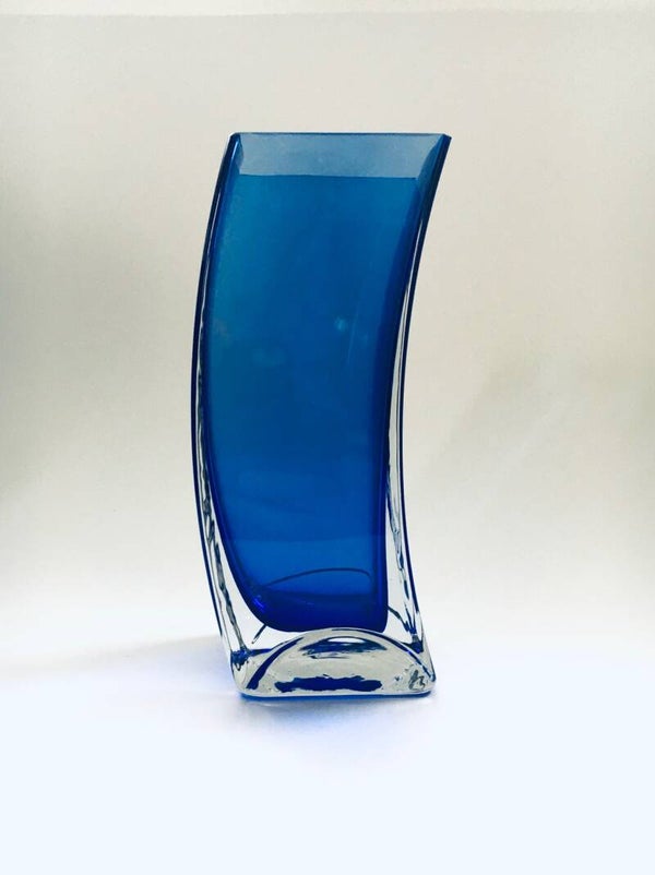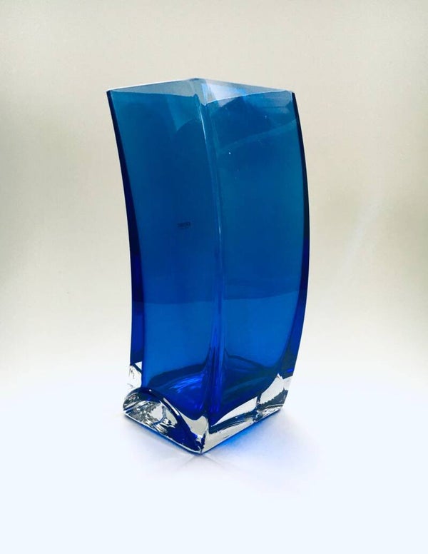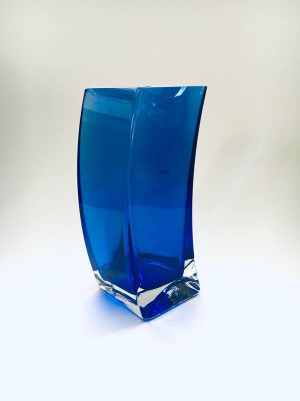 Vintage Postmodern Design Blue Art Glass Vase by Krosno, Poland 1980's. Slanted Bend blue glass in clear glass. In very good condition. One very small chip at the top border. 22,5cm x 10cm x 9cm.