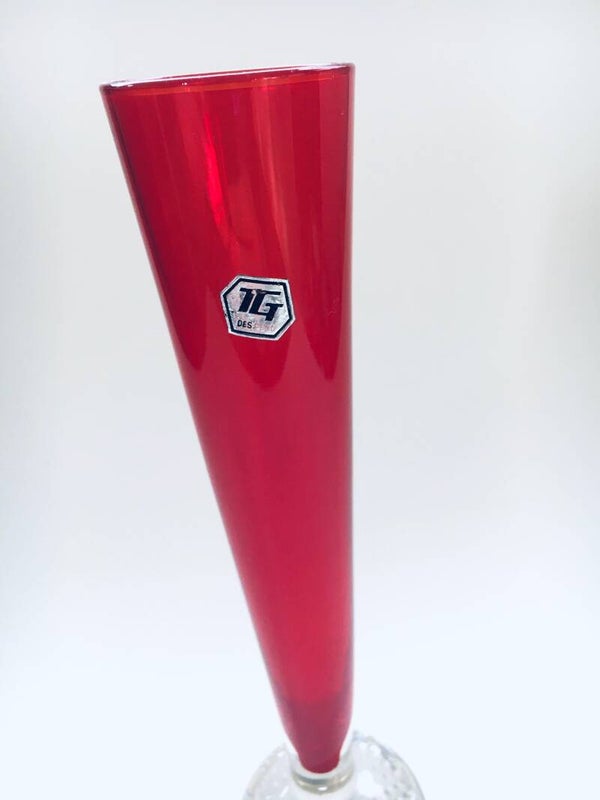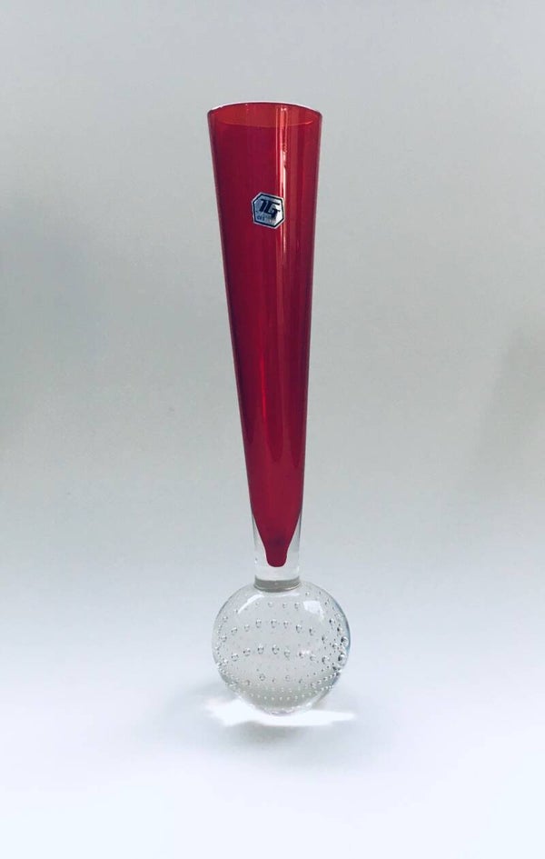 Vintage Midcentury Modern Design Art Glass Solefiore Flower Vase by TG, 1960's. Single flower red glass with clear glass bubbled ball foot. In perfect condition. 25,5cm x 6,5cm x 6,5cm.