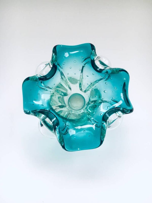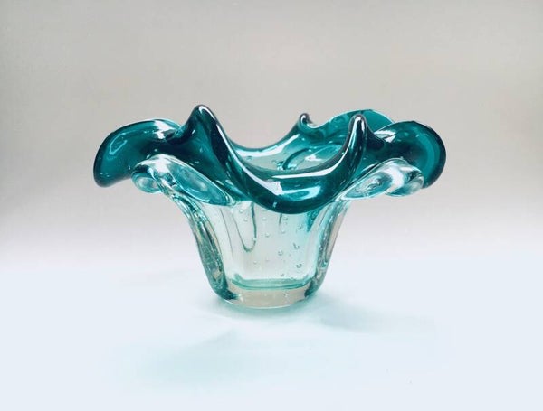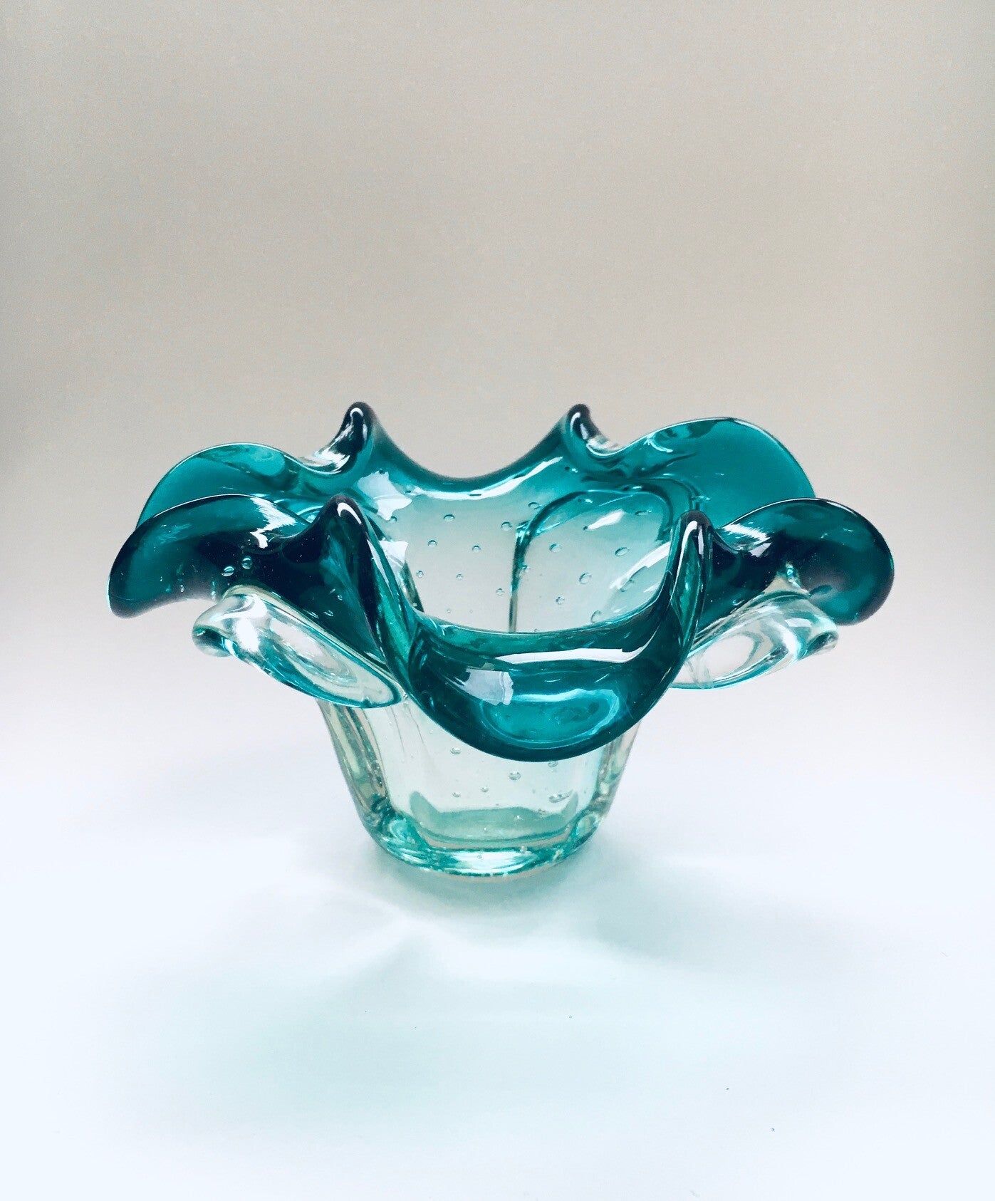Vintage Midcentury Modern Design Murano Glass green flower shell dish / Vide Poche. Made in Italy, Murano, 1960's. Handblown Art Glass piece. Bubbled glass. In very good condition. Measures 10,5cm x 17cm x 17cm.