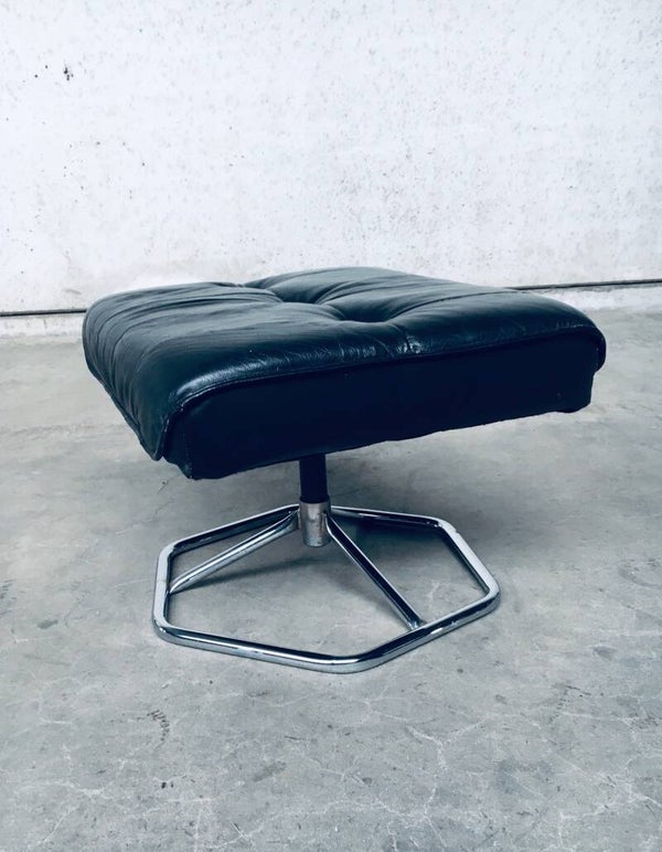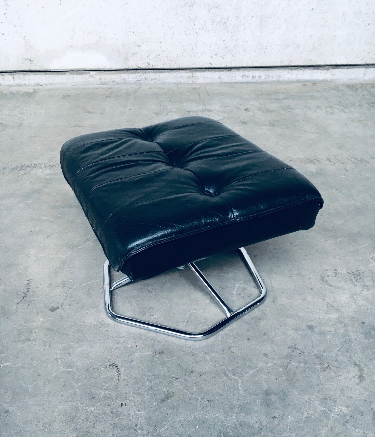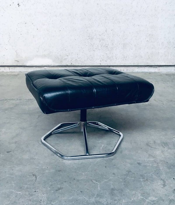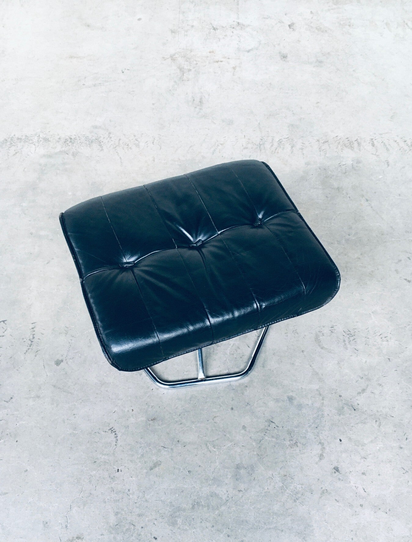 Vintage Midcentury Modern Design Hocker Stool in black leather, 1960's. Black leather with chrome tube frame swivel base. In very good condition. Measures 38cm x 59cm x 50cm.