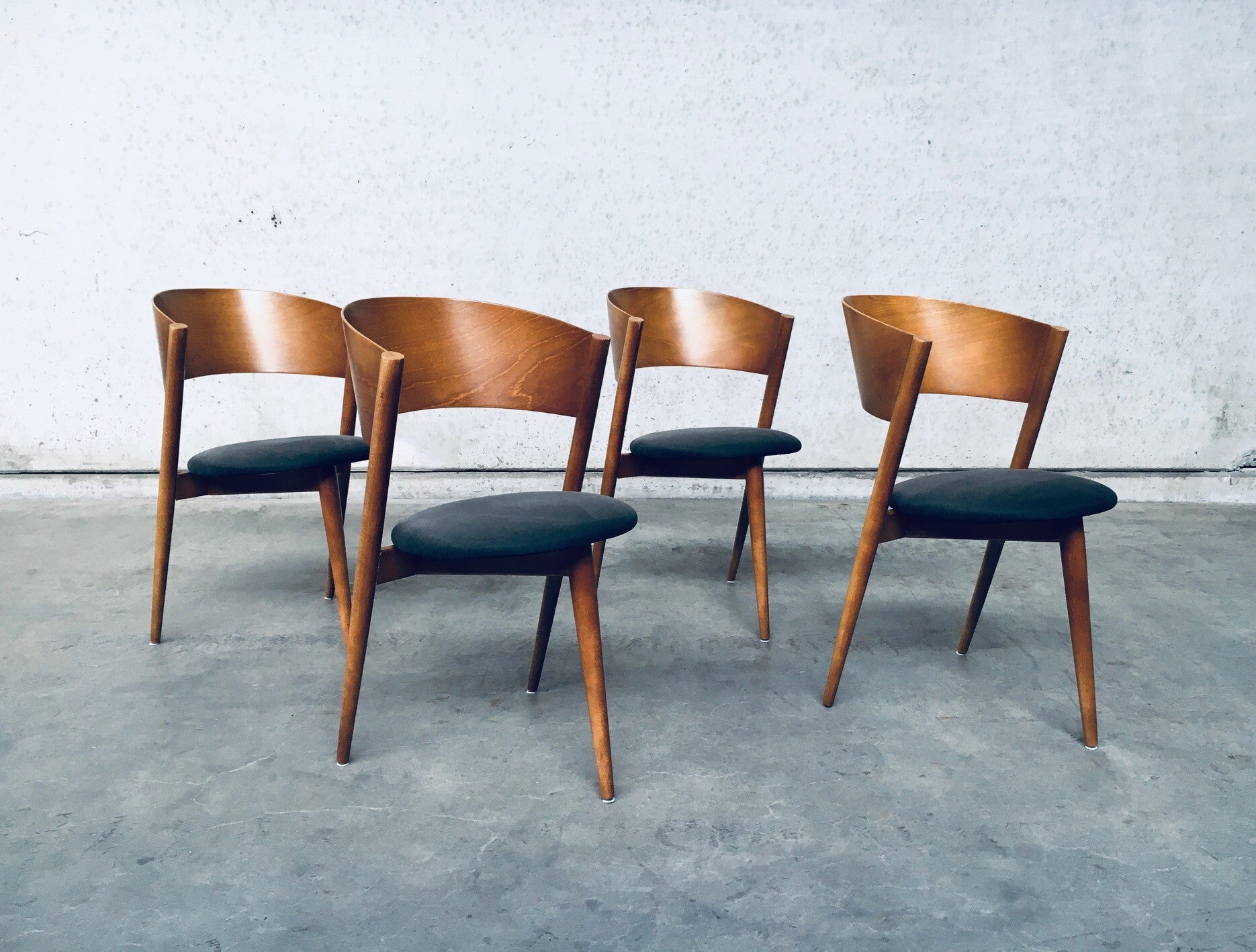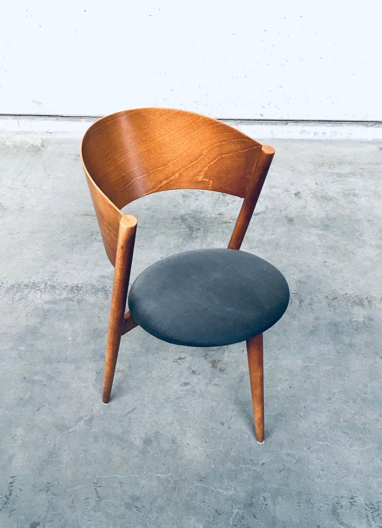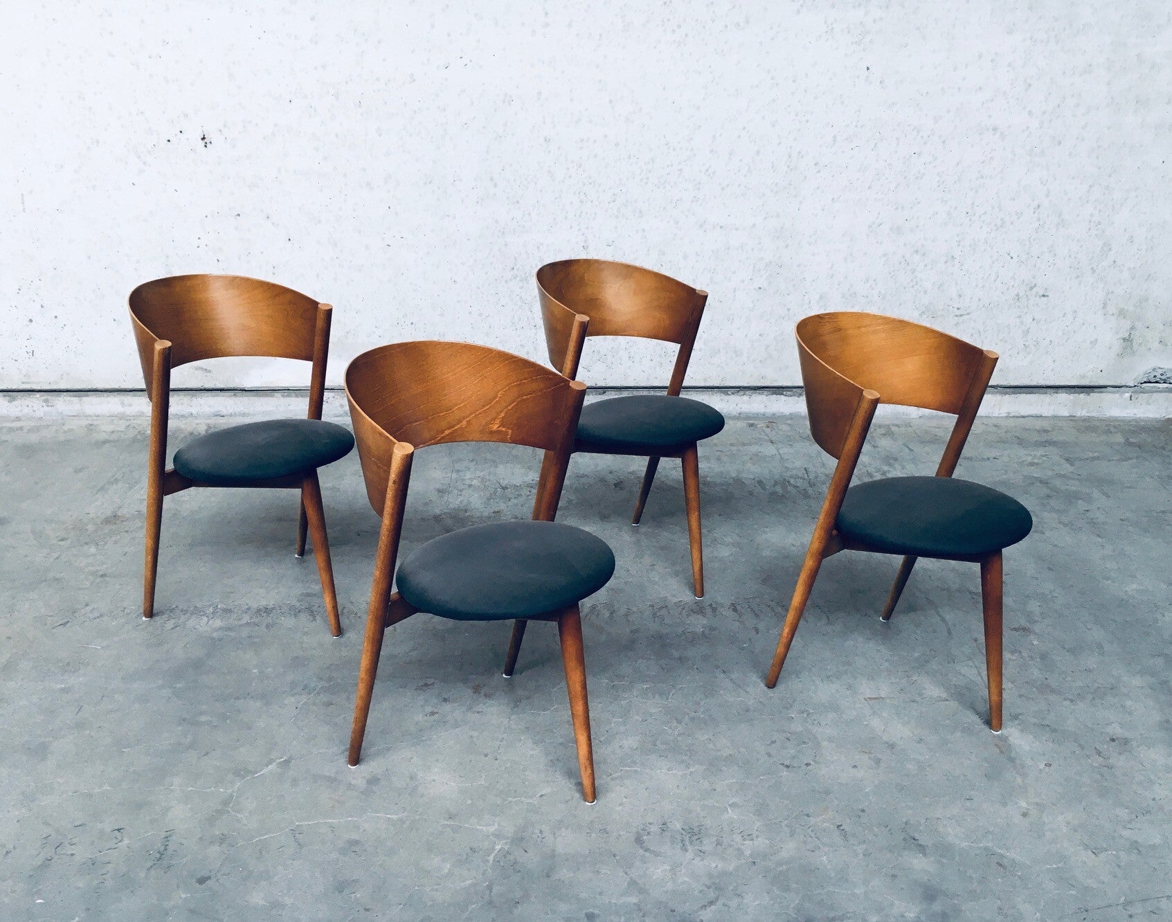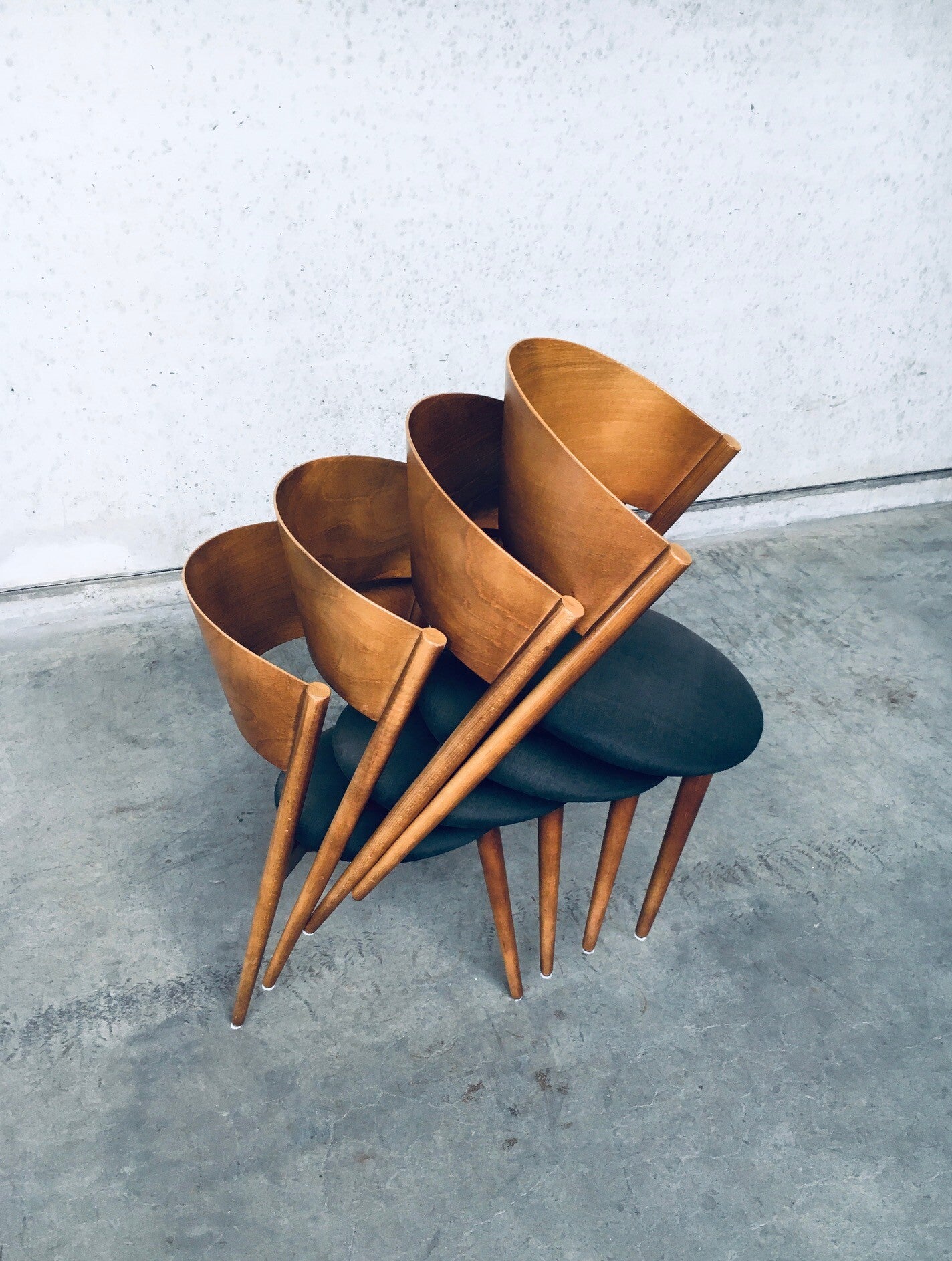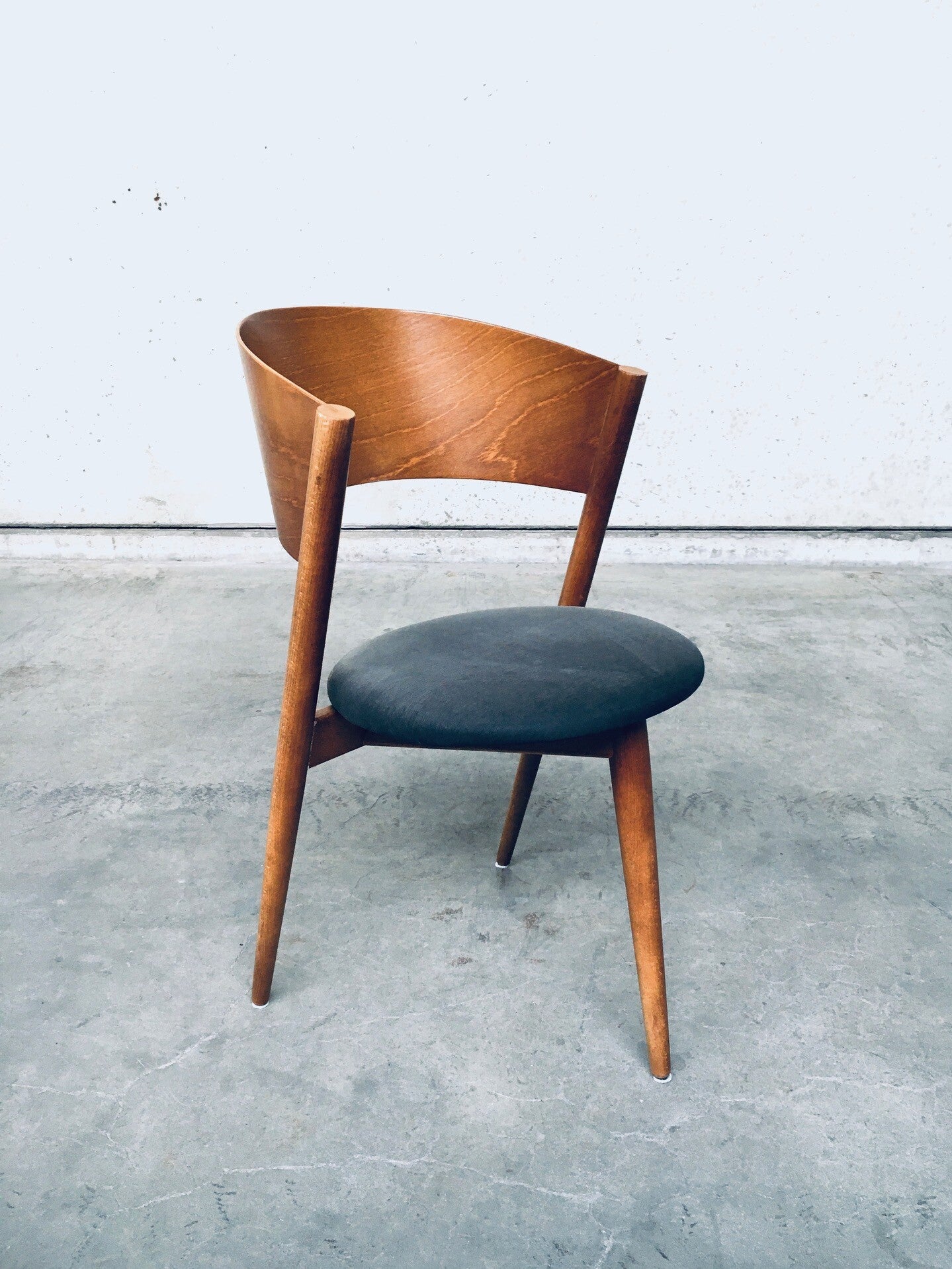 Vintage Midcentury Modern Spanish Design Tripod Chair set of 4 by MI, SLAE, Spain, 1960's. Bent wooden back with wooden frame and grey fabric covered seat. All 4 are in good condition. Each chair measures 80cm x 50cm x 50cm.