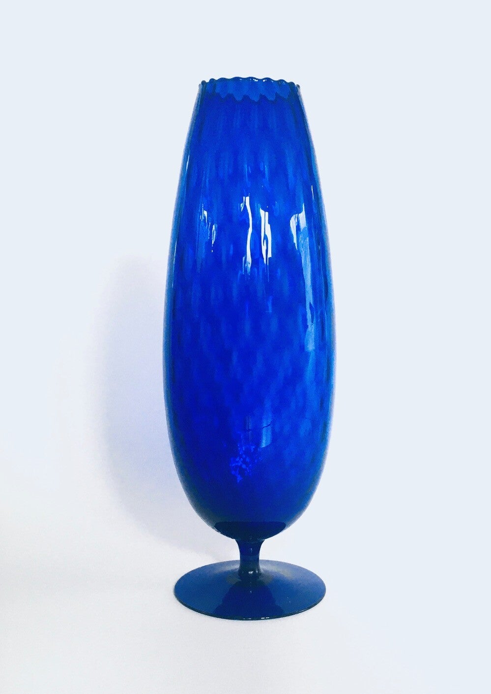 Vintage Midcentury Modern Italian Design large royal blue glass vase. Empoli, Murano, Italy 1960's. Beautiful handblown glass vase. In very good condition, 2 small chips on bottom of foot, not noticable when displayed. Measures 46cm x 15cm x 15cm.