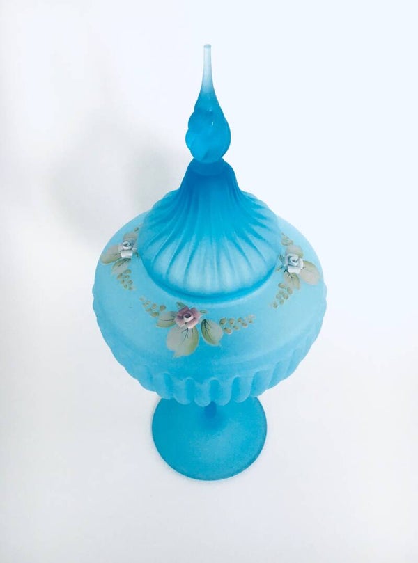 Vintage Antique handmade satin glass painted large cotton bowl / container / vase with lid. Made in Italy, 1930's or earlier. Beautifull blue satin glass with handpainted flower leafs and molded flowers on top. In very good condition, no damage. Measures 45cm x 19cm x 19cm.