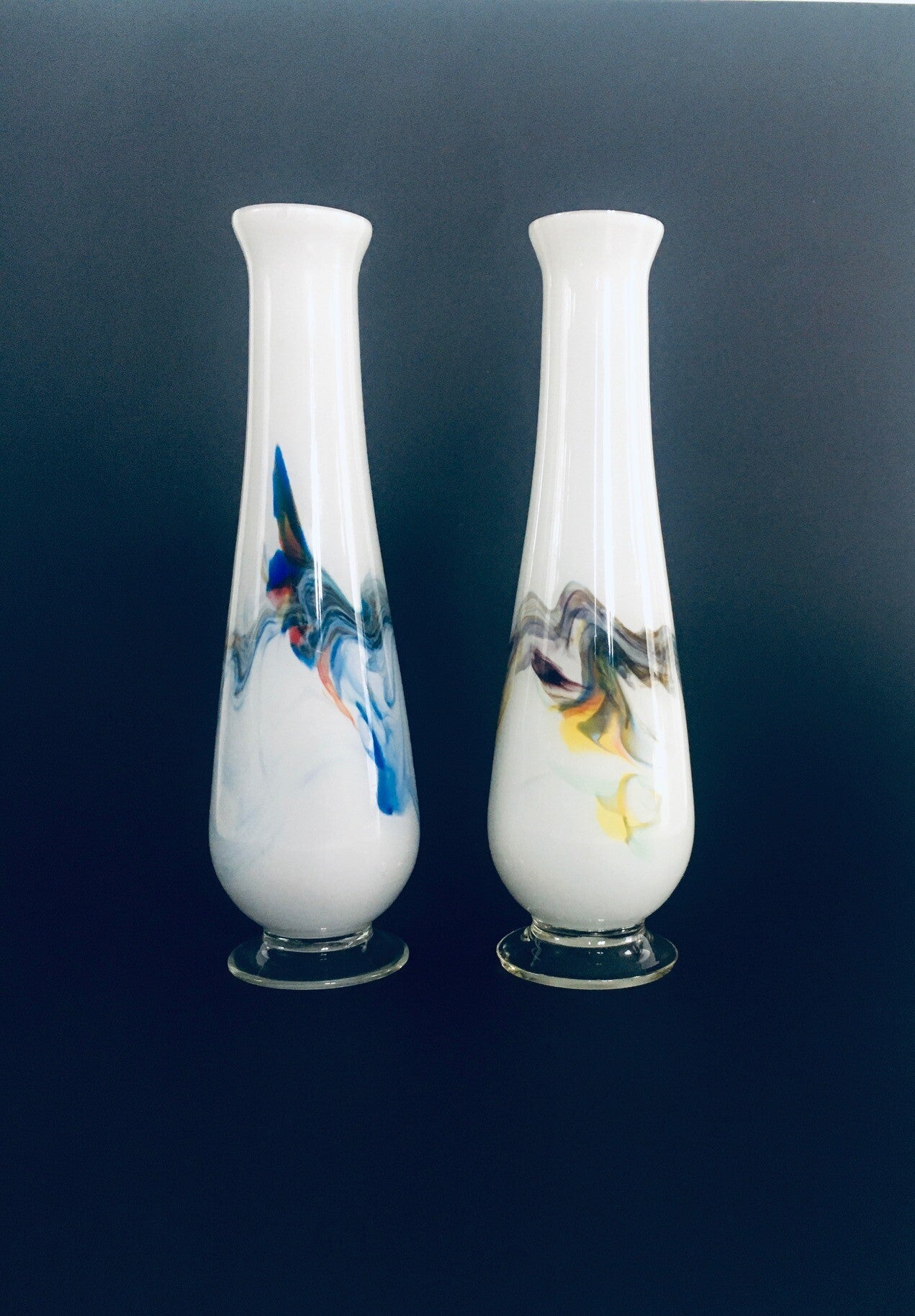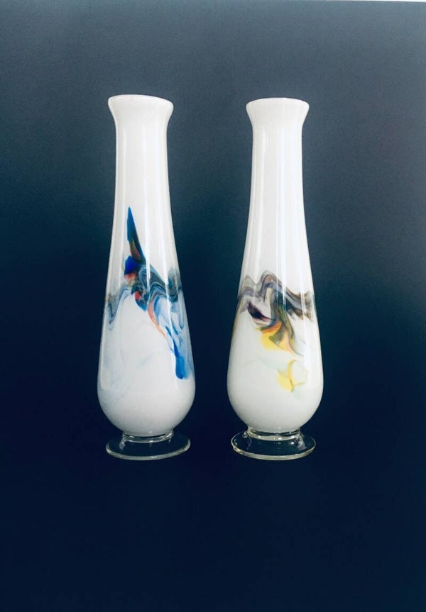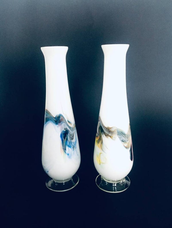 Vintage Midcentury Art Glass swirl multi colored vase set of 2. Made in Italy, Murano 1960's. Handblown clear glass with multicolored swirls under white interior color. One has more yellow brown colors, one more blue colors. Both are in very good condition. Each measures 28cm x 8cm x 8cm.