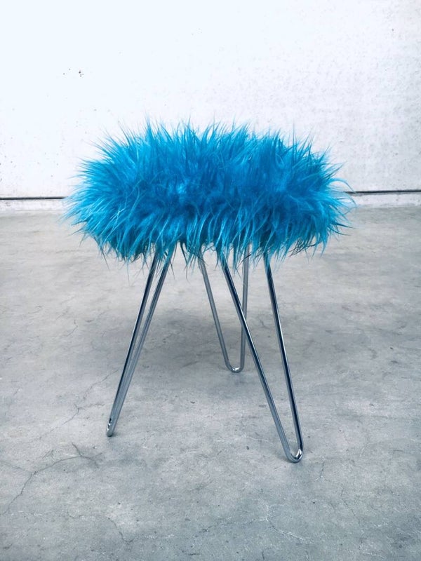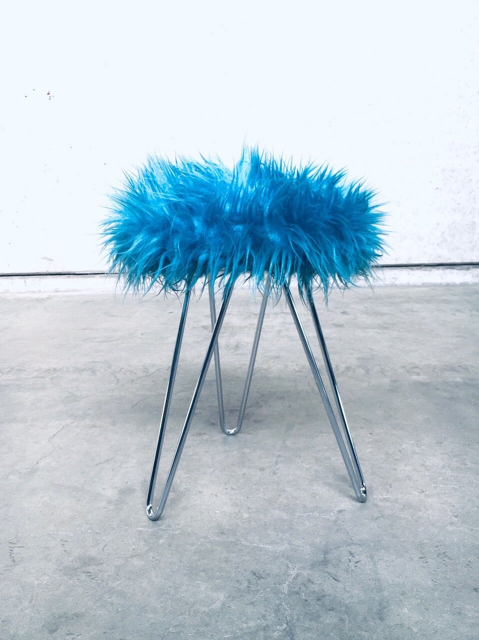 Vintage Midcentury Modern Design Funky Hairy Tripod Stool, Dressing Table Stool. Made in the 1960's, no markings. All original blue hairy fur with chrome plated tripod legs. In good condition. Measures about 47cm x 37cm x 37cm.