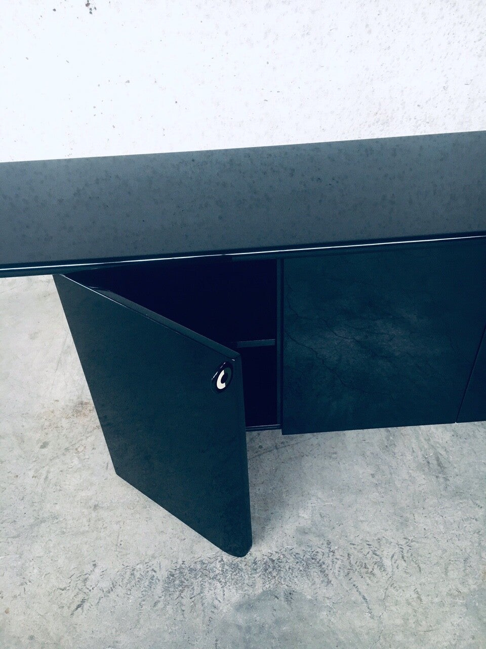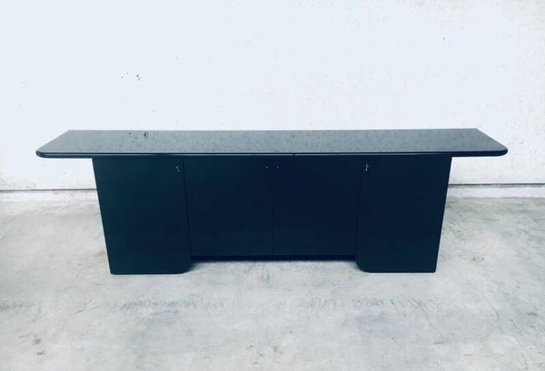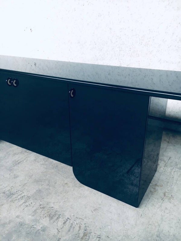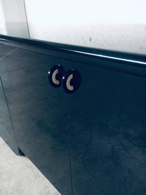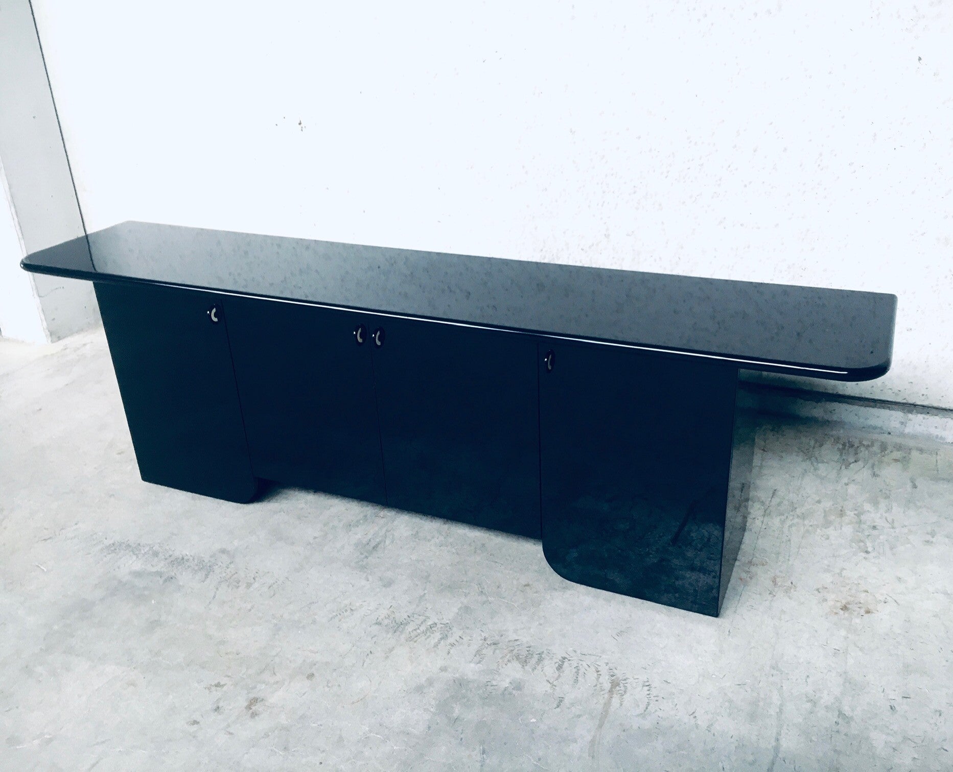 Vintage Postmodern Italian Design Credenza Lowboard Sideboard by Luigi Saccardo for Gasparello, Italy 1980's. From the "Seven" series. Memphis Style. In Black high gloss laquered hard wood. High quality Buffet Chest. In very good condition. Measures 76cm x 250cm x 50cm