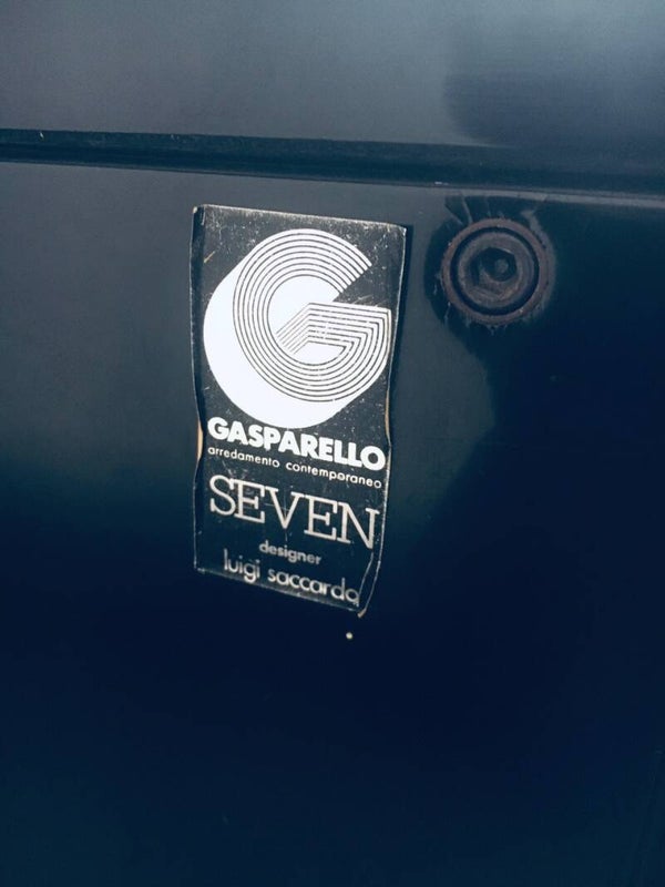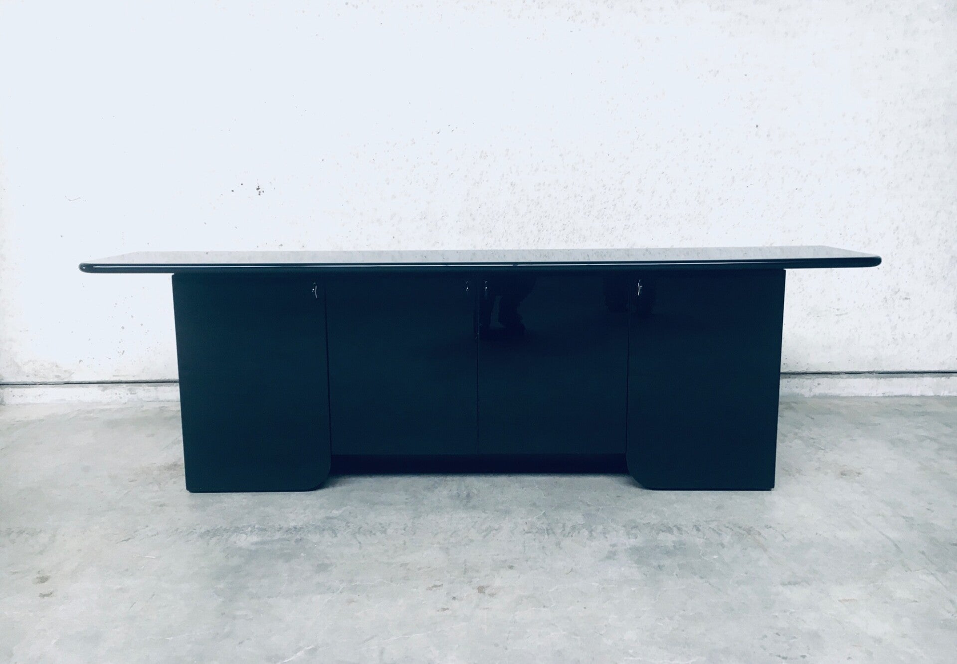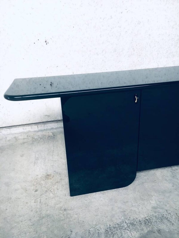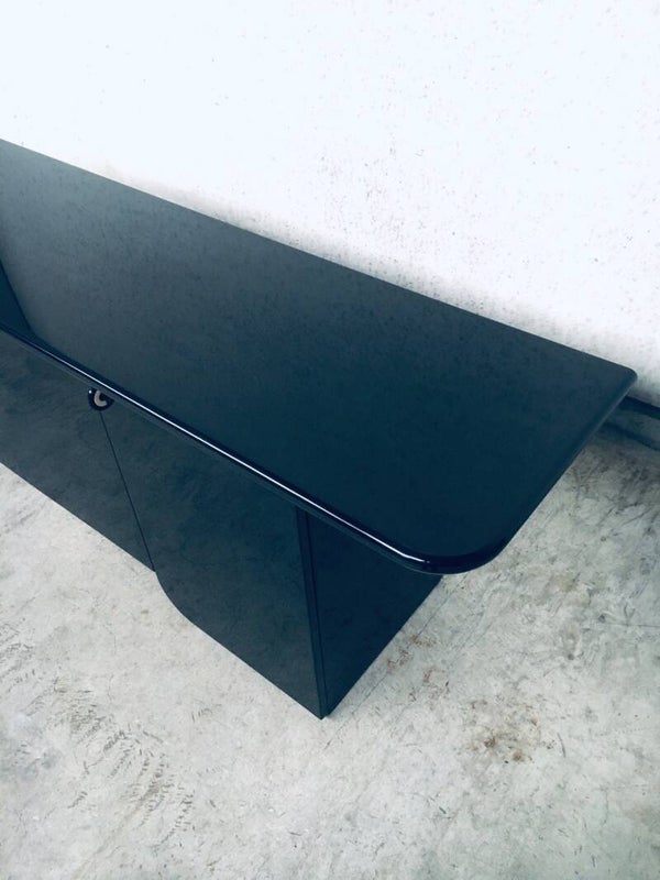 Vintage Postmodern Italian Design Credenza Lowboard Sideboard by Luigi Saccardo for Gasparello, Italy 1980's. From the "Seven" series. Memphis Style. In Black high gloss laquered hard wood. High quality Buffet Chest. In very good condition. Measures 76cm x 250cm x 50cm