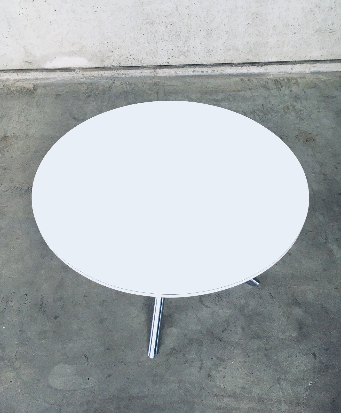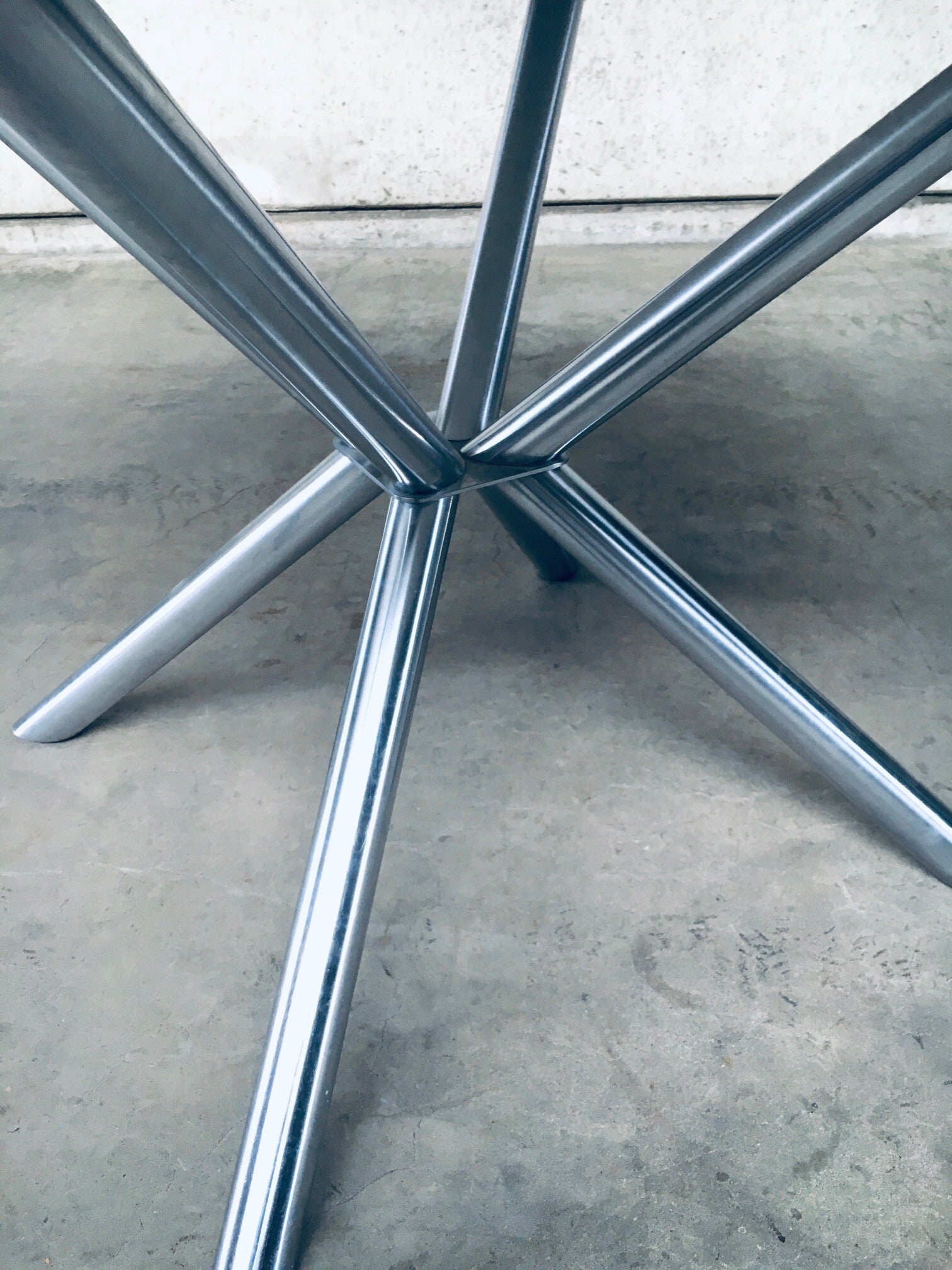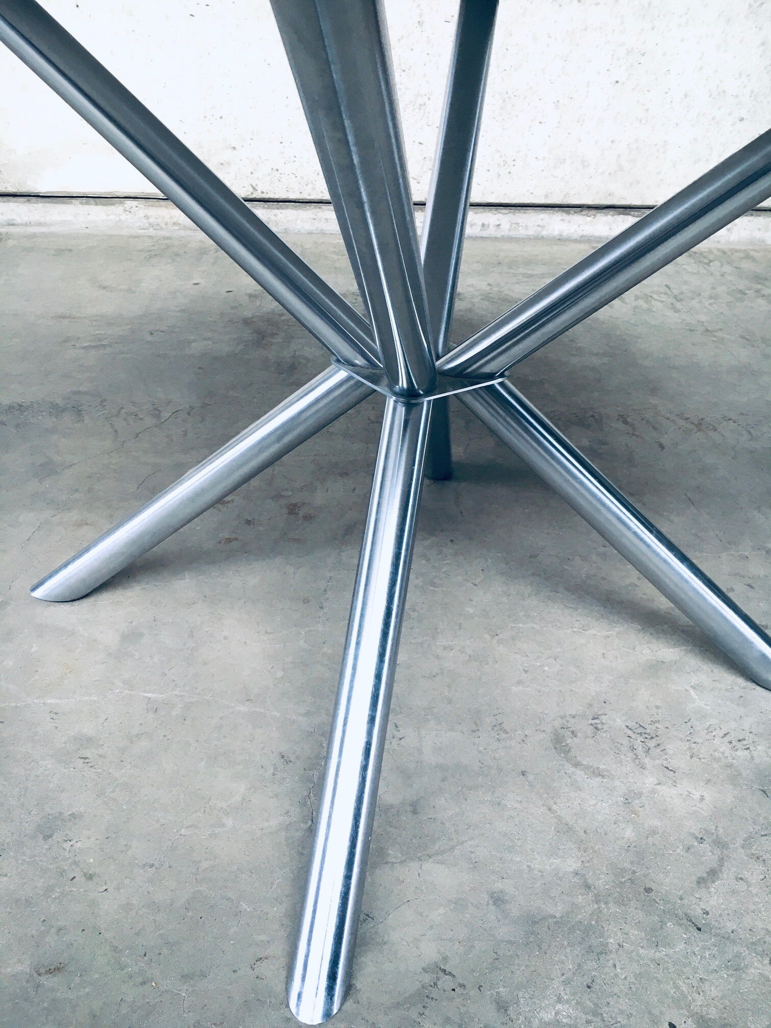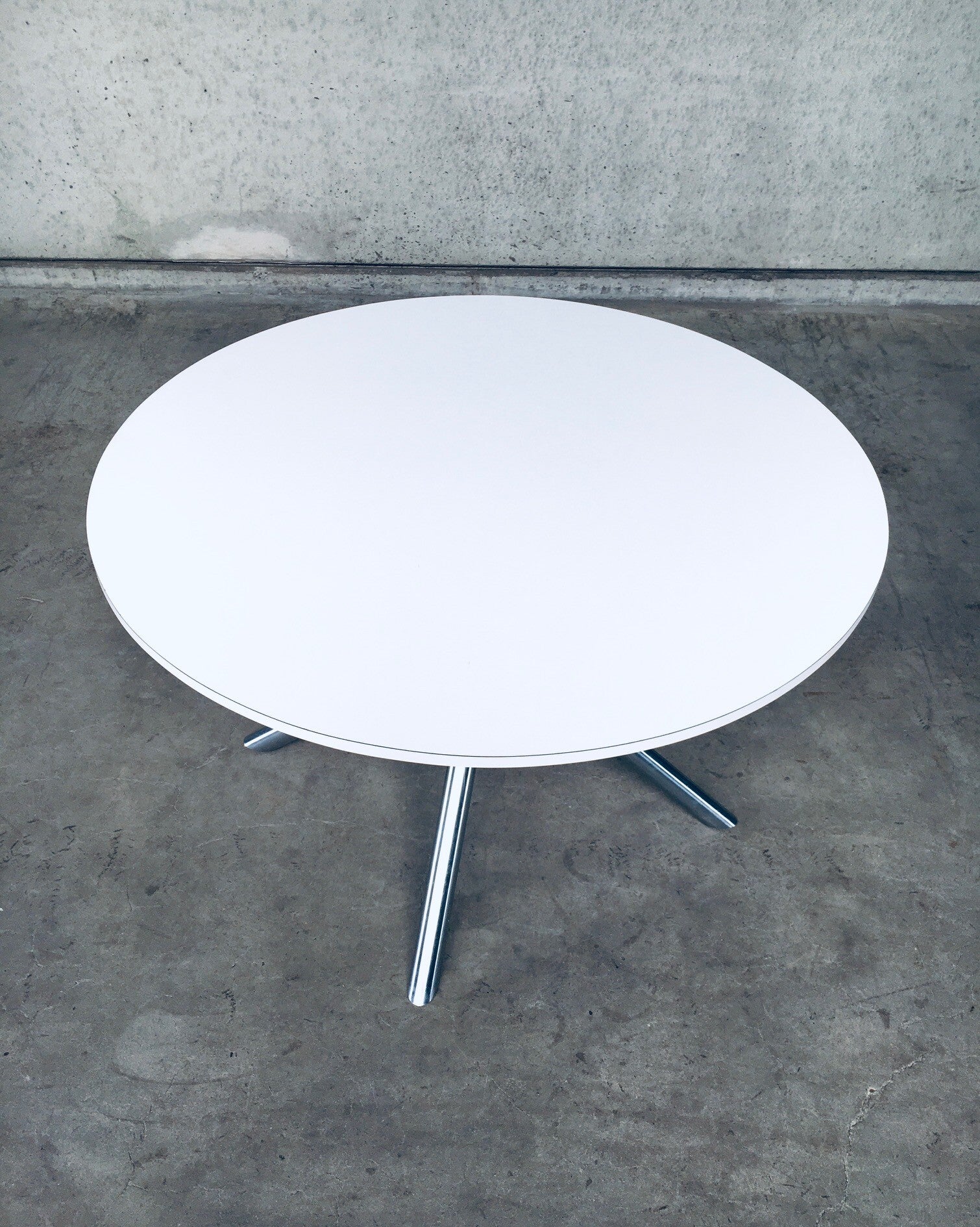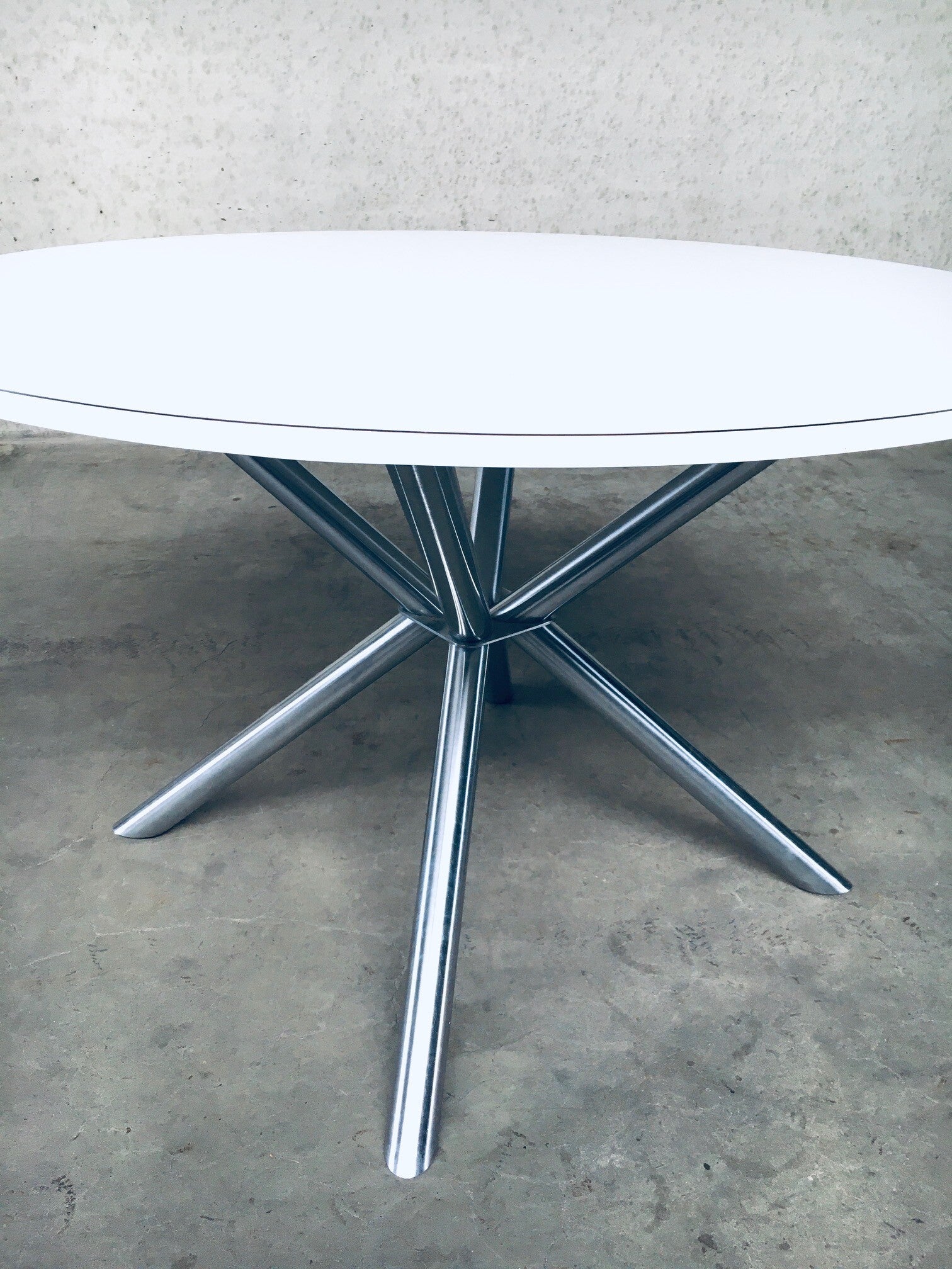 Post Modern Italian Design X Frame round dining table. Made in Italy, 1990's, no brand markings. White laminated top with brushed aluminum X base. In very good condition. Measures 120cm x 120cm x 74cm.