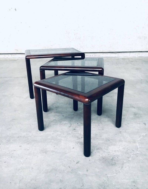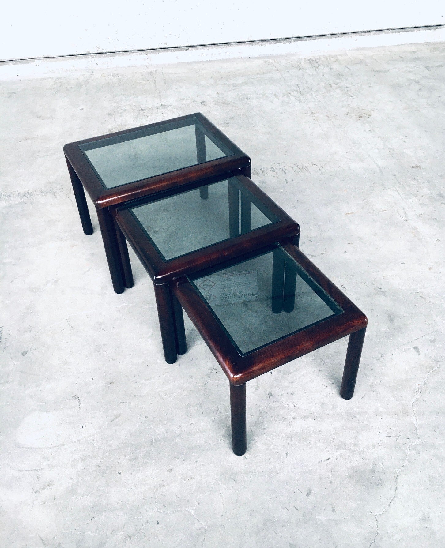 Vintage Midcentury Modern Design set of 3 Walnut Nesting Tables, made in the 1970's. No brand or maker markings. Walnut wooden frame with grey fumé glass top on each side table. Nice round legs which can be removed. They are all in very good condition. Sizes: S: 40,5 x 43,5 x 35,5cm / M: 48,5 x 43,5 x 39,5cm / L: 57,5 x 43,5 x 43,5cm.
