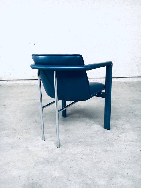 Postmodern Design Leather Dining Chair set of 4. Model "Cachucha" by Hugo De Ruiter for Leolux, Netherlands 1990's. Blue leather chairs with chrome back legs. They are all in vintage condition, used with leather color worn on arm rests and seats. Nice patina on all chairs. Each chair measures 72cm x 62cm x 60cm.