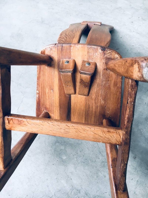 Vintage Brutalist Design set of 4 Oak High Back Dining Chairs by Kunstmeubelen De Puydt, Belgium 1960's. All solid oak wood artisan made chairs. These come in overall very good condition. Some have some repairs made to them, see pictures. Sturdy heavy chairs. These are rather rare, as they were made in small numbers and only sold in Belgium. Each chair measures 112cm x 50cm x 42cm.