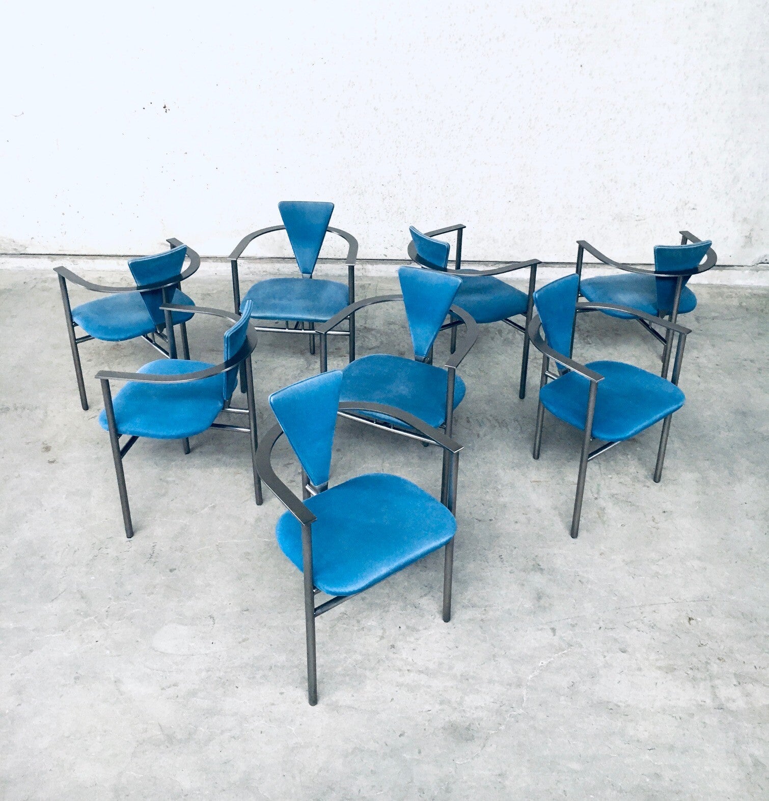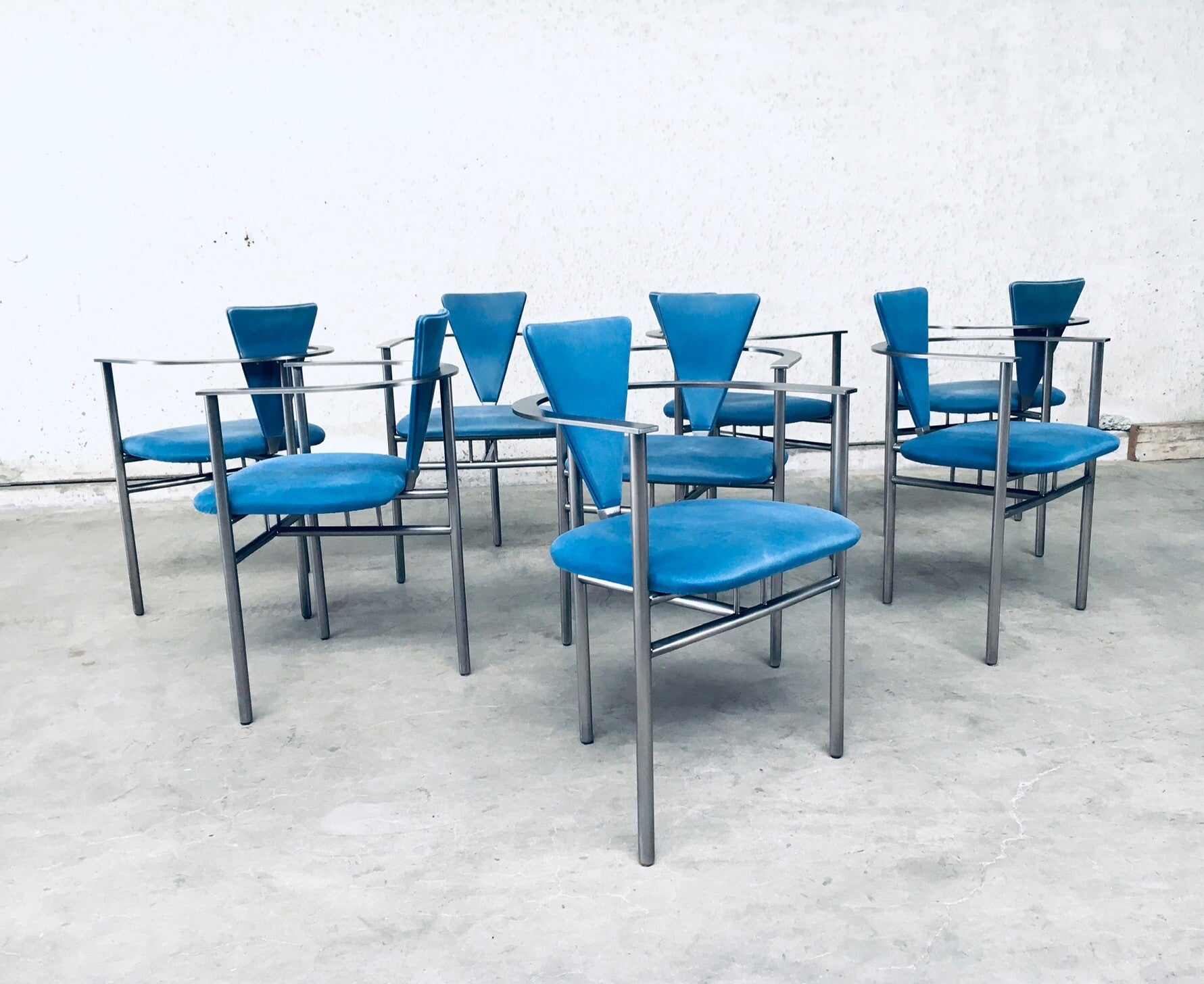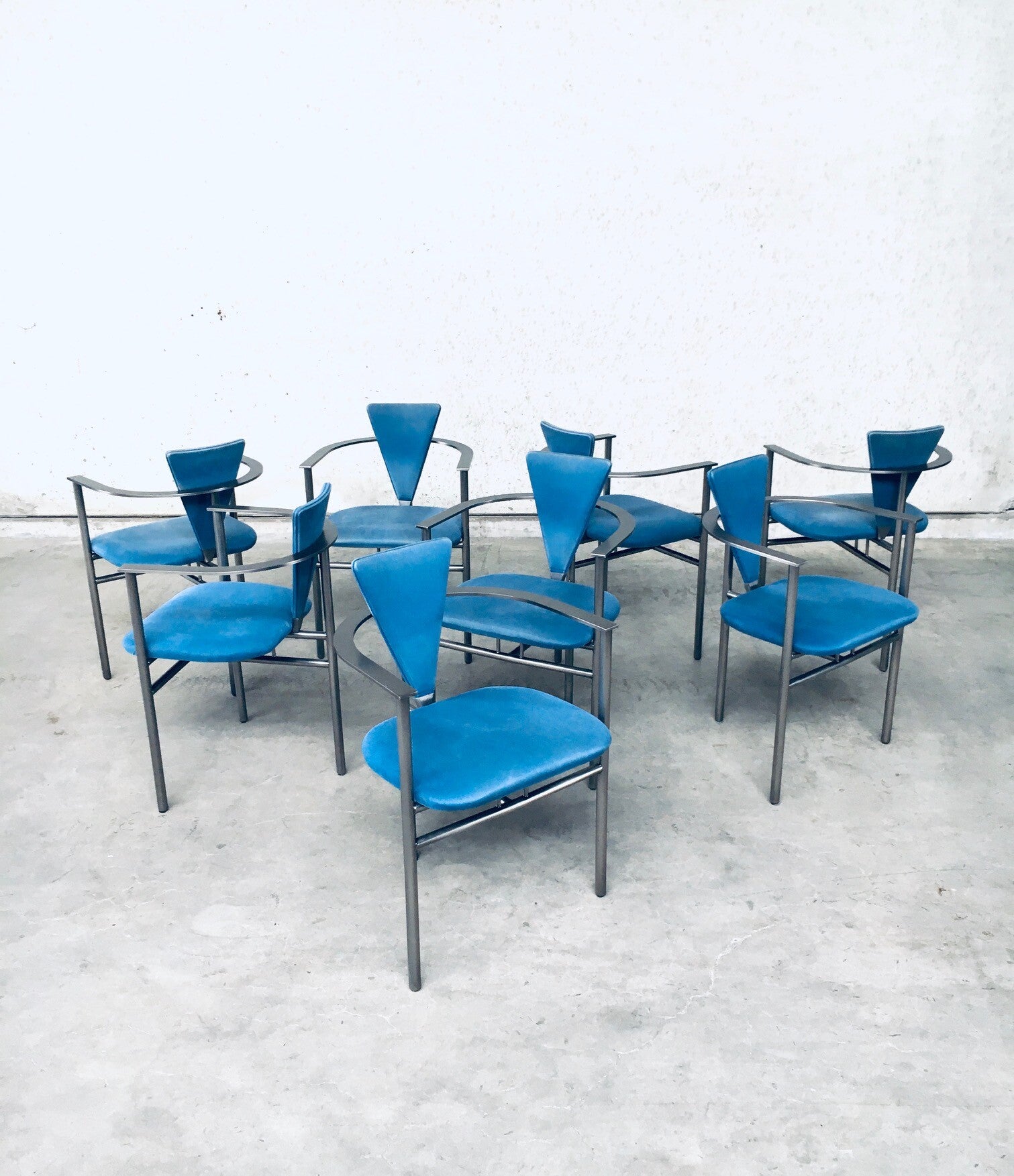 Vintage Postmodern Belgian Design set of 8 Dining Chairs by Belgo Chrom, Belgium 1980's. Brushed metal frame with blue fabric seat and back. These all come in very good condition. The fabric has some worn spots on some chairs, one has a torn spot on the front seat area, which reflects the age of the chairs. Each chair measures 80cm x 54cm x 50cm.