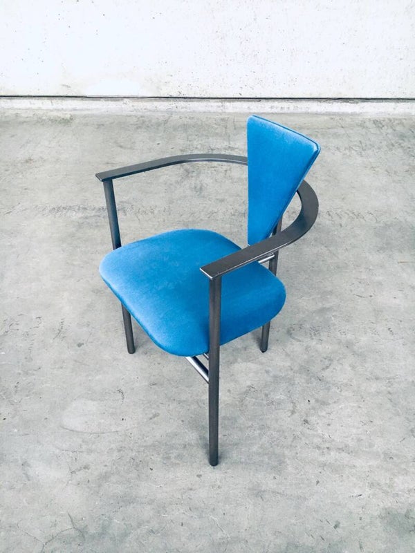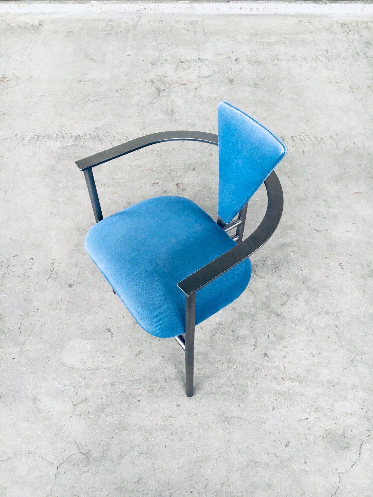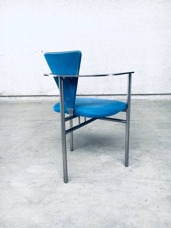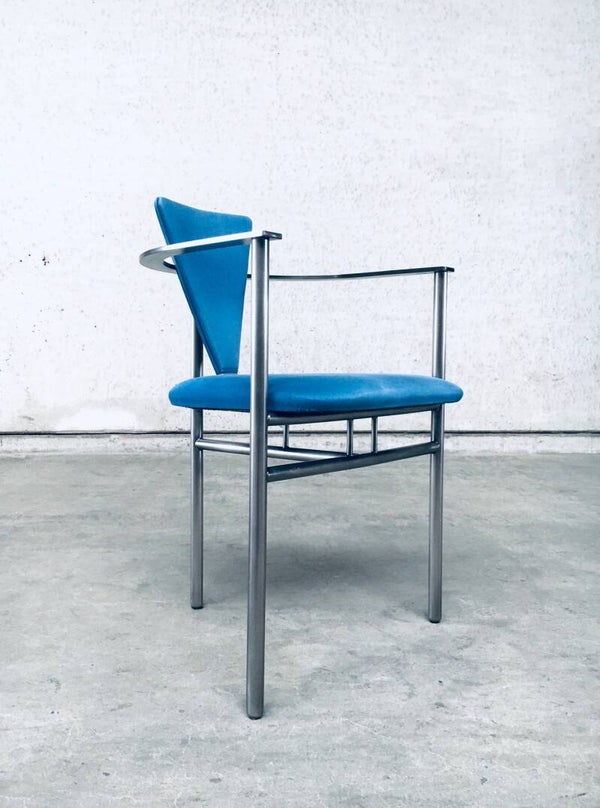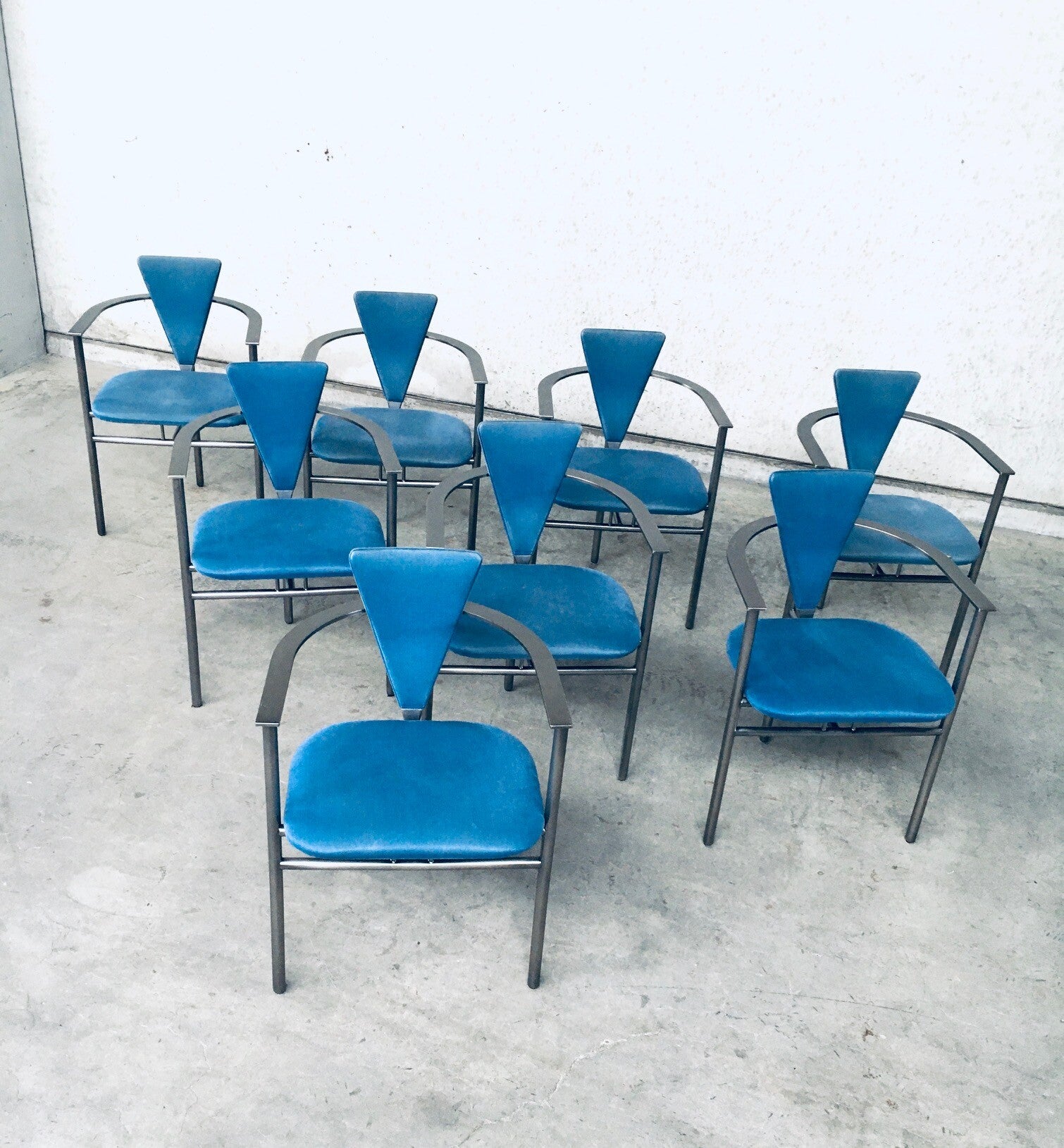 Vintage Postmodern Belgian Design set of 8 Dining Chairs by Belgo Chrom, Belgium 1980's. Brushed metal frame with blue fabric seat and back. These all come in very good condition. The fabric has some worn spots on some chairs, one has a torn spot on the front seat area, which reflects the age of the chairs. Each chair measures 80cm x 54cm x 50cm.