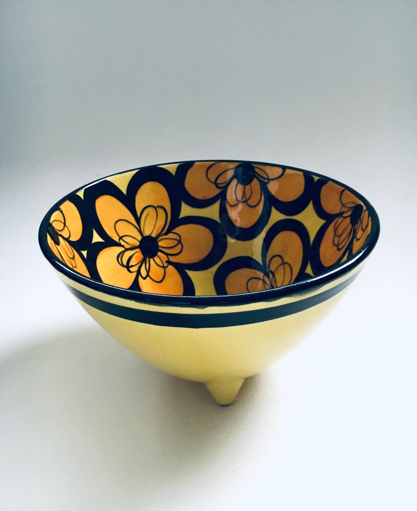 Vintage Midcentury Modern Design Art Ceramic Fruit Bowl by SMF Schramberg, Bavaria, Germany 1960's. Yellow, orange and black glazed bowl. Handpainted with flowers. In very good condition. Measures 10,5cm x 18cm x 18cm.
