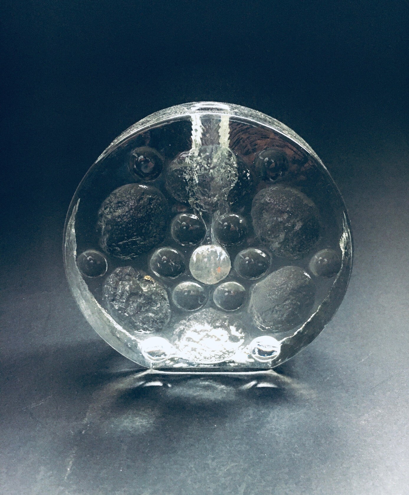 Vintage Midcentury Modern Design Art Glass Soliflore Vase by Walther Glas, Germany 1960's. Pressed round glass with structured rock shapes. In very good condition. Measures 11cm x 11,5cm x 3,2cm.