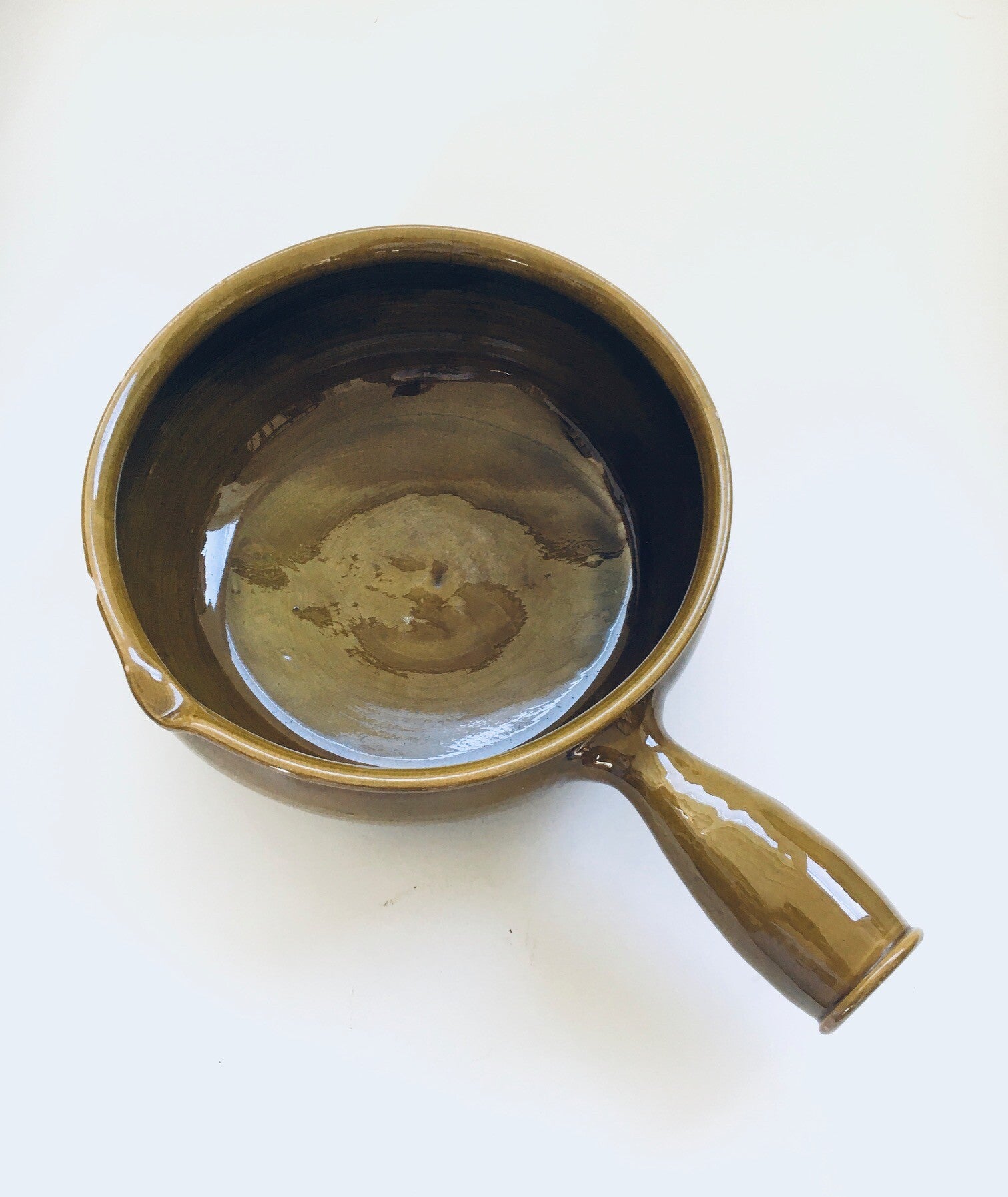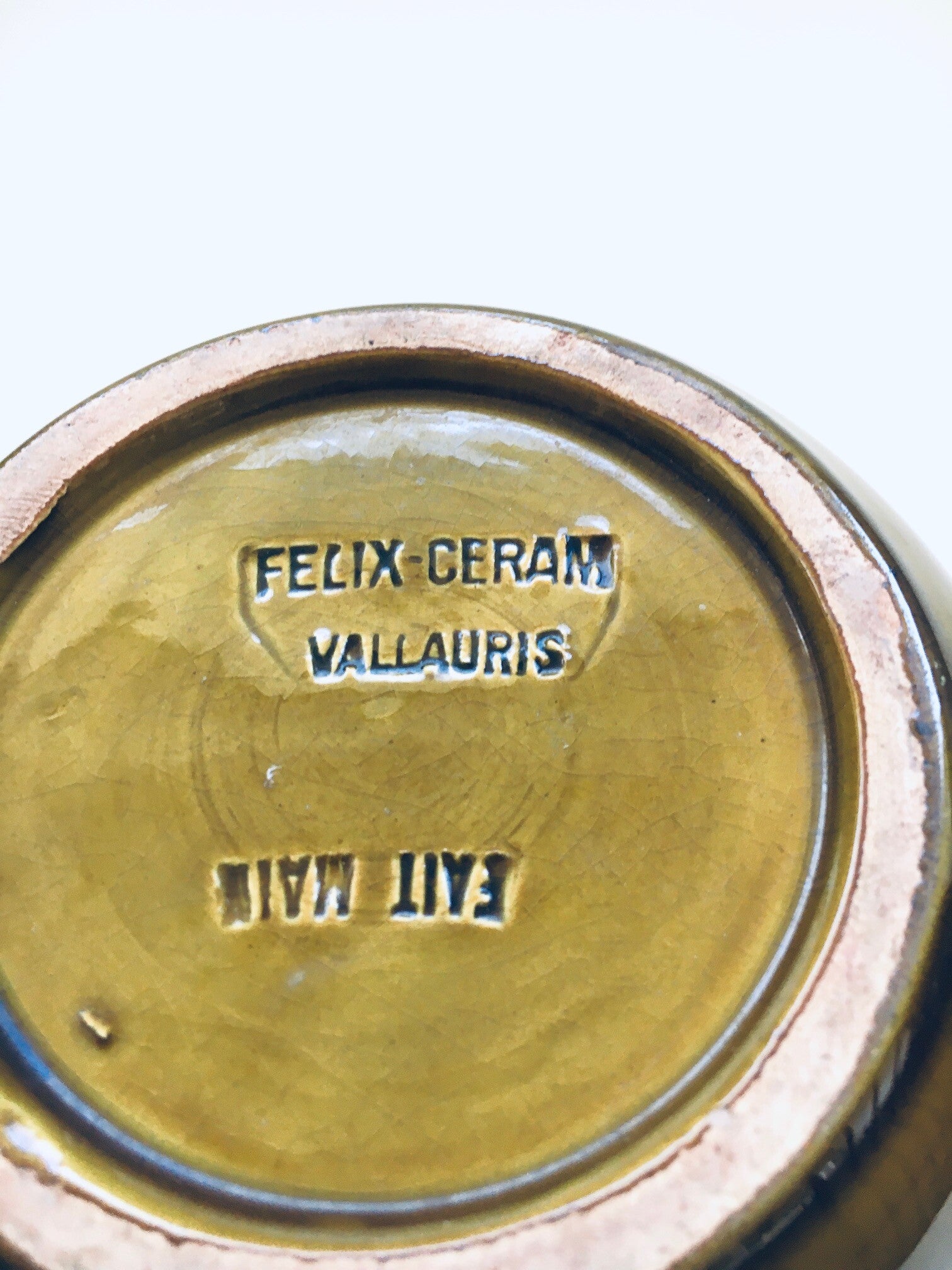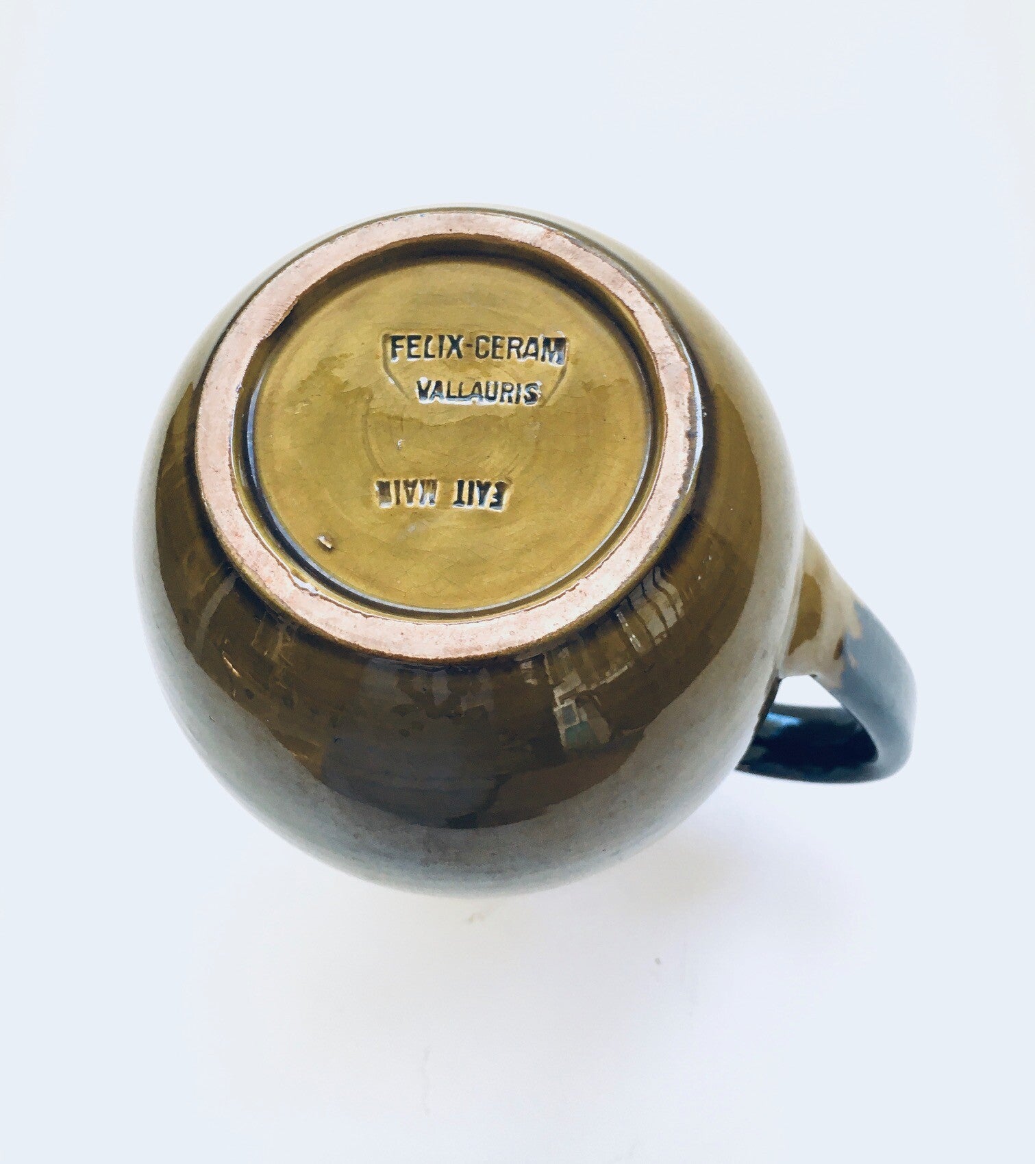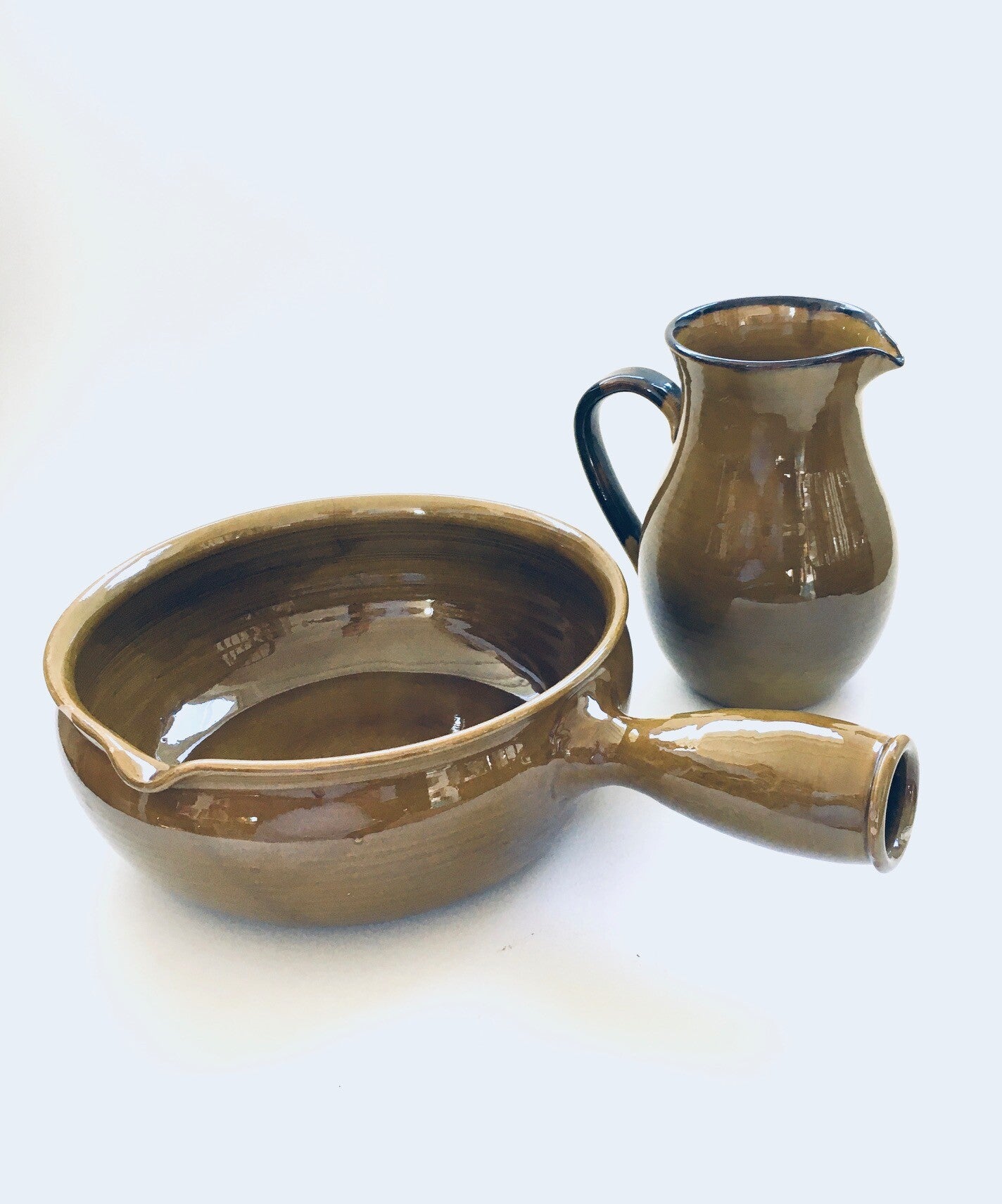 Vintage Art Pottery Bowl and Decanter by Felix-Ceram for Vallauris, France 1960's. Handmade art pottery. Olive color glazed. Both are in good overall condition, with some minor chips. See pictures. Bowl measures 37cm x 26cm x 10,5cm. Decanter measures 19,5cm x 17cm x 13cm.
