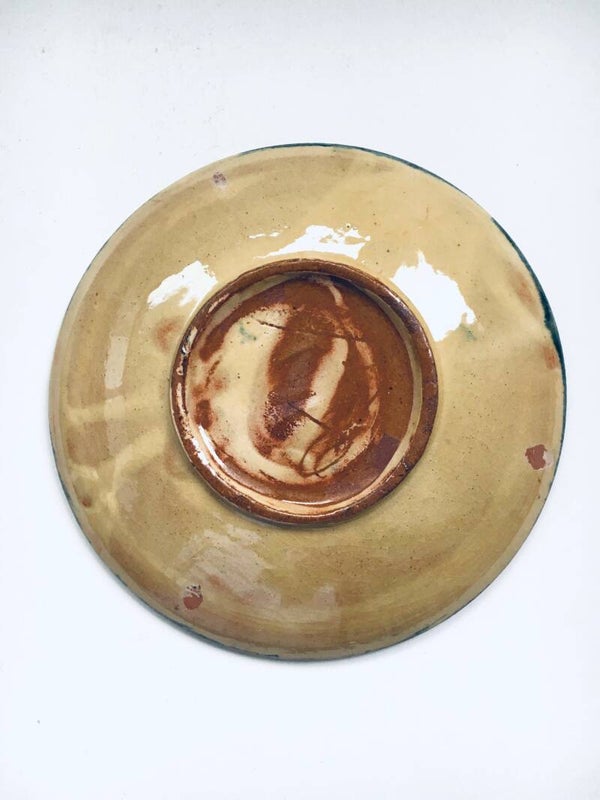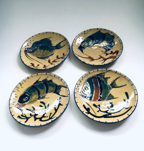 Vintage Studio Art Pottery handpainted glazed Fish Plate set of 4, made in France 1960's. In the style of Vallauris pottery. No markings. All plates are in very good condition. Each plate measures 16,5cm x 16,5cm x 2,5cm.